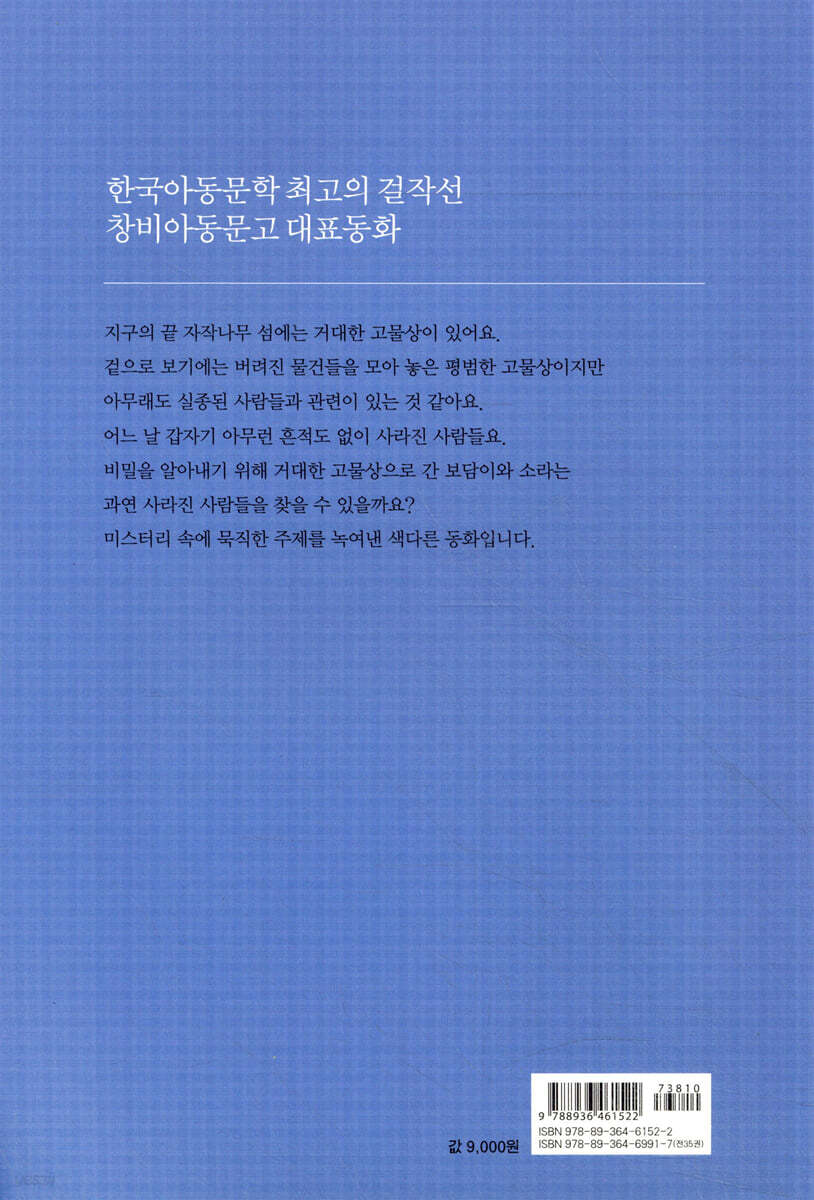 2. 보담이와 소라 3. 바다 마녀가 살던 곳 4. 환영회 5. 실종자들 6. 거대한 고물상 견학 7. 화장품 냉장고 8. 출입 제한 구역 9. 사물과 교감하는 사람들 10. 미스터리 방송사 11. 돌아온 보담이 12. 인구 조사 13. 검은 옷 사내의 방문 14. 모두 알게 되다 15. 마지막 글자를 찾아서 16. 태양과 달이 하나가 되는 시간 17. 인간을 꿈꾼 바다 마녀 작가의 말_어린이 친구들과 처음 만나면서…… |