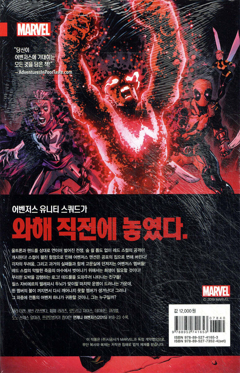 - AdventuresInPoorTaste.com "더갠의 대본은 유머와 공포와 슈퍼히어로 액션을 최적의 비율로 배합하고 있다" - IGN.com 올뉴 올디퍼런트 마블(All-New, All-Different Marvel)! 조나단 힉맨의 「어벤저스」와 「타임 런즈 아웃」에서 평행 우주의 지구들이 부딪쳐 종말을 맞는 중첩 현상이 발생하고, 여러 우주의 잔해를 모아 만든 세상에서 닥터 둠의 「시크릿 워즈」가 벌어졌다. 마블 역사상 최대 규모의 위기를 넘긴 후 세상이 재건되자 각 타이틀은 연재 번호를 1부터 다시 세며 ‘완전히 새롭고 전혀 색다른’ 모습으로 출발했는데, 기존의 이야기에서 이어지지만 배경 지식 없이도 누구나 감상하고 이해할 수 있는 좋은 입문 지점이 된 것이다. 어벤저스와 엑스맨의 공동 작전, 언캐니 어벤저스 ‘어벤저스 유니티 스쿼드’(일명 언캐니 어벤저스)는 2012년 〈어벤저스 vs. 엑스맨〉 이후 깊어진 두 집단의 갈등을 해결하고자 처음 만들어졌다. 이번 ANAD 마블 타이틀에서, 유니티 스쿼드는 기존의 멤버에 제3의 세력으로 부상한 인휴먼즈 종족까지 포함시킨 형태로 재출범했다. 새로운 인휴먼을 태어나게 하는 테리젠 안개가 엑스맨의 뮤턴트들에겐 치명적으로 작용하는 현 상황 속에서, 모든 종족은 평화롭게 공존할 수 있을까? 각 팀의 핵심 멤버들이 모인 올스타 군단의 활약을 지켜보는 것은 모든 팬들에게 즐거움을 선사할 것이다. |