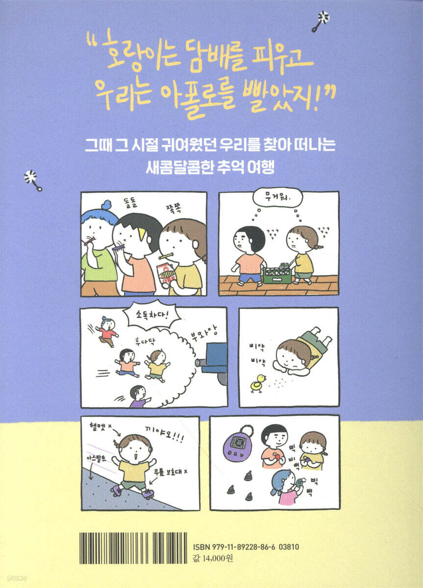 생각만 해도 기분이 좋아지는 것들이 있다. 그중 하나가 바로 어린 시절 우리가 사랑했던 것들에 대한 기억이다. 오직 스티커를 모으기 위해 사 먹던 포켓몬스터 빵, 하루에도 몇 번씩 치우던 다마고치 똥, 돌돌 말아 쏙 뽑아 먹던 아폴로를 비롯한 불량식품들. 신나게 불어 대던 본드 풍선, 방방 뛰며 좋아했던 방방, 주말 아침 알람 역할을 했던 디즈니 만화 동산, 작은 디스켓 속에 펼쳐진 고인돌, 너구리 같은 고전 게임들. 지금 같으면 층간 소음 문제로 절대 못 할 DDR, 누구나 묘기 하나쯤은 부릴 수 있던 요요, 고도의 집중력을 발휘해 조심조심 오리던 종이 인형 등 여기 그 시절 우리가 사랑했던 모든 것들이 총망라되어 있다. 보기만 해도 그 시절이 자동 재생되는 추억의 아이템 속에는 작고 귀여웠던 우리만큼이나 작고 소중한 추억이 자리하고 있다. 누구나 하나쯤 가지고 있던, 혹은 누구나 한 번쯤 해 봤던 것들을 마주하는 순간 우리는 세상에 둘도 없는 나만의 추억 여행을 떠나게 된다. 우리 그때 그랬잖아요! 지구상에는 아직도 풀 수 없는 미스터리한 일들이 있다. 그중 하나가 바로 소독차 따라다니기. 그 시절 우리는 무엇이 그토록 신났기에 친구들과 소독차를 따라다니며 소리를 질러 댔을까. 왜 그랬는지 이유는 알 수 없지만 ‘우리 그때 그랬잖아요.’ 하고 다정하게 말을 거는 이 책을 읽는 동안 우리는 자연스레 ‘맞아, 맞아, 나도 저랬어.’ 무릎을 치며 공감하는 스스로를 발견할 수 있을 것이다. 돌이켜 보니 우리는 사루비아꽃을 따다 꿀을 빨아 먹었고, 잠자리, 개미, 콩벌레 등 온갖 곤충과도 사이좋게 지냈으니 친환경적인 삶을 살았음이 분명하다. 학교가 끝나면 왼손엔 리코더, 오른손엔 떡꼬치를 들고 피아노 학원이며 태권도 학원에 가기 싫다고 징징거리다가도, 학원 가기 전 그 짧은 시간을 알뜰히 활용해 땅따먹기며 소꿉놀이를 하곤 했다. 평소엔 천둥벌거숭이처럼 굴다가도 공개 수업 날만 되면 세상에 둘도 없는 모범생으로 변신하기도 하고, 친구네 집에 전화를 하기 전에 인사말을 반복해서 연습하던 예의 있는 어린이었다. 밀레니엄 버그로 지구가 멸망할까 봐 걱정하던 어린이는 어른이 되었지만, 이 책에는 따로 약속을 잡지 않아도 놀이터에 가면 만날 수 있던 친구들처럼 여전히 우리를 상냥하게 기다리는 소중한 추억들이 자리하고 있다. 그리고 그 추억은 우리의 팍팍한 일상에 잠시나마 쉬어 갈 수 있는 쉼터가 되어 준다. 괜찮아요, 우리는 계속 귀여울 테니까! 이토록 귀여웠던 우리가 어른이 되었다. 그런데 지금의 우리도 귀여울까? 주위를 둘러보면 취업에, 직장에, 결혼에 온통 걱정거리에 사로잡혀 있을 뿐 귀여운 구석이라곤 찾아볼 수가 없다. 자신과 동시대를 살아온 청춘들이 품고 사는 고민에서 마찬가지로 자유로울 수 없는 작가는 ‘나, 잘 살고 있는 건가?, 혹시 내가 잊고 있던 소중한 무언가가 있지 않을까?’ 하는 질문에 대한 생각을 자신의 추억을 매개로 찬찬히 살펴본다. 물론 아무리 고민해 보아도 그 질문에 대한 뾰족한 답을 찾기는 어렵기만 하다. 오히려 아파서 조퇴를 해도 학교만 벗어나면 씻은 듯이 나았던 학창 시절의 폭신폭신했던 조퇴의 맛과 조퇴를 해도 회사에서 업무 카톡이 계속 오는 어른이 된 지금의 조퇴의 맛은 너무도 다르기에 현실의 쓴맛만 보게 될지도 모른다. 그럼에도 주문처럼 ‘그래서 어쩌라고!’, ‘모든 것은 원효 대사 해골 물이다!’라고 마음속으로 외치는 작가의 모습은 우리의 모습과 다르지 않아서 우리를 슬며시 미소 짓게 하고, ‘어쩌면 우리는 지금도 조금은 귀여울지 몰라.’ 하는 깜찍한 생각을 하게 한다. 그래서인지 어렸을 적에 생각했던 것만큼 훌륭한 어른이 되지는 못했을지 모르지만, 우리는 그때도 귀여웠고, 여전히 귀여우며, 앞으로도 귀여울 것이라는 작가의 별것 아닐 수 있는 말 한마디가 큰 위로로 다가온다. |