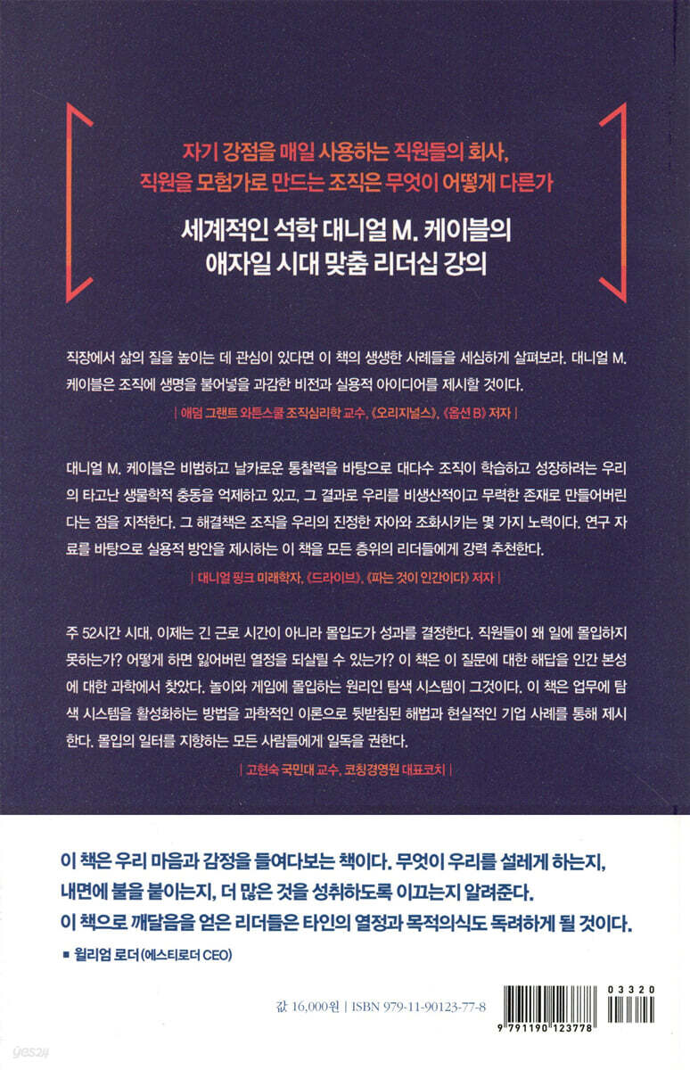 산업혁명 동안 노동자들의 탐색 시스템 억제는 의도적으로 이루어졌다. 과학적 관리는 노동자들이 지시받은 업무만 하도록 만들어주므로 이성적이고 효율적이라는 평가를 받았다. 지금은 상황이 다르다. 기업들은 그 어느 때보다 숨 가쁜 변화와 경쟁에 당면했고 변화 속도는 해마다 빨라진다. 기업은 혁신하는 직원들을 간절히 필요로 한다. 고객이 무엇을 원하는지 꿰뚫어 보는 직원, 리더보다 기술을 더 잘 활용하여 업무에 접목하는 직원, 창의성과 열정을 바탕으로 적응하고 성장하는 직원이 필요하다. 이를 위해서는 직원들의 탐색 시스템을 활성화해야 한다. (중략) 이를 위해 기업 구조를 완전히 뒤바꿔야 하는 것은 아니다. 살짝, 하지만 결정적으로 쿡 찌르는 리더의 개입만으로도 직원들의 탐색 시스템이 활성화되어 각자의 강점을 살리면서 실험하고 목적의식을 갖는 결과가 나타난다. --- p.14~15 기대심리가 열정으로 연결되는 과정 새로운 시도를 하고 싶고 주변 환경에 대해 가능한 한 많은 것을 배우고 싶을 때 탐색 시스템이 작동한다. 의외의 것을 발견했을 때 혹은 새로운 무언가를 기대할 때 이런 일이 일어난다. 그리고 그 결과 도파민이 폭발적으로 분비되어 즐거움과 아찔한 긴장을 경험한다. 도파민은 시간에 대한 인식도 관장하기 때문에 우리는 마구 흘러가는 시간이 마치 정지된 양 평소와 다르게 느낀다. 탐색 시스템이 활성화될 때 우리는 관심, 호기심, 탐구심, 그리고 더 나아가 복잡한 피질의 존재 덕분에 고차원적 의미 추구까지 경험한다. 이 긍정적이고 활기찬 기대심리는 결국 열정으로 연결된다. 펜실베이니아대학교 심리학 교수인 마틴 셀리그만은 열정이 흥분과 기대, 에너지에 찬 삶을 살도록 이끈다고 했다. 열정을 느낄 때 우리는 삶과 일을 모험으로 여긴다. 그리고 새로운 상황과 변화에 대해 불안과 두려움 대신 기대와 흥분으로 접근한다. --- p.29~30 자기 강점을 매일 사용하는 직원들의 회사 사회가 인스타그램, 페이스북 등에 얼마나 중독된 상태인지 보면 자기표현이 얼마나 매력적이고 재미있는 활동인지 알 수 있다. 이미 수천 년 전부터 철학자들은 인간이 자기 본모습을 남들에게 보여주고 싶은 내적 충동을 가졌다고 말해왔다. 인간으로서 우리는 진정한 자아를 인정받고 싶어 한다. (중략) 이 때문에 나는 직원들의 자기표현 무대를 자처하는 기업들이 크게 성공하게 될 것이라 믿는다. 기업이 제대로만 한다면 직장은 직원들이 원하는 장소가 될 것이다. 조직 내의 자기표현은 직원들의 탐색 시스템을 활성화시켜 최고의 강점을 직장에 쏟아부으려는 열정과 내적 동기부여를 낳는다. 그렇다고 한 직장에서 영원히 일하겠다는 생각은 비현실적이다. 직원들은 자기 커리어를 ‘사다리보다는 정글짐과 비슷한 일련의 직무 여행’으로 바라볼 필요가 있다. --- p.102~103 구글은 왜 ‘20퍼센트 시간’ 정책을 포기했을까? 20퍼센트 정책을 포기한 구글의 결정을 비난하기는 쉽다. 직원들의 탐색 시스템을 가로막은 근시안적 조치였다고 말이다. 20퍼센트 정책이 검증된 혁신을 여럿 낳았다는 점을 고려하면 더욱 그렇다. 하지만 균형을 기억해야 한다. 자유는 조직이 필요로 하는 틀 안에 위치해야 한다. 20퍼센트의 시간은 엔지니어 100명 규모일 때, 몇 개월마다 멋진 아이디어가 등장해 다른 직원들 마음을 사로잡는 상황일 때 적절한 비율이었다. (중략) 자유와 틀 사이의 긴장감은 양방향으로 매우 실제적이다. 대부분의 대기업은 틀이 너무 강력하고 자유는 너무 적은 극단에 위치한 상태지만 20퍼센트는 너무 큰 자유다. 틀이 강철 감옥이 되지 않을 정도의 충분한 자유, 직원들이 실험하고 학습할 수 있다고 느낄 만한 자유가 필요하다. --- p.148~149 직원은 섬기는 리더에게 최고의 성과를 보여준다 나는 확실성, 결단력, 위계서열을 바탕으로 한 관료주의적 리더십이 유해하다고 주장한다. 직원들의 두려움 시스템을 작동시키고 긍정적 감정을 차단하며 실험과 학습 충동을 억누르기 때문이다. 권력을 얻은 리더는 상대를 아이디어와 감정을 지닌 지적 인간이 아닌, 자기 목적을 위한 수단으로 바라보게 되는 탓에 이러한 ‘임원병病’을 흔히 드러낸다. 조직 생활에서 권력은 오만함과 자기중심성으로 드러나고 임원들은 권력을 사용해 직원들을 위협하면서 복종하게 만드는 일이 너무도 많다. (중략) 섬기는 리더는 다른 이들이 새로운 아이디어를 실험하고 최대의 잠재력을 발현하게끔 돕는다. 이렇게 되는 이유는 섬기는 리더들이 성장의 방식을 앞장서 보여주기 때문이다. 섬기는 리더들은 학습과 실험의 중요성을 그저 말로 떠드는 대신 발전의 방법을 몸으로 보여준다. 실수와 한계를 인정함으로써, 듣고 관찰하고 행동으로 학습하는 데 개방적인 모습을 보임으로써 말이다. --- p.162~164 리더의 가장 중요한 책무에 관하여 아무도 입 밖으로 꺼내 말하지 않지만 사실 리더는 종교 지도자와 비슷한 책무를 갖는다. 사람들이 자기 일과 삶에 대해 느끼는 목적에 직접적인 영향을 미치는 존재이기 때문이다. 그리고 이런 면에서 리더는 의사와도 비슷하다. 목적의식은 건강과 수명