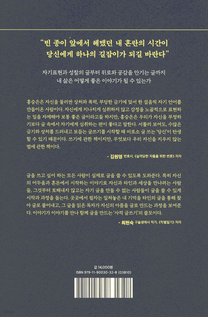 머리말 당신의 이야기를 들려주세요 1부 나를 나로 살게 하는 글쓰기 최선을 쓰는 중입니다: 문체와 감정에 관하여 글과 삶을 위탁하지 않기: 내 서사의 편집권을 지킬 것 나는 다만 노래 부르고 싶었을 뿐: ‘작가’의 기준에 주눅 들지 않기 존재를 자유하는 쓰기: 고정관념을 질문하자 지지 않고 쓰는 몸: 강요된 불합리를 의심하고 재배치하기 참은 줄 모르고 참은 말들: 용기인 줄 모르는 용기 내기 나는 적극적으로 과거가 된다: 절대적 피해자나 악인이 없는 글쓰기 사랑해서 침묵하는 당신에게: 내 이야기를 사랑해줄 사람 만나기 나를 망칠 수 있는 유일한 사람: 악평·악플에 대처하는 법 사적인 이야기의 반란: 침묵해야 할 이야기는 없다 요즘 뭐 하고 살아?: 나를 ‘글 쓰는 사람’이라 소개하기 2부 타인과 연결될 때 문장은 단단해진다 서로의 상상이 되기 위해 몸으로 쓰기: 남과 다른 글을 쓰는 법 기꺼이 슬픔에 잠기는 사람들: 타인에게 상처받고 영향받기 이야기 안내자의 사랑법: 정확한 사랑을 위한 15분 글쓰기 타인의 고통에 다가가는 글: 멈칫하는 태도가 필요한 순간 풍경에서 나온 사람: 애정의 크기만큼 섬세해진다 가만히 잊힌 방에 앉아: 사라진 이야기에 귀 기울이기 당신이 당황하길 바라요: 때론 누굴 당황하게 만드는 게 좋다 미치지 않으면 안 될 사연 하나: 옹호의 글쓰기 얼굴을 지우는 말들: 무해한 글쓰기를 위한 고민 매일 글 심는 사람: 글 쓰는 일이 버겁게 느껴질 때면 남겨진 것 이후: 애도의 글쓰기 아픔이 아픔을 위로한 밤: 내가 모르던 세계를 알아가기 당연한 게 아닌데, 나는 왜: 집필 노동자가 양보할 수 없는 것 3부 매혹적인 글쓰기를 위한 안내 고정감정 의심하기: 첫 번째 감정을 버려라 매혹적인 이야기꾼이 되는 법: 다르게 자랑하기 솔직하게 쓰면 말이죠: 글쓰기에 필요한 솔직함 슬픔에 마침표 찍지 말아요: 내 안의 선생님 죽이기 평범함이라는 함정에 빠지지 않기: ‘글감 있는 삶을 살라’에 담긴 의미 감히 ‘우리’라고 말할 수 있는 시간: 안전한 글쓰기 공동체 만들기 나의 비밀 레시피: 쓰기를 위한 읽기 자기만의 방 찾기: SNS 글쓰기 ‘나’라는 주어에 힘 빼기: 글이 도저히 써지지 않을 때 초보 집필 노동자의 일상: 규칙적 쓰기에 관하여 성실한 퇴고와 박수 소리: 함께 퇴고하기 할 수 있는 목요일 오후 3시: 대책 없이 일단 쓰기 인용문 출처 |