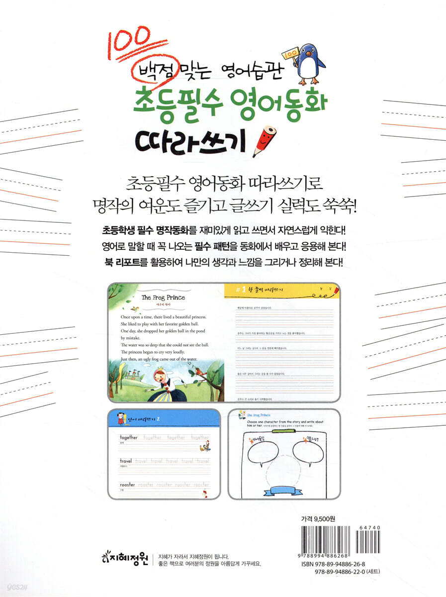 명작의 여운도 즐기고 글쓰기 실력도 쑥쑥 늘어나는 나만의 영어동화책! 초등필수 영어동화 따라쓰기의 도서입니다. 아이들에게 익숙한 ‘미운 아기 오리’와 ‘아기 돼지 삼형제’를 실었습니다. 영어로 무엇인가를 읽고 쓸 때는 아이가 흥미있어 하는 것부터 시작해야 지루하지 않게 오래 지속할 수가 있습니다. 그런 의미에서 아이들이 좋아하는 쉬운 영어동화책부터 시작한다면 책을 읽고 따라 써 보면서 영어 공부 뿐 아니라 생각의 폭까지 넓어지는 장점이 있습니다. 처음에는 그냥 그림과 함께 읽어보고 한 문장, 한 문장 따라쓰다 보면 긴 문장을 읽고 쓰는 것이 쉬워집니다. 그리고 전체 스토리뿐 아니라 문장 하나하나까지 음미할 수 있는 날이 오게 됩니다. 초등필수 영어동화 따라쓰기는 초등학생 필수 명작동화를 재미있게 읽고 쓰면서 영어실력까지 자연스럽게 익힐 수 있도록 구성하였습니다. 그리고 이야기를 모두 읽고 따라쓴 후 북 리포트로 나만의 생각과 느낌을 정리할 수 있습니다. www,jungwonbook.com에서 MP3 파일을 다운받아 활용하실 수 있습니다. |