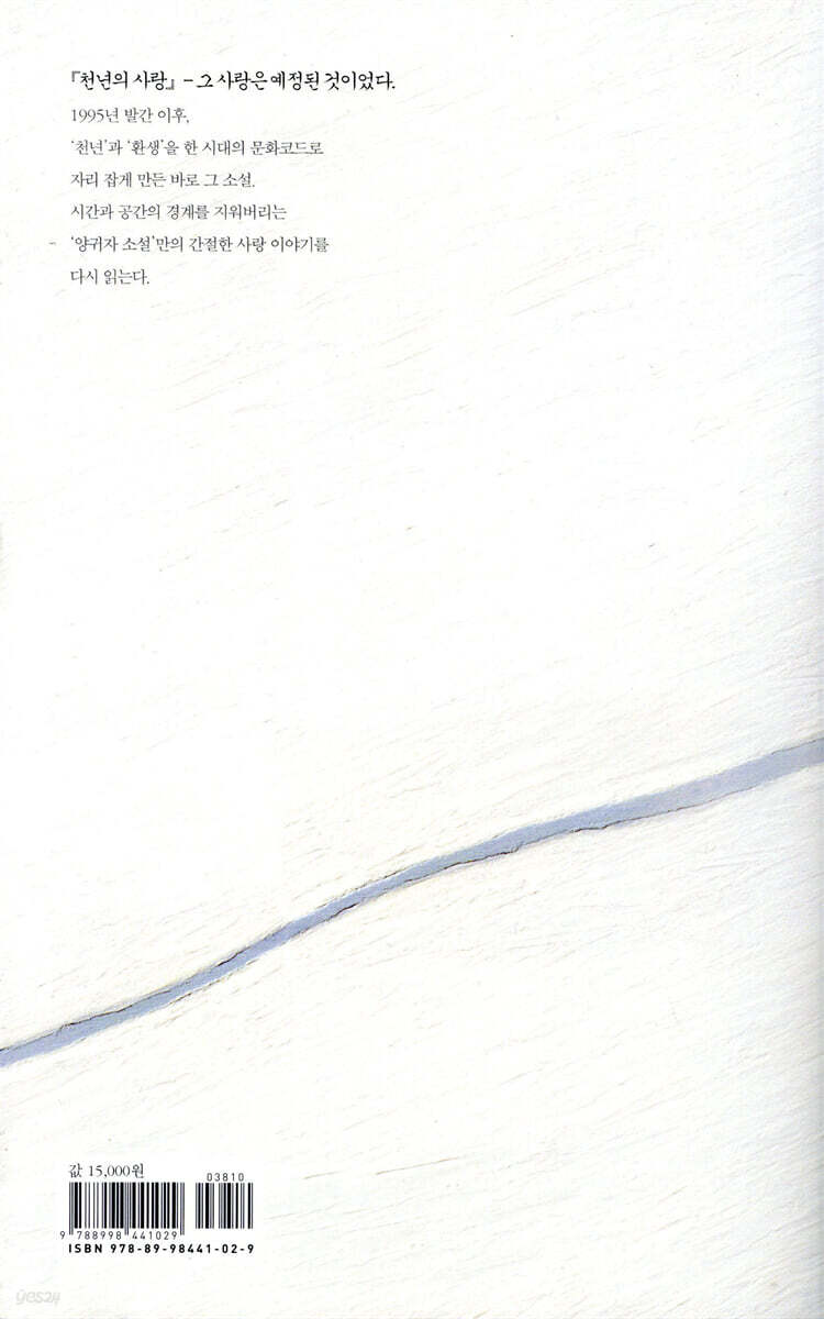 그것은 지금의 나, 백 년 전의 나, 천 년 전의 나, 겹겹의 세월 속의 내가 포개져서 발현된 영혼의 사랑이었다. 나는 그 영혼의 사랑을 경험한 것이었다. 1995년 8월에 출간된 양귀자의 장편소설. 천 년 전에 이루지 못했던 비극적인 사랑의 이야기가 천 년 후 다시 이어지는 과정을 기와 환생, 운명론을 불러 서정적인 문체로 완성시킨, 작가가 처음 쓴 연애소설이다.『천년의 사랑』은 출간 한 달 만인 그해 9월, 바로 베스트셀러 종합 1위에 올라 5개월 동안 한 번도 1위 자리를 내놓지 않았으며, 그 뒤로도 2년 가까이 베스트셀러 순위에서 내려오지 않았던 밀리언셀러로 많은 독자들의 사랑을 받았다. 뿐만 아니라 이후 이어지는 문화계의 ‘천년’과 ‘환생’의 열풍은 모두 소설 『천년의 사랑』이 일으킨 한 시대의 문화코드였음을 생각하면 이 소설의 의미가 한층 더 중요해진다 할 수 있다. 최근 양귀자 소설의 모든 저작권을 양도받은 도서출판 「쓰다」가 출간한 개정판 『천년의 사랑』은 초판 당시의 상, 하 두 권이었던 것을 한 권으로 합본하여 소장하기 쉽도록 만들었다. 작가의 말 이미 오래된 증상이지만, 소설을 생각하면 나는 늘 무언가 갑갑했다. 벗어나고 싶었다. 머리를 옥죄고 있는 틀 하나만 벗겨내면 훨씬 다르게 소설을 쓸 수 있을 것이고 그리하여 이 갑갑함에서 빠져나갈 수도 있으리라 생각하곤 했다. 이 소설은 글쓰기로 세상을 살아가는 자 하나가 제 손으로 평생 지니고 살던 머릿속 무거운 틀 하나를 벗겨낸 흔적이다. 그랬더니 참, 숨쉬기가 많이 편해졌다. 이 소설을 읽는 사람들도 나처럼 숨쉬기가 편해졌으면 좋겠다. 갇혀있는 사람들, 한계를 느끼고 있는 사람들, 그런 사람들한테 혹시 산소를 공급하는 구멍이 되지 않을까, 하고 말한다면 변명으로 들릴는지도 모르겠다. 그러나 변명도 알고 보면 모두 진실인 것을. 작가들의 꿈, 연애소설 『천년의 사랑』은 등단 이후 사회적 갈등과 소외된 자들의 이야기에 끊임없이 귀를 기울여 왔던 작가 양귀자가 처음 쓴 연애소설이다. 작가라면 누구라도 전 생애에 걸쳐 단 한 편이라도 좋으니 감동적인 연애소설을 써보기를 소망한다고 한다. 『천년의 사랑』은 파격적이라 할 만큼 시간과 공간을 무한대로 확장하면서, 동시에 금기로 여겼던 기공과 도술의 여러 개념을 소설의 중요 요소로 설정하는 파격을 감행한다. 그런 파격으로 작가들이 꿈꾸는 사랑 이야기의 최대치를 구현해내서 과연 양귀자답다, 라는 평을 많이 들었던 소설이다. 소설의 보폭을 넓히다 『천년의 사랑』은 90년대까지 지배하고 있던 리얼리즘 문학의 금기를 깨며 소설의 새로운 길을 제시한 작품으로 중요한 평가를 받고 있다. 작가 스스로도 말했듯이 “이 소설은 글쓰기로 세상을 살아가는 자 하나가 제 손으로 평생 지니고 살던 머릿속 무거운 틀 하나를 벗겨낸 흔적이다.” 누구보다도 치열하게 80년대의 갈등을 문학으로 형상화했던 양귀자였기에 이런 파격은 여러 논란을 낳았지만 독자들은 전폭적으로 지지하며 열광했다. 문학이, 소설이 시간과 함께 거듭 보폭을 넓혀야 한다는 뜻으로 해석하기 충분할 지지였다. |