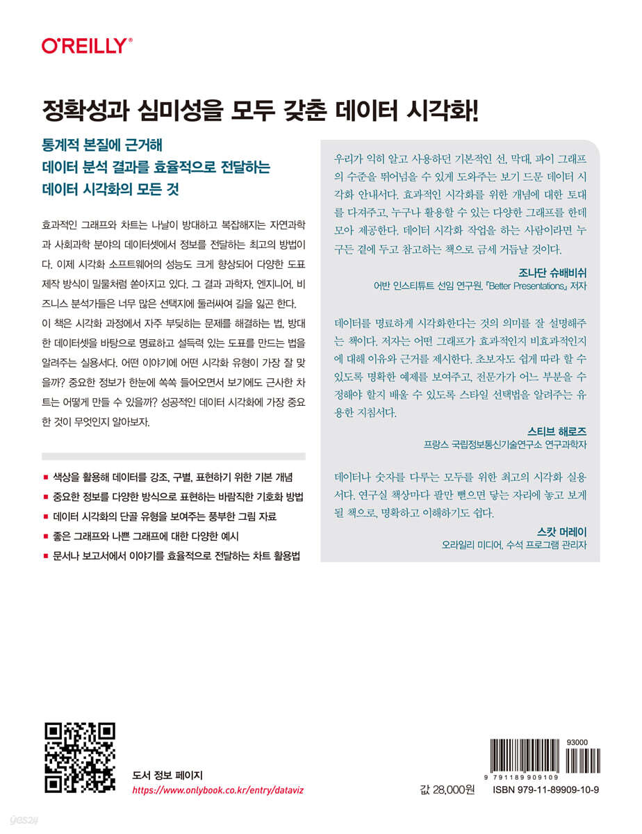 데이터나 숫자를 다루는 모두를 위한 최고의 시각화 실용서. 연구실 책상마다 팔만 뻗으면 닿는 자리에 놓고 보게 될 책으로, 명확하고 이해하기도 쉽다. - 스캇 머레이 (오라일리 미디어, 수석 프로그램 관리자)
