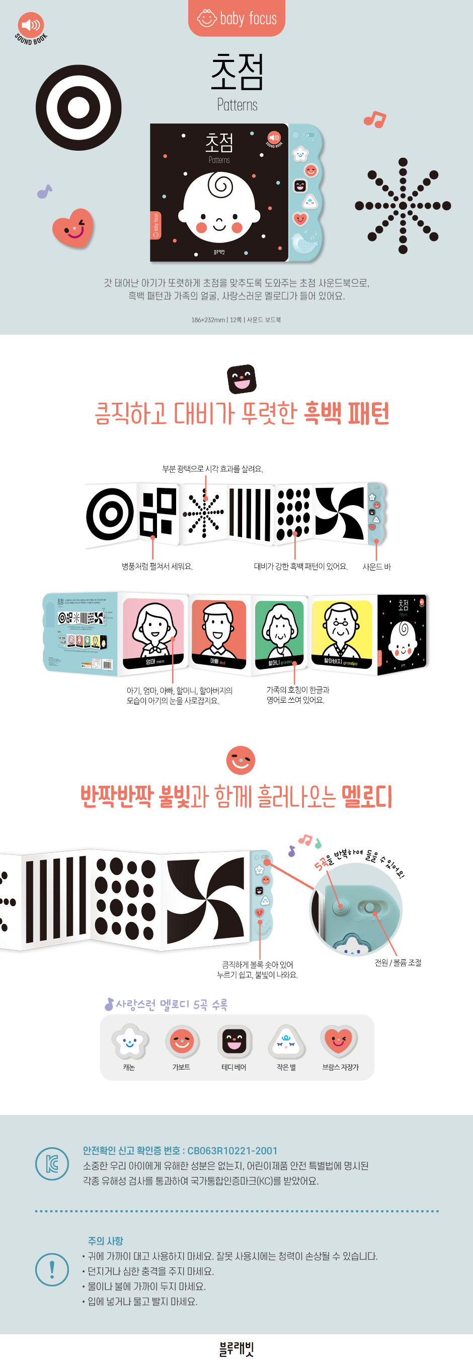 〈초점〉은 아기를 위한 흑백 초점책과 함께 사랑스러운 멜로디가 흘러나오는 사운드바가 부착되어 있어요. 멜로디가 흐르는 동안 LED 불빛이 반짝반짝 빛나지요. 아기가 시각 발달을 위해 초점책을 보는 동안 아름다운 멜로디로 청각 발달은 물론 밝고 부드러운 정서까지 자란답니다. 버튼을 누르면 각기 다른 5곡의 멜로디가 흘러나오고, 전원 스위치 옆의 동그란 반복 버튼을 누르면 5곡의 멜로디가 이어서 반복적으로 흘러나와요. 한 번 더 누르면 멈추지요. 소중한 아이를 위해 안전하게 〈초점〉은 소중한 아이의 안전을 위해 어린이제품안전특별법에 명시된 각종 유해성 검사를 통과하여 국가통합인증마크(KC)를 받았습니다. 아이와 함께 안심하고 사용하세요. ㆍ귀에 가까이 대고 듣지 마세요. 청력이 손상될 수 있습니다. ㆍ직사광선을 피하고 물이나 불에 가까이 두지 마세요. ㆍ정밀한 부품을 내장하고 있어 던지거나 세게 떨어뜨리면 고장의 원인이 될 수 있으니 주의하세요. |