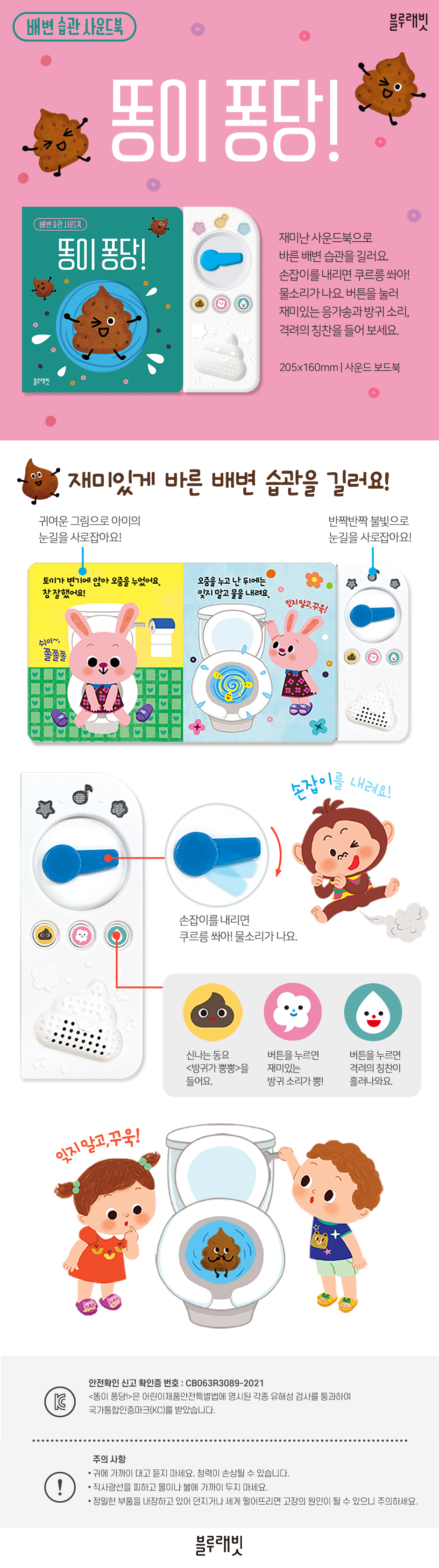 경우에 따라 어떤 아이에게는 배변이 두려움과 스트레스가 따르는 일일 수 있어요. 동물 친구들과 아이들이 차례로 변기에 앉아 일을 볼 때마다, 아이에게 손잡이를 내리게 하고, 부모님이 칭찬 버튼을 눌러 “참 잘했어요!” 아낌 없는 칭찬을 들려주세요. 두려움 없이 바른 배변 습관을 기를 수 있을 거예요. 소중한 아이를 위해 KC를 확인하세요! 〈똥이 퐁당!〉은 어린이제품안전특별법에 명시된 각종 유해성 검사를 통과하여 국가통합인증마크(KC)를 받았습니다. ㆍ귀에 가까이 대고 듣지 마세요. 청력이 손상될 수 있습니다. ㆍ직사광선을 피하고 물이나 불에 가까이 두지 마세요. ㆍ정밀한 부품을 내장하고 있어 던지거나 세게 떨어뜨리면 고장의 원인이 될 수 있으니 주의하세요. |