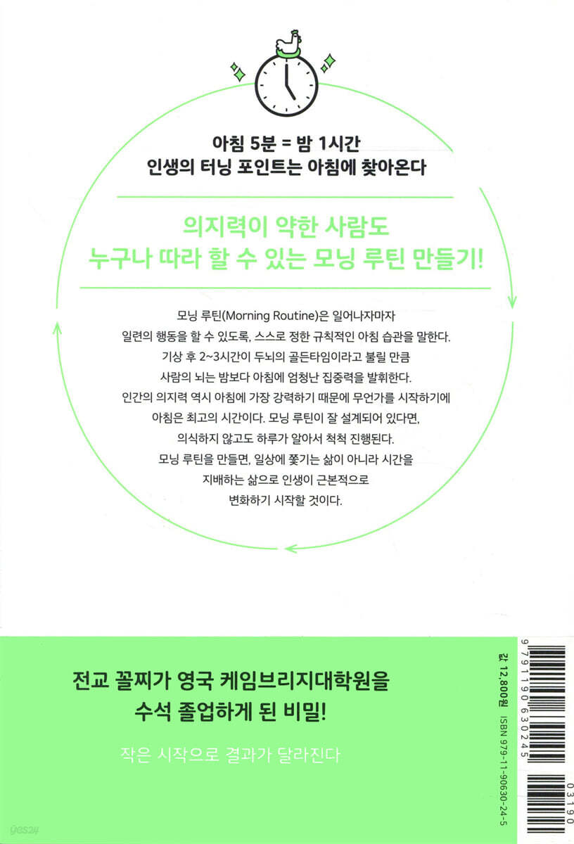 뇌의 스위치를 조금 일찍 켜는 기분 좋은 변화 습관, 모닝 루틴 일찍 잘 일어나는 사람들에겐 공통점이 있다. 알람을 켜고 끄기를 반복하며 아침 시간과의 전쟁을 치르며 하루를 시작하는 게 아니라, 설레는 마음으로 이른 시간에 일어나 전날 밤 미리 구상해놓은 나만의 하루를 완성해나간다는 것이다. 그들은 ‘일찍 일어나는 것’에 대한 강박감이 전혀 없을뿐더러 아침이면 행복한 마음으로 저절로 눈을 뜬다. 반면 아침에 눈 뜨기 힘들어 알람이 2~3번은 울려야 일어나는 사람들도 있다. 같은 시간, 다른 아침 풍경이 펼쳐지는 이유는 뭘까? 『모닝 루틴』의 저자이자 글로벌 리더를 육성하는 기업의 대표인 쓰카모토 료는 고등학교 시절 퇴학 직전의 문제아였지만, 아침 시간을 잘 활용하는 능력을 갖추면서 인생의 전환기를 맞았다. 저자는 아침 시간에 공부, 독서, 일, 운동…. 자신이 인생에서 중요하다고 생각하는 모든 걸 하면서도 스트레스를 받지 않았다. 체계적인 ‘모닝 루틴’을 가지고 있기에, 뇌에 부하가 걸리지 않고 모든 일이 순차적으로 진행되었기 때문이다. 우리가 익히 알고 있는 성공한 리더들 역시 자신만의 모닝 루틴으로 아침을 특별하게 맞이한다. 나만의 모닝 루틴을 만들어 지각 걱정에 마음 졸이는 아침이 아니라, ‘하면 된다’라는 자신감을 만끽한 채 하루를 시작해보자. 모닝 루틴을 만들면, 일상에 쫓기는 삶이 아니라 시간을 지배하는 삶으로 인생이 근본적으로 변화하기 시작한다. ‘아침 5분=밤 1시간, 인생의 터닝 포인트는 아침에 찾아온다’ 최고의 집중력을 활용하는 모닝 루틴 만들기! 기상 후 2~3시간이 두뇌의 골든타임이라고 불릴 만큼 사람의 뇌는 밤보다 아침에 엄청난 집중력을 발휘한다. 피로에 절은 저녁 뇌 대신 산뜻한 아침 뇌를 활용하기 때문이다. 자기 전에 어지럽게 흩어져 있던 정보들이 자는 동안 정돈되어, 평소 잘 이해되지 않았던 개념도 머릿속에 쏙쏙 들어오고, 기발한 아이디어도 아침 시간에 특히 많이 샘솟는다. 효율면에서 본다면 아침 5분은 밤 1시간과 맞먹을 정도다. 인간의 의지력 역시 아침에 가장 강력하게 작용하기 때문에 무언가를 시작하기에 아침은 최고의 시간이다. 또한 아침은 누구의 방해도 받지 않고 온전히 나만을 위해 보낼 수 있는 거의 유일한 시간이기 때문에 평소 미뤄뒀던 일이나, 새로운 도전도 쉽게 시작할 수 있다. 인생의 터닝 포인트가 아침에 찾아오는 이유다. 『모닝 루틴』에서 저자는 영국 케임브리지대학원에서 배운 심리학 지식과 수강생들을 가르치며 깨달은 사례를 토대로 누구나 쉽게 따라 할 수 있는 모닝 루틴을 만드는 비법을 전한다. 잠을 줄이지 않고, 시간을 효율적으로 사용하는 현실적인 방법을 알려주기에 의지력이 약한 사람도 누구나 따라 할 수 있다. 모닝 루틴을 통해 소중한 하루를 온전히 내 것으로 만들어보자. 아침이 행복해지는 작은 습관, 모닝 루틴의 차이가 인생의 격차를 만든다! 모닝 루틴을 만드는 법을 배웠다면 이제 지속시켜야 한다. 그 힘은 하루를 설레게 만드는 ‘작은 습관’에 달려 있다. 아침에 일어나자마자 엔진을 가동하지는 않고, 마음을 먼저 채운 후 하루를 시작하는 것이다. 아침이 설레면 인생이 설레고, 평범했던 하루가 특별해진다. 설레는 것이라면 무엇이든 좋다. 그 설렘을 모닝 루틴을 만들기 위한 목적으로 삼자. 저자의 경우는 홍차다. 자기 전에 ‘내일 아침은 어썸 홍차를 마셔야지’, ‘얼그레이를 마셔야지’ 하고 마실 차를 정해두고 아침 시간에만 홍차를 마신다. 맛있는 홍차를 즐기는 간단한 행위가 기분 좋게 일어날 수 있는 매개체가 된다. 아침을 설레게 하는 작은 습관이 인생의 성공 패턴을 만든다. 인생이 즐거워지는 일상의 작은 비타민을 마련해보자. 이 책을 읽고 나만의 모닝 루틴을 만들면, 아침이 오면 짜증 나기보다는 가슴이 두근거리기 시작할 것이다. |