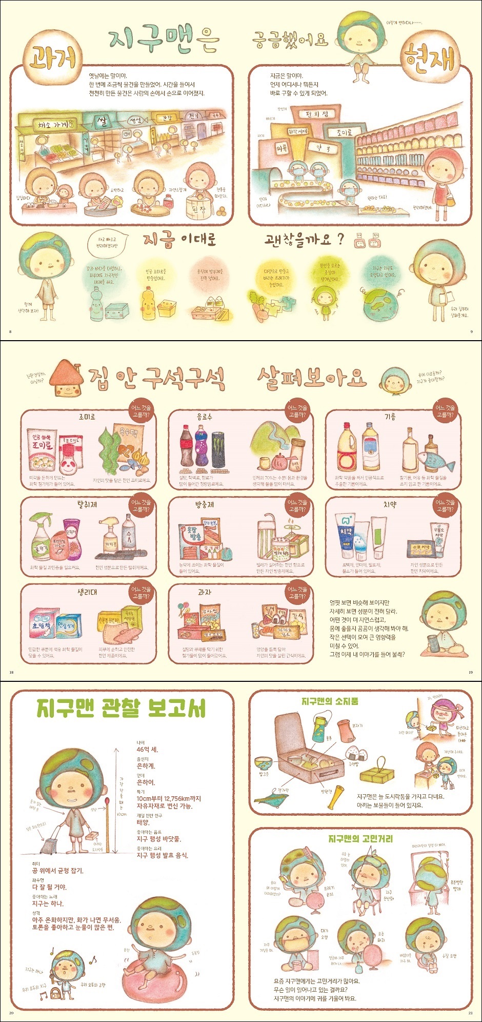 일상의 소비에 대해 비판적으로 돌아보는 일은 중요하지만, 아이들에게는 조금 어렵게 느껴질 수도 있습니다. 『쇼핑은 선택이야』는 어려운 설명 없이도 우리가 놓치고 있는 행동을 짚어 주며 정말 소중한 것이 무엇인지 생각하게 합니다. 숯이나 쌀겨, 레몬 등 자연 성분을 이용하여 씻기, 천연 성분을 활용한 물건들 찾아 사용하기처럼 구체적인 대안과 행동을 제안하지요. 뿐만 아니라 고통받고 있는 지구 모습을 지구맨의 고민거리로 보여 주어, 마치 친한 친구의 고민에 귀를 기울이게 되듯 환경 문제를 생각하게 합니다. 아이들은 자연스럽게 또 다른 선택, 모두를 위한 행복한 선택이 있다는 걸 알게 되고 그것을 선택하는 주체는 자기 자신이라는 것 또한 깨닫게 됩니다. 지구맨이 들려주는 놀라운 이야기가 가득한 지식 그림책 지구맨의 나이는 46억 세. 은하계 출신으로, 자유자재로 키가 작아졌다 커지는 특기를 가지고 있어요. 가장 친한 친구는 태양이랍니다. 늘 웃음을 잃지 않았던 지구맨에게 고민이 생겼어요. 자주 열이 나고 머리가 빠지며 기침이 멈추질 않는 거예요. 다양한 고민으로 시름시름 앓는 지구맨. 그 원인은 무엇일까요? 『쇼핑은 선택이야』는 지구맨이 들려주는 놀라운 이야기 속에서 우리가 잊고 있던 중요한 문제를 발견하게 합니다. 지구 위에 사는 모든 생물은 물과 흙과 공기 속에서 함께하며 살아가고 있다는 사실을요. 이 책을 통해서 아이들은 소중히 여겨야만 보이는 것들이 있다는 것을 깨달으며 조금씩 성장할 수 있습니다. 아주 작은 행동이라도 실천하는 용기를 가진다면, 세상은 어제보다 훨씬 좋아질 거예요. |
