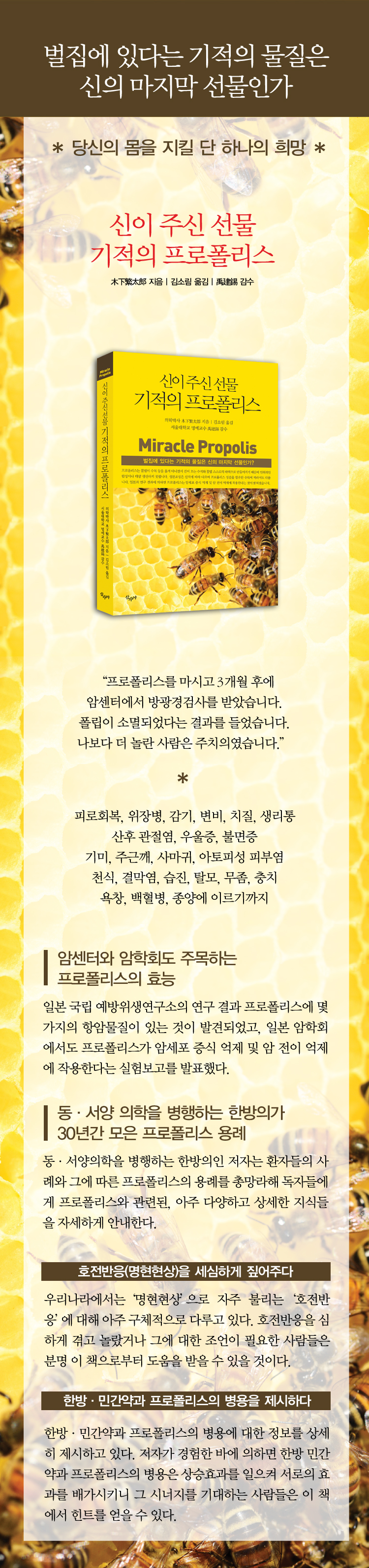 --- p. 10 꿀벌의 벌집 속에서는 바이러스나 박테리아가 전혀 관찰되지 않습니다. 그 이유는 프로폴리스가 유해한 미생물을 죽이는 항생물질 작용을 하기 때문입니다. 그 물질을 우리가 몸속에 넣음으로써 같은 효과가 나타난다는 것이 지금까지 연구자들의 견해입니다. 본인도 실제로 복용하고 사마귀에 발라서 그 사실을 입증한 셈이지만 프로폴리스에 함유되어 있는 성분 하나하나가 몸속이나 표면세포를 활발하게 함으로써 외부에서 침입하는 병원균이나 알레르겐(알레르기의 원인이 되는 것)을 세포상태에서 쫓아버리는 것입니다. --- p. 55 프로폴리스는 염증을 제거하고 환부의 열을 없애 줍니다. 염증은 처음부터 몸속에 있는 일종의 병적인 산화작용입니다. 프로폴리스의 항산화작용, 다시 말해서 소염작용이 피부 표면에서 유효하게 작용한다는 뜻입니다. 꿀벌이 스스로 채집한 프로폴리스를 벌집 내부 벽의 움푹 파인 데에 엷게 발라서 벌집을 수리, 보강하여 부패방지를 하는 것과 같은 효과를 나타내는 것입니다. 그것은 곧 외부로 침입해서 활동하려는 세균류를 프로폴리스의 막으로 차단하기 때문에 피부의 화농을 미연에 방지합니다. --- p. 80 호전반응은 한방이나 민간요법 등에서도 흔히 말하고 있는 반응으로 약효가 높으면 높을수록 나타나는 현상이 심하다고 알려져 있습니다. 한방에서는 이것을 ‘명현(瞑眩)’이라 합니다. 명현이란 본시 현기증이란 뜻으로 ‘한방치료 시에 치유되기 전에 일어나는 일과성의 격증(激症)’이란 것입니다. 따라서 프로폴리스에서만 나타나는 증상이 아니라 모든 한방약, 민간약에서 약효가 최대한으로 발휘되었을 때 일어나는 반응, 일시적인 악화상태라 생각하면 됩니다. 치료에 반응해서 숨어 있던 모든 병상이 밖으로 나타나는 것으로 건강체로 돌아가기 위한 일시적인 것이라 생각하면 이해하기가 쉬울 것입니다. --- p. 137 3년 전 대장에 생긴 폴립을 적출하는 수술을 했다는 58세의 남성의 경우인데, 그 남성은 한 달에 2~3회씩 프로폴리스 목욕을 하면서 매일 30방울 가량의 프로폴리스를 계속해서 마시자 다음과 같은 결과가 나왔다고 말해 주었습니다. “탕 속의 물이 검어지면서 욕조 밑에 흑색 같은 찌꺼기가 남았습니다. 개인적인 의견이지만 프로폴리스에 함유된 다종다양한 약리적 효과가 피하에 흡수되면서 몸속의 노폐물이 방출된 것이 아닌가 생각합니다.” --- pp. 177~178 |