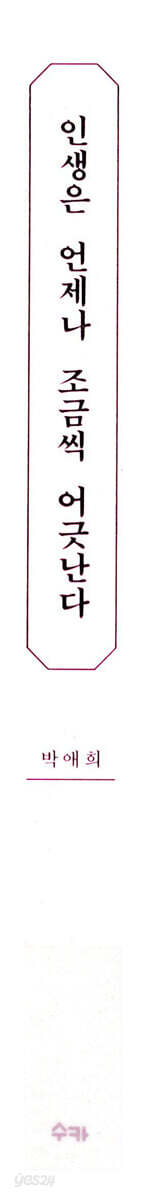 자신만의 이야기를 만들어가는 당신에게“ “펑펑 울고 싶은 날 꺼내보는 책” “반드시 집에 혼자 있을 때만 읽어야 할 책” 등의 눈물 가득한 후기를 남기며 세상 수많은 딸을 울린 『엄마에게 안부를 묻는 밤』 박애희 작가의 신작이 출간되었다. 전작이 사랑하는 엄마를 보낸 절절한 상실의 상흔을 이야기했다면, 신작 『인생은 언제나 조금씩 어긋난다』는 슬픔에서 걸어나와 어딘가로 조금씩 나아가는 희망의 메시지를 담았다. 저자는 불안하고 힘겨운 삶에 적응하기 위해서는 무얼 해야 하는지, 어떻게 계속 생의 의지를 지켜가야 하는지, 자신과 세상을 다루는 역량을 키우는 최선의 방법은 무엇인지, 그 답을 찾기 위해 오랜 시간 삶의 여기저기를 기웃거렸다. 이곳저곳을 헤매며 찾은 삶의 다정과 사랑과 희망들이 흔들리는 우리를 오래도록 지켜주었으면 하는 마음으로. 이 책은 인생의 혼란과 시련을 겪을 때마다 어떻게든 자신만의 길을 찾아낸 사람들의 이야기와 그 길을 찾아내기 위해 골똘한 저자 자신의 이야기를 담았다. 삶은 여전히 기대와 다른 방향으로 흘러가겠지만, 그때마다 생에 대해 질문하고 사랑하기를 포기하지 않는다면 우리 모두 자신만의 길에서 삶의 의미를 찾아낼 수 있을 것이다. “엎어지고 깨지고 주저앉는 그 순간, 적어도 삶은 또 우리에게 무언가를 가르쳐준다” 영화감독 고레에다 히로카즈는, 함께 식사를 마치고 즐거운 듯 손을 흔들며 역 안으로 걸어 들어가는 엄마의 뒷모습을 보며, ‘어쩌면 함께 밥을 먹는 것은 이번이 마지막일지 모른다’는 불안에 휩싸인다. 슬픈 예감은 왜 틀리지 않는 걸까. 감독의 말은 현실이 되었다. 고레에다 히로카즈 감독은 엄마를 보내드리고 그녀의 삶의 일부분을 영화로 담아낸다. 그러고는 생각한다. 엄마가 반년만 버티셨다면 얼마나 좋았을까. 그렇다면 이 영화를 보고 기뻐하셨을 텐데. 세상의 인정을 받는 어엿한 영화감독이 되었지만, 함께 기뻐해줄 엄마는 더 이상 세상에 존재하지 않는다. 영화 「태풍이 지나가고」의 주인공 료타는 한때 촉망받는 소설가였지만, 지금은 흥신소에서 불륜을 저지르는 배우자의 뒤를 캐거나 고등학생을 협박해 삥이나 뜯는 신세다. 물론 그는 늘 말한다. 이것은 모두 소설의 취재 차원이라고. 태풍이 오던 날, 료타는 함께 비를 피하던 아들의 “아빠는 뭐가 되고 싶었어? 되고 싶은 사람이 됐어?”라는 질문 앞에서 말문이 막힌다. 순간 그는 진지하게 생각했을 것이다. 자신이 진짜 꿈꾸던 인생에 대해, 앞으로 어떻게 살아야 하는지에 대해. 인생은 언제나 기대와 다른 방향으로 흘러간다. 산다는 건 후회와 실수와 상처가 수없이 쌓이는 일이다. 처음엔 내가 주인공인 줄 알았는데 나보다 잘난 사람이, 나보다 더 많이 가진 이가, 나보다 더 운이 좋은 누군가가 주인공이 되어버리는 현실. 하지만 언제까지 슬픔에 빠져 있을 수만은 없다. 언제까지 잃어버린 것을 쫓고 이룰 수 없는 꿈을 꿀 수는 없다. 그렇기에 중요하다. 삶의 바닥까지 끌어내리는 슬픔 앞에서, 되고 싶은 사람이 될 수 없었던 현실 앞에서, 우리는 어떻게 해야 하는지. 『인생은 언제나 조금씩 어긋난다』는 어긋나버린 인생과 후회의 시간을 잘 애도하며 생을 버텨낼 때, 인생은 한 편의 예술처럼 삶이 계속되어야 하는 이유에 대해 일깨워준다는 생의 진실을 나직히 들려준다. 아무리 실수투성이 인생을 살아왔어도 우리에겐 다정했던 기억과 사랑하는 사람이 옆에 있음을, 아직 걸어가야 할 길이 남아 있음을, 엎어지고 깨지고 주저앉을지라도 삶은 우리에게 분명히 무언가를 가르쳐줄 테니, 생의 진실을 믿고 자신을 조금은 따뜻한 시선으로 바라볼 수 있기를 더없이 다정하게 독려한다. 삶이 퍼석거릴 때 찾고 싶은 다정한 말들의 위로 재즈카페를 운영하던 20대의 무라카미 하루키는 어느 날, 집 근처의 야구장을 찾는다. 외야수가 친 타구가 높이 솟구쳤다 떨어지는 것을 보며 인생의 유한함을 깨닫고, 생의 의미 있는 순간을 붙잡기 위해 글을 쓰기 시작한다. 「캠핑클럽」에 출연한 핑클 멤버 성유리는 상대에게 조금도 스크래치를 내지 않으면서 유머를 구사하는 방법을 알고 있는 것 같다. 그녀에게서, 오랜 시간 타인과 나 사이에서 방황하다 자신을 사랑하는 데 성공한 사람의 여유를 배운다. 지금에 만족하는 대신 다른 이의 삶을 기웃거리게 될 때마다, 저 멀리 우도의 바다 깊은 곳에서 찰나의 욕심을 부리다간 목숨을 잃는 해녀들의 숨소리를 떠올리며 자신을 얼마만큼 소진하며 살아가야 할지를 배운다. 쿨하고 힙한 노배우의 대명사 윤여정의 모습에서는, 불평 대신 자신의 일을 성실히, 그저 묵묵히 해나가는 진짜 어른의 모습을 본다. 『인생은 언제나 조금씩 어긋난다』는 삶이 퍼석하고 마음에 허기가 느껴질 때 우리의 영혼을 달래줄 문장들로 가득하다. 영화와 인터뷰, TV 프로그램과 책 속 문장에 숨어 있는, 부스러진 마음을 모으는 다정한 말들을 통해 우리는 어제보다 오늘, 조금 더 나은 사람이 될 수 있는 힘을 얻는다. |