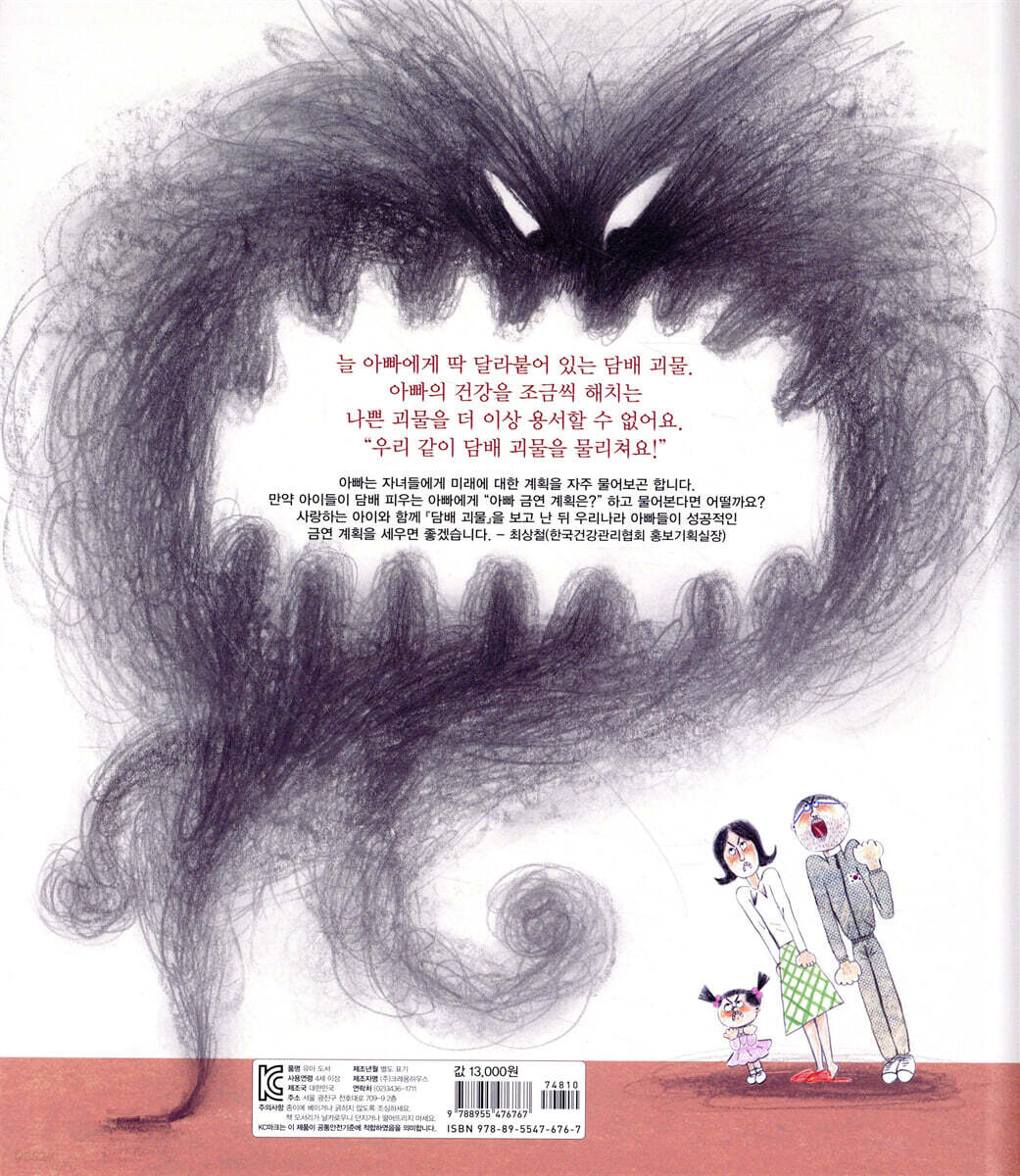 아빠는 자녀들에게 미래에 대한 계획을 자주 물어보곤 합니다. 만약 아이들이 담배 피우는 아빠에게 “아빠 금연 계획은?”하고 물어본다면 어떨까요? 사랑하는 아이와 함께 『담배 괴물』을 보고 난 뒤 우리나라 아빠들이 성공적인 금연 계획을 세우면 좋겠습니다.