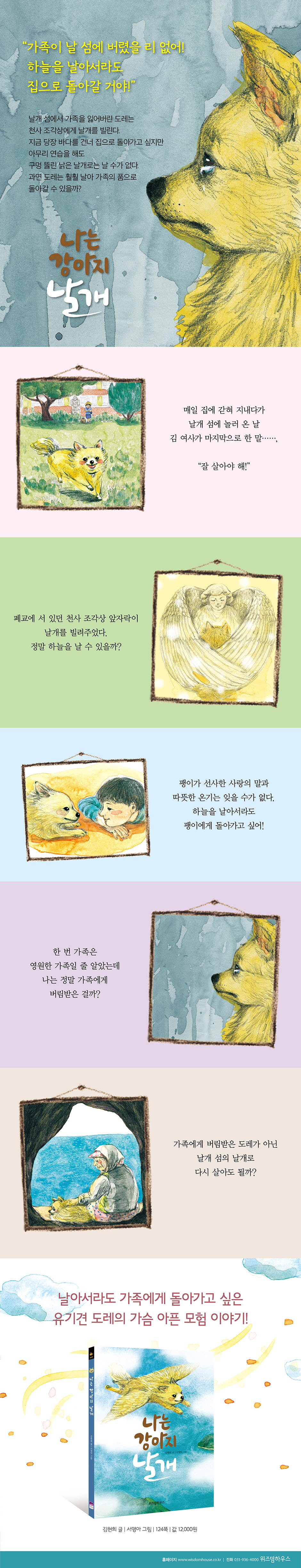 유기견 도레의 가슴 아픔 모험! 『나는 강아지 날개』는 작가가 작은 섬에서 만난 유기견을 기억하며 쓴 동화이다. 섬에서 마음씨 좋은 할머니를 만났지만 버려진 장소를 떠나지 못하고 옛 가족을 기다리던 뼈만 앙상하게 남은 이름 모를 강아지는 따뜻하고 가슴 뭉클한 이야기로 태어났다. 이 책 속 주인공 도레는 날개 섬에서 주인을 잃어버린다. 한 번 가족은 영원한 가족이라고 믿는 도레는 자신이 버려졌을 거라고는 꿈에서조차 생각하지 않는다. 도레의 관심은 온통 가족을 찾아가는 일뿐이다. 하지만 끝없이 펼쳐진 바다 때문에 집을 찾아갈 엄두조차 낼 수가 없다. 작가는 가족을 향한 도레의 간절한 마음을 동화적 상상력으로 풀어 낸다. 도레가 폐교에 버려진 순간을 목격한 천사 조각상이 도레에게 날개를 빌려준다. 그날부터 도레는 매일매일 하늘을 나는 연습을 한다. 제대로 먹지 못한 탓에 매번 바다에 빠져 죽을 둥 살 둥 허우적거리지만, 가족에게 돌아가겠다는 도레의 결심은 흔들리지 않는다. 도레는 자신에게 다정했던 팽이의 온기와 사랑을 잊을 수가 없다. 어떤 어려움이 있더라도 도레는 꼭 하늘을 날아서 가족에게 돌아가고 싶다. 작가는 가족에게 돌아가기 위한 도레의 모험을 통해 사람에게 버림받은 강아지의 생각과 감정을 고스란히 전달해 준다. 누군가를 사랑하고 아끼는 마음은 사람이나 동물이나 크게 다르지 않다. 버림받았을 때 느끼는 아픔과 상처 또한 그렇다. 가족만을 아끼고 사랑하는 반려견들은 자신이 버림받았다는 사실조차 인지하지 못하고 평생 가족을 그리워하며 살아가기도 한다. 만약 단 한 번이라도 동물의 입장이 되어 본다면, 반려동물을 쉽게 버리지 못할 것이다. 이 책은 동물의 시선으로 사람과 동물의 관계를 바라보게 할 뿐만 아니라 생명을 키우는 일에 대한 의미와 무게까지 전달해 준다. 상처 입은 동물들을 치유하는 날개섬에서 날개라는 이름으로 날아오르다! 날개 섬에는 또 다른 유기견이 있다. 룰루와 랄라는 주인이 결혼하면서 주인 엄마에게 맡겨졌다가 늙어서까지 개를 돌볼 수 없다는 이유로 버려진다. 그러다 어이 부부를 만나 날개 섬에 오게 된다. 어이 부부는 유기견을 데려와 살을 찌운 뒤 보신탕을 만들어 파는 사람들이다. 둘은 도레의 도움으로 가까스로 식당을 탈출하지만, 사람에게 두 번이나 버림받았다는 사실에 몇 날 며칠을 끙끙 앓는다. 도레는 룰루와 랄라를 돕다가 식당 부부에게 붙잡힌다. 도레는 피 냄새나는 철창 안에서 자신이 왜 그날 가족 중 하나인 김 여사를 따라 날개 섬에 오게 되었는지를 떠올린다. 도레의 털 때문에 팽이가 아팠다! 결국 도레는 김 여사를 잃어버린 게 아니라 김 여사가 자신을 섬에 버렸다는 사실을 깨닫는다. 이제 도레는 철창에서 도망쳐야겠다는 의지마저 잃고 어이 부부의 뜻대로 사람들의 구경거리로 살아가도 상관없다고 생각한다. 다행히 날개 섬에는 버려진 유기견을 데려다 키우는 봉지심 할머니가 있다. 할머니는 마을 사람들에게 날개 섬에 버려진 동물들을 위한 터전을 만들자고 설득한다. 단 한 번도 동물이 먼저 이유 없이 사람을 해코지한 걸 본 적 없다고, 동물들이 포악해진 것은 사람의 욕심 때문이라고, 날개 섬사람들만이라도 동물들과 평등하게 같이 살아가자고. 봉씨 성을 가진 할머니 할아버지들이 사는 작은 섬에는 버려진 동물들을 위한 새로운 터전이 생겨난다. 봉지심 할머니의 따뜻한 마음과 손길은 룰루와 랄라뿐만 아니라 다시는 사람에게 의지하지 않겠다고 생각하는 도레의 마음까지도 움직인다. 도레는 자신을 구해 준 봉지심 할머니가 불러 주는 ‘날개’라는 이름으로 살아가기로 마음먹는다. 언젠가 날개 섬을 자유롭게 뛰어다니다 보면 마음속 상처가 깨끗하게 나을 거라고 믿으며. 도레가 훨훨 날아 자신을 애타게 찾는 가족에게 돌아가는 마법 같은 해피엔딩은 일어나지 않는다. 하지만 이 책은 사람과 동물이 서로의 마음을 이해하고 아픔을 보듬는 기적 같은 순간을 선사한다. 자세를 낮추어 동물 편에 서서 생각하고 또 생각한다면 이런 기적은 누구에게나 언제든 일어날 수 있다. 그게 바로 날개가 독자들에게 전하는 가슴 뭉클한 메시지이다. |