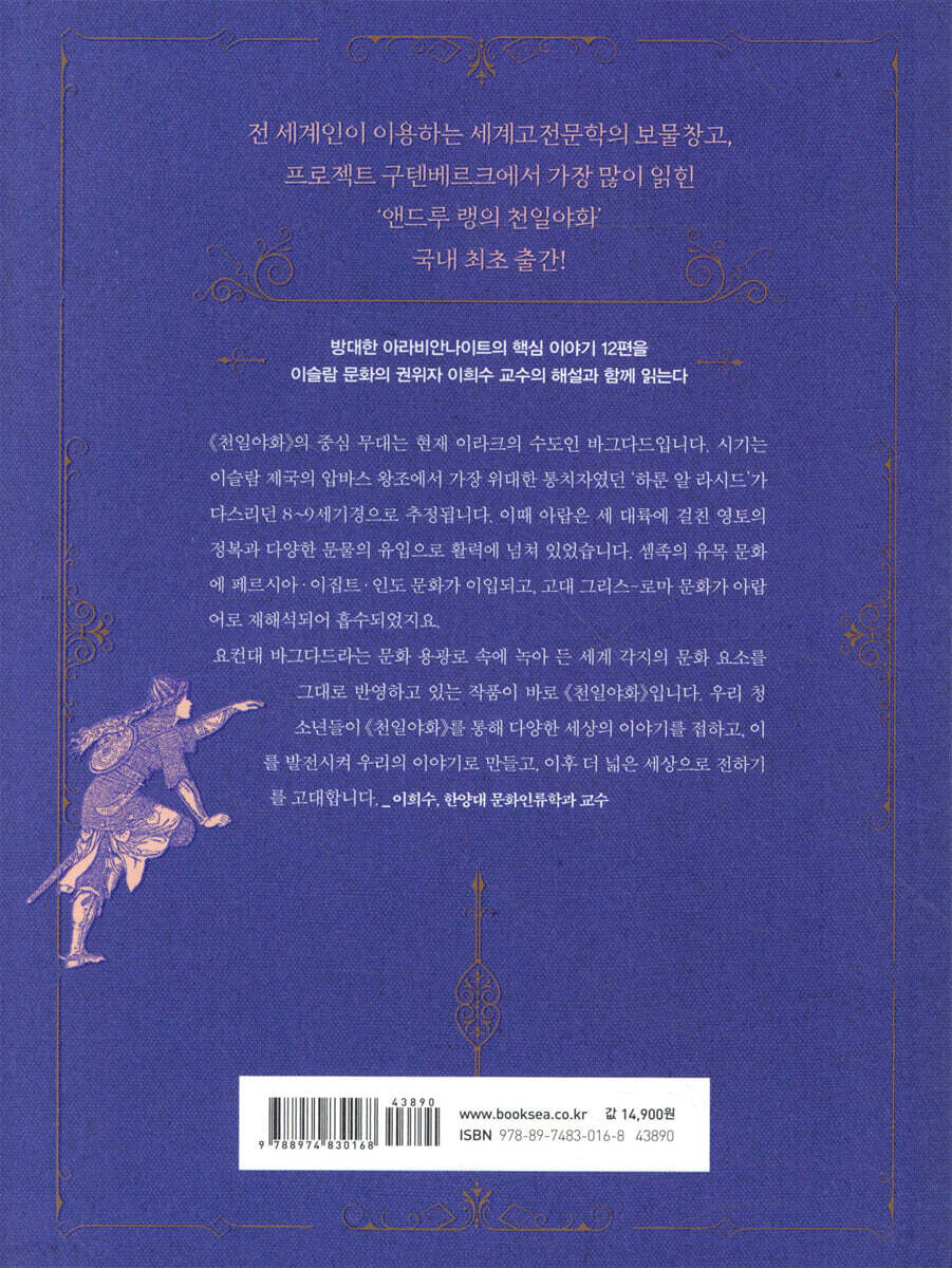 전 세계인이 이용하는 세계고전문학의 보물창고, 프로젝트 구텐베르크에서 가장 많이 읽힌 ‘앤드루 랭의 천일야화’ 국내 최초 출간! 이에 『요정 이야기』로 유명한 영국의 민속학자이자 고전문학 전문가 ‘앤드루 랭’은 갈랑판에서 「항해자 신드바드의 모험」 「알라딘과 요술 램프」 등 흥미진진한 주요 이야기 12편을 엄선해 청소년이 읽기 쉽게 간추렸다. 아랍인들의 삶과 정서, 상상력과 해학을 잘 보여 주는 이야기들은 살리고, 반복되고 늘어지는 부분들은 적절히 생략해 지루함을 대폭 줄였다. 그리하여 랭의 『천일야화』는 전 세계인이 이용하는 전자책 사이트이자 세계고전문학의 보물창고로 알려진 ‘프로젝트 구텐베르크’에서 가장 많이 읽힌 『천일야화』가 되었다. 이 책은 랭판을 국내 최초로 번역해 소개한 것이다. 12편의 큰 이야기 속 작은 이야기 21편을 바로 구분할 수 있도록 섬세하게 레이아웃 했으며, ‘바이람’ ‘신자들의 사령관’ ‘풍요로운 아라비아’와 같이 이슬람 문화나 아랍의 지명에 관련된 배경 지식이 요구되는 낯선 용어에 따로 설명을 넣어 이해를 도왔다. 아울러 19세기 영국과 아일랜드의 유명 삽화가가 그린 도판 40여 점을 실었다. 세밀하고 생동감 넘치는 그림들은 등장인물들이 겪는 예측불허의 기묘한 모험에 함께하고 있는 듯한 기분을 독자에게 선사한다. 이슬람 문화 연구의 권위자 이희수 교수의 해설과 함께 읽는 아라비안나이트 『천일야화』를 읽다 보면 궁금증이 생긴다. 아랍 민중들의 입에서 입으로 퍼지던 이야기들이 어쩌다 유럽인들의 손에서 갈무리되었을까? 왜 ‘1000일’이 아니라 굳이 ‘1001일’인 것일까? 「항해자 신드바드의 모험」이 오디세우스가 트로이 전쟁 후 귀향할 때 겪었던 모험과 비슷한 줄거리인 이유는 무엇일까? 『청소년을 위한 천일야화』는 책의 맨 앞에 이슬람 문화 연구자 중 최고 전문가로 꼽히는 문화인류학자 이희수 교수의 해설을 실어 이 모든 질문에 친절하게 답하고 있다. 독자들은 이슬람-유럽 간 문화 교류의 역사를 통해 아랍에서 시작된 이 전설이 불멸의 세계고전이 되기까지의 여정을 입체적으로 파악하게 될 것이다. |