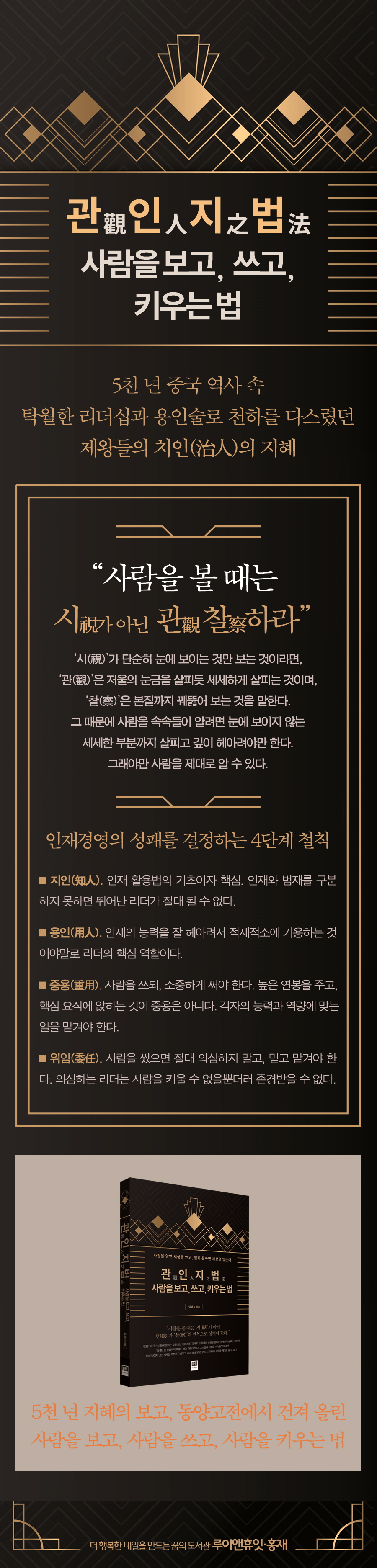 관인지법(觀人之法), 사람을 보고 쓰고 키우는 법 PART 1 지인(知人), 사람을 알아야 한다 사불문(四不問), 네 가지를 묻지 말라 ― 강태공의 팔관법(八觀法) 객경(客卿), 진시황의 천하 통일 위업의 비밀 ― 제갈량의 지인지도(知人之道) 군이지인위명(君以知人爲明), 군주는 인재를 알아봄으로써 밝아진다 ― 인재를 꿰뚫는 유비의 통찰력 국유삼불상(國有三不詳), 나라를 망치는 세 가지 불길한 징후 ― 인재경영의 성패를 결정하는 4단계 철칙 지인선용(知人善用), 그릇의 크기를 알아야 한다 ― 인재 관리의 고수, 방현령의 인재관리법 지상담병(紙上談兵), 백면서생의 최후 ― 공자의 사람을 보는 기준 기화가거(奇貨可居), 절대 놓쳐서는 안 되는 인재 ― 승부사 여불위의 뛰어난 안목 선시어외(先始於?), 인재가 없는 이유 ― 천리마도 알아보지 못하면 아무 소용없다 PART 2 용인(用人), 사람을 쓸 줄 알아야 한다 오불여(吾不如), 나는 당신만 못하다 ― 중국 황제들의 인사 필독서 『인물지』 굴신제천하(屈臣制天下), 낮출수록 높아진다 ― 사람을 품는 유비의 낮춤 리더십 겸청즉명(兼聽則明), 두루 들어야 밝아진다 ― 사람을 거울로 삼아야 하는 이유 도리불언하자성혜(桃李不言下自成蹊), 바르게 행하면 길이 저절로 생긴다 ― 존경받는 리더십의 비결, 솔선수범 유능제강(柔能制强), 부드러운 것이 강한 것을 이긴다 ― 강한 사람, 강한 조직일수록 유연하다 항룡유회(亢龍有悔), 내려올 때를 놓치면 후회한다 ― 버려야 얻고, 멈춰야 나아갈 수 있다 군주민수(君舟民水), 군주가 절대 잊어서는 안 되는 말 ― 제왕학 교과서, 『정관정요』 계명구도(鷄鳴狗盜), 세상에 쓸모없는 사람은 없다 ― 정치의 달인, 이극의 ‘오시법’ PART 3 중용(重用), 소중하게 써야 한다 토미양화(土美養和), 어진 임금이 어진 신하를 만든다 ― 리더가 멀리해야 할 6가지 유형의 사람 궁팔십 달팔십(窮八十 達八十), 기다림의 지혜 ― 인내만큼 드러나지 않는 지혜는 없다 각재기소(各在其所), 누구나 제자리가 있다 ― 만족할 줄 알면 욕되지 않는다 물극필반(物極必反), 넘침을 경계하라 ― 넘침을 경계하는 잔, ‘계영배’ 선승구전(先勝求戰), 싸우지 않고 이기는 법 ― 노자가 말하는 ‘가장 이상적인 리더’ 시지이성책(示之以誠策), 진심이 마음을 움직인다 ― 설득의 귀재, 소진의 7가지 책략 일일삼과(一日三過), 하루에 세 번 왕을 꾸짖은 이유 ― 뛰어난 리더는 혼자 만들어지지 않는다 PART 4 위임(委任), 믿고 맡겨야 한다 오수척 천하비(吾雖瘠 天下肥), 나는 야위었으나, 천하는 살쪘다 ― 의심 많은 리더는 성공할 수 없다 지지(知止), 그칠 줄 알아야 한다 ― 처세의 달인, 장량의 처세술 무신불립(無信不立), 신뢰가 없으면 설 수 없다 ― 공자와 맹자가 제왕의 선택을 받지 못한 이유 의행무명 의사무공(疑行無名 疑事無功), 의심하면 성공할 수 없다 ― 인재를 최고로 만드는 리더, 망치는 리더 교토삼굴(狡兎三窟), 뛰어난 리더일수록 멀리 내다본다 ― 리더의 통찰력과 선견지명 해대어(海大魚), 물고기는 물을 떠나서 살 수 없다 ― 급할수록 돌아가야 한다 역린지화(逆鱗之禍), 상대의 치부를 건드리지 말라 ― 세난, 설득이 어려운 이유 상옥추제(上屋抽梯), 모든 힘을 한곳으로 모으는 최후의 승부수 ― 파부침주의 각오로 맞서라 에필로그 사람을 알면 세상을 얻고, 알지 못하면 세상을 잃는다 |