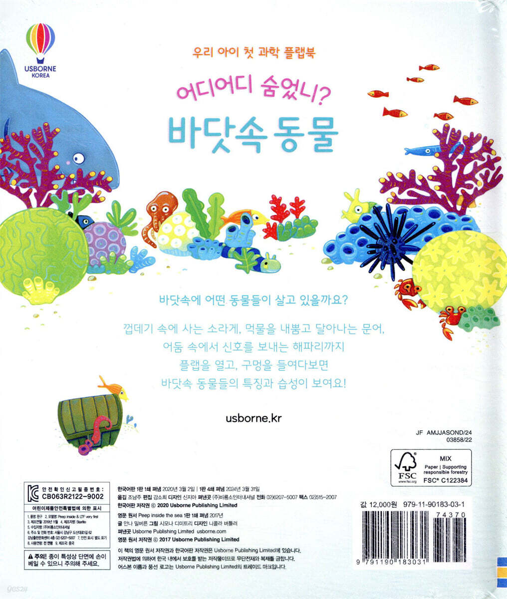 어디어디 숨었니? 구멍 사이로 살짝 보이는 동물이 어떤 동물인지 맞춰 보아요. 크고 작은 플랩을 들추며 동물들과 숨바꼭질하는 기분이 들지요. 또한 장면 곳곳에 쏙쏙 뚫린 구멍을 들여다보고 손가락을 넣어 보기도 해요. 올록볼록 두꺼운 종이의 질감이 아이들의 촉각을 자극하고, 손 조작 능력을 발달시켜 줄 거예요. ◆ 유아의 눈높이에 꼭 맞추어 전하는 바닷속 동물의 생태와 특징 바닷속에는 어떤 동물들이 살고 있나요? 복어는 어떻게 위험을 피하나요? 노란 물고기들이 왜 거북이에게 달라붙어 있나요? 해조를 똑 닮은 동물은 누구일까요? 북극곰은 얼음처럼 차가운 바다에서 헤엄칠 수 있나요? 아주 깊은 바닷속에는 무엇이 있나요? 해파리는 어떻게 신호를 보낼까요? 책 속 물음을 따라 플랩을 하나씩 열면서 바닷속에 사는 동물들의 습성과 특징을 알 수 있어요. 간결하고 리듬감 있는 문체와 귀엽고 아기자기한 그림은 유아들도 쉽게 책에 몰입하도록 도와주어요. 플랩을 열고 닫으며 지식을 쏙쏙 얻고 집중력과 관찰력을 높일 수 있답니다. |