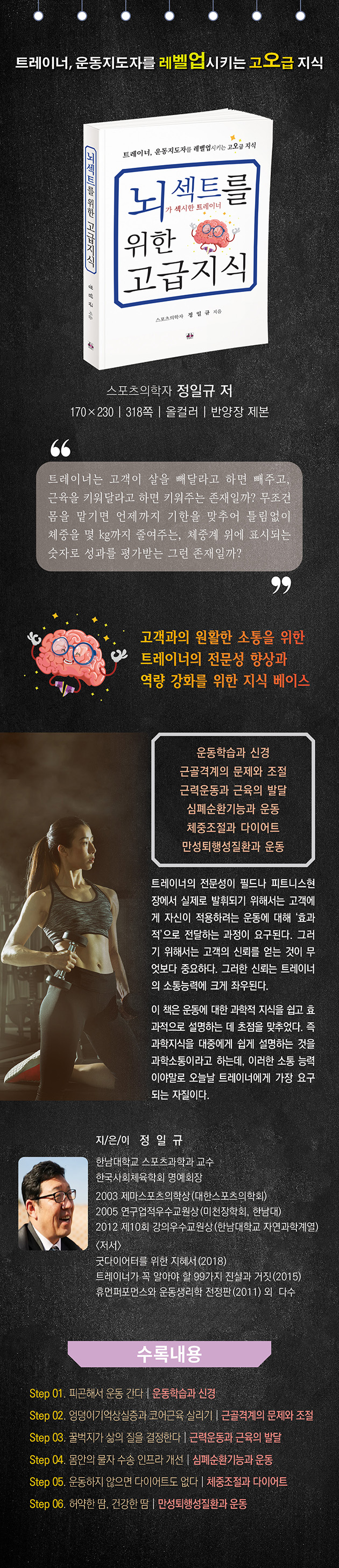 피곤해서 운동 간다 지금 운동을 시작해야 하는 이유 우울한 뇌에게 보내는 유쾌한 메시지 ‘기분 좋은 피로’의 의미 다리로 공부하고, 머리로 운동하라 운동 피로에 대한 오해, 젖산 이야기 유산소운동과 무산소운동, 제대로 알고 이야기하자 에너지 가성비를 최고로 잃어버린 생활리듬을 되찾으려면 드라이브 스루와 생활의 달인 러닝맨, 잊혀진 놀이 아이들에게 잘 노는 법을 가르치자 Step 02. 엉덩이기억상실증과 코어근육 살리기 내 몸의 정렬과 근막통증증후군 엉덩이기억상실증과 코어근육 살리기 건강을 위한 두 가지 숨쉬기 방법 날개뼈를 움직여서 날아보자 횡격막 대보수 작전 몸에는 지구력 선수들이 산다 C?자 허리와 민짜 엉덩이 아픈 무릎관절 고쳐서 백세까지 쓰자 현대인의 고질병, 어깨질환 횡격막호흡으로 내장을 마사지하기 어깨를 펴야 할 또 다른 이유 Step 03. 꿀벅지가 삶의 질을 결정한다 꿀벅지가 삶의 질을 결정한다 한 살이라도 젊었을 때 근육을 키워라 몸안의 에너지 공장 경영 노하우 운동 후 근육통증, 운동을 쉬어야 할까 ‘근육 발달은 걷기부터’가 무슨 뜻 몸 안팎의 빨간색 근육들 성장호르몬을 다시 흐르게 하자 키 성장에 대한 오해 운동 후 술자리와 근육 형성 근육 키우기, 새로운 연구결과들 보충제, 언제 어떻게 먹어야 하나 Step 04. 몸안의 물자 수송 인프라 개선 근육 펌프를 작동시키자 혈관의 꿈틀거림, 맥파를 크게 일으키자 두 가지 수로 시스템과 두 개의 펌프 중량 운동을 할 때 숨을 참지 말라는 이유 몸안의 물자 수송 인프라 운동을 하면 땀도, 피도 묽어진다 심장이 빨리 뛰는 두 가지 경우 몸의 산소 수송차량 이야기 체온조절 기능을 개선하자 누웠다 일어날 때 어지러움을 느낀다면 Step 05. 운동하지 않으면 다이어트도 없다 아침을 거르는데 왜 살이 찔까 스트레스를 받으면 왜 뱃살이 늘어날까 뱃살 빼기 운동 - 사라지지 않는 신화 뇌를 훈련하면 다이어트가 쉬워진다 슈거 스파이크, 슈거 크래시 탈출 근육이 움직이지 않으면 지방의 연소도 없다 물살과 지방살, 무엇이 다를까 레슬링 선수의 체중 감량법과 우리의 살빼기 나를 기만하는 가짜 배고픔 가짜 배고픔과 놀이 가짜 배고픔과 운동 살찌는 체질, 내 몸의 벽난로를 지펴라 나의 다이어트 유전자와 운동 잠 잘자는 것이 살 빼는 길 Step 06. 허약한 땀, 건강한 땀 내 몸의 불한당, 자유기에 대처하는 방법 사우나의 땀, 꿩 대신 닭인가 허약한 땀, 건강한 땀 운동을 할 때 어지럼증을 느낀다면 몸안의 도로를 달리는 지방 수송차량들 질병의 뿌리부터 캐내자, 인슐린 저항성 과묵한 신사, 간 이야기 염증과의 전쟁에서 승리하라 운동은 암 발생 위험을 낮춘다 운동이 코로나19 감염에 미치는 영향 운동은 치매를 예방한다 |