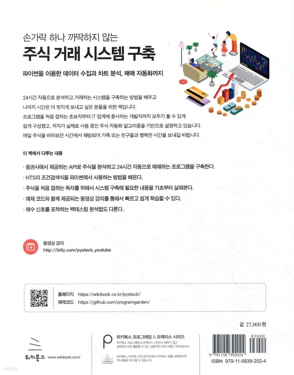 24시간 자동으로 주식을 분석하고 거래하는 시스템을 구축하는 방법을 배우고 나머지 시간은 더 멋지게 보내고 싶은 분들을 위한 책입니다. 프로그램을 처음 접하는 초보자부터 IT 업계에 종사하는 개발자까지 모두가 볼 수 있게 쉽게 구성하였으며, 저자가 실제로 사용 중인 주식 자동화 알고리즘을 기반으로 설명하고 있습니다. ★ 이 책에서 다루는 내용 ★ ◎ 증권사에서 제공하는 API로 주식을 분석하고 24시간 자동으로 매매하는 프로그램을 구축한다. ◎ HTS의 조건검색식을 파이썬에서 사용하는 방법을 배운다. ◎ 주식을 처음 접하는 독자를 위해서 시스템 구축에 필요한 내용을 기초부터 살펴본다. ◎ 예제 코드와 함께 제공되는 동영상 강의를 통해서 빠르고 쉽게 학습할 수 있다 ◎ 매수 신호를 포착하는 백테스팅 분석법도 다룬다. |