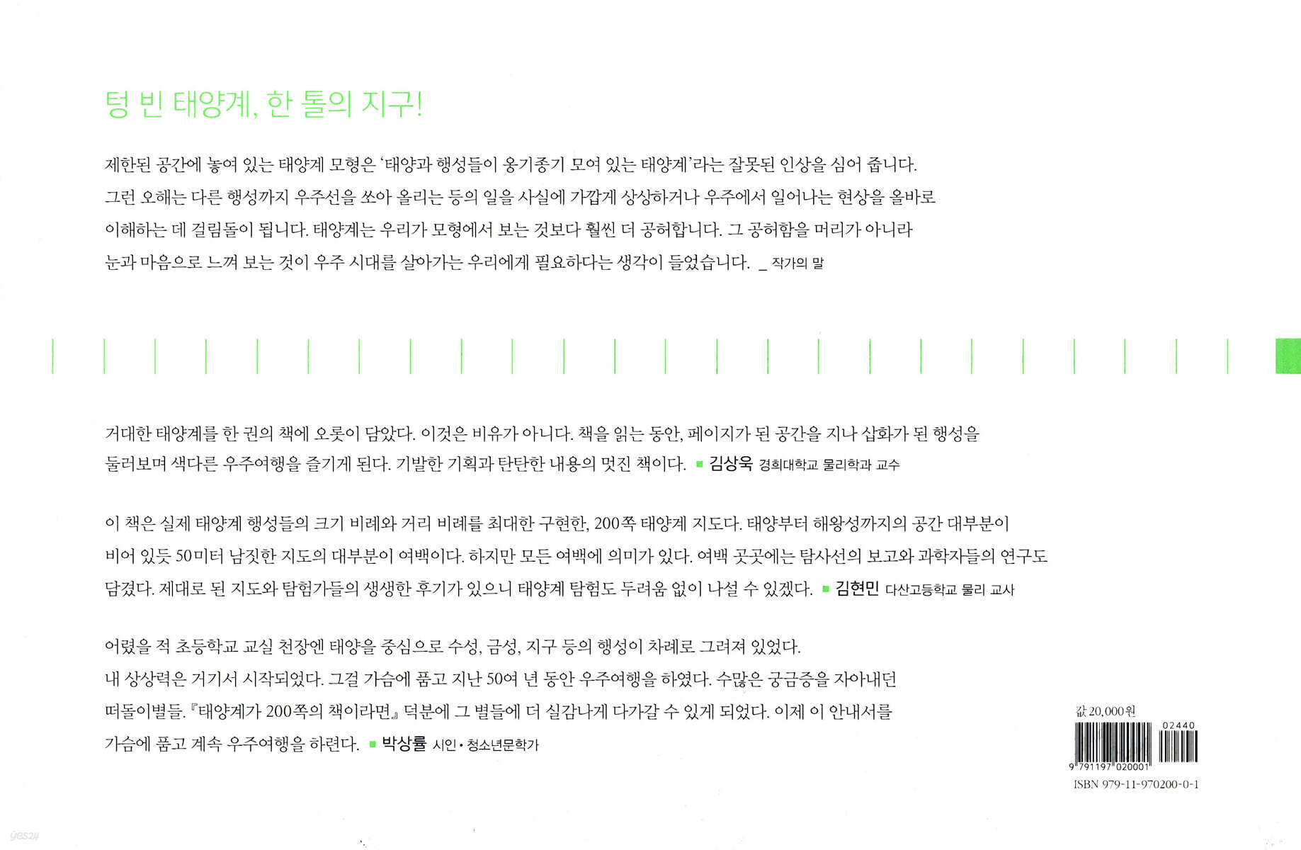 이 책은 실제 태양계 행성들의 크기 비례와 거리 비례를 최대한 구현한, 200쪽 태양계 지도다. 태양부터 해왕성까지의 공간 대부분이 비어 있듯 50미터 남짓한 지도의 대부분이 여백이다. 하지만 모든 여백에 의미가 있다. 여백 곳곳에는 탐사선의 보고와 과학자들의 연구도 담겼다. 제대로 된 지도와 탐험가들의 생생한 후기가 있으니, 태양계 탐험도 두려움 없이 나설 수 있겠다. - 김현민 (다산고등학교 물리 교사)