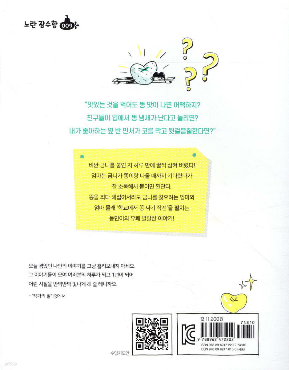 --- p.13 세상에나, 금니를 소독만 해서 그냥 붙여 준다니. 대장에서 똥과 함께 긴 여행을 한 금니, 아니 그 냄새 나는 똥니를 그냥 붙여 준다니! 맛있는 것을 먹어도 똥 맛이 나면 어떡하지? 음식 맛을 느끼는 건 냄새가 반이라는데, 뭘 먹어도 똥 냄새가 나면? 나는 평생 맛있는 음식도 먹지 못하고 빼빼 말라 갈 것이다. 친구들이 입에서 똥 냄새 난다고 놀리면 어떡하지? 승태 녀석은 분명히 “야, 똥민아! 네 입에서 똥내 난다. 네가 드디어 별명 값을 하는구나!”라고 놀릴 게 뻔하다. 내가 좋아하는 옆 반 민서가 코를 막고 얼굴을 찌푸리며 뒷걸음질하는 모습까지 상상하고 나니 이대로 가만히 있어서는 안 되겠다는 생각이 들었다. --- p.29~31 막상 변기 위에 앉자 이런저런 생각이 많아졌다. 엄마한테 미안한 마음이 컸다. 어제 화장실에서 그렇게 고생을 했는데 나 때문에 모두 헛수고가 된 것 같아서. 아니, 아니다. 마음을 독하게 먹어야 한다. 한번 붙이면 되돌릴 수 없다. 평생 놀림거리가 될 수도 있다! 그래도 금니 때문에 돈이 많이 들었는데……. 찾지 못하면 반값을 또 내야 하는데……. 가계부를 보며 한숨을 쉬는 엄마의 모습이 떠올랐다. 만약 물을 내리려고 하는데 똥 위에 금니가 보이면 어떡하지? 나를 데려가라는 듯이 반짝거리고 있으면? 그걸 꺼내야 하나, 말아야 하나? 혹시 모르니 지금이라도 나가서 긴 막대기를 찾아와……. “풍덩!” --- p.45 뭐라고? 똥구멍에 약을 넣는다고? 이게 혹시 엄마가 말한 ‘거짓말의 대가’인가? 갑자기 똥구멍이 주사를 맞은 것처럼 아파 온다. 겁먹은 엉덩이는 입을 꾹 다물었다. 내가 살다 살다 이런 무시무시한 소리는 또 처음 듣네. 무섭고, 더럽고, 창피하고, 서럽다! 너무 서러워서 그만 울음을 터뜨리고 말았다. “엄마. 사실은 학교에서 똥 쌌어요! 두 번이나 쌌어요! 엄마 미안해요. 똥 냄새 나는 똥니, 아니 금니를 붙이면 내 입에서 똥 냄새 난다고 친구들이 놀릴까 봐 그랬어요. 밥 먹을 때 똥 맛이 날까 봐 걱정돼서 그랬어요. 엄마, 거짓말해서 정말 죄송해요.” --- p.65 “어머니. 어머니께서 화장실에서 똥 검사를 하실 때 전 그걸 느꼈어요.” “뭐를 느꼈는데?” “똥 냄새보다 더 진한 어머니의 사랑!” “뭐야?” 엄마는 어이없다는 듯 아래위로 눈을 흘기며 콩 주먹을 들어 보였다. 그러면서 터져 나오는 웃음을 참으려고 입술을 꼭 다무셨으니, 이제 더 이상 잔소리는 안 하시겠지. --- p.70 |
