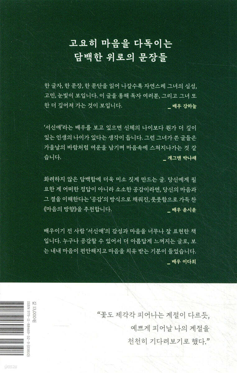 배우이기 전 사람 ‘서신애’의 감성과 마음을 너무나 잘 표현한 책입니다. 누구나 공감할 수 있어서 더 아름답게 느껴지는 글로, 보는 내내 마음이 편안해지고 마음을 치유 받는 기분이 들었습니다. - 이다희 (배우)