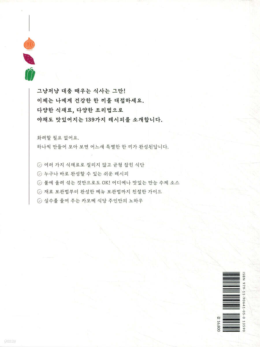1작은술, 1큰술, 1컵이 얼만큼인지부터 시작한다. 식재료와 만든 요리는 어떻게 보관하고 해동해야 하는지, 주의할 점, 달라지는 식감까지 설명한다. 한 번 만들면 다 먹지 못하고 버리는 게 더 많지 않을까 하는 걱정도 그만! 냉동 보관이 가능한 음식은 잘 보관했다가 필요할 때 꺼내 담으면 도시락을 훨씬 풍성하게 만들어 준다. 만들어 두었던 음식을 해동만 하면 되기 때문에 준비 부담도 확 줄어든다. 식어도 맛있는 도시락을 만드는 저자만의 비결을 쏙쏙 넣었다. 죄책감 없이 맛있는 식사 손수 준비하는 도시락을 어렵게 느끼는 이유 중 하나는 ‘먹고 싶은 도시락’이 잘 떠오르지 않기 때문이다. 몸에 대한 죄책감과 의무감에 야채를 숙제처럼 먹으려 준비한 샐러드는 식욕이 전혀 돌지 않고 배불리 먹어도 만족스럽지 못한 식사가 된다. 그래도 가장 만만한 볶음밥은 한두 번 먹다 보면 금세 질리기 일쑤다. 야채까지도 맛있게, 질리지 않고 먹을 수 있는 139가지 레시피를 담았다. 주변에서 구하기 편한 재료, 입에 맞는 레시피, 각자의 상황에 맞는 요리들을 모아 한 끼를 완성해 보자. 다양한 응용 레시피와 반찬 레시피까지 취향껏 활용하면 내 손으로 나만의 도시락을 커스터마이징할 수 있다. |