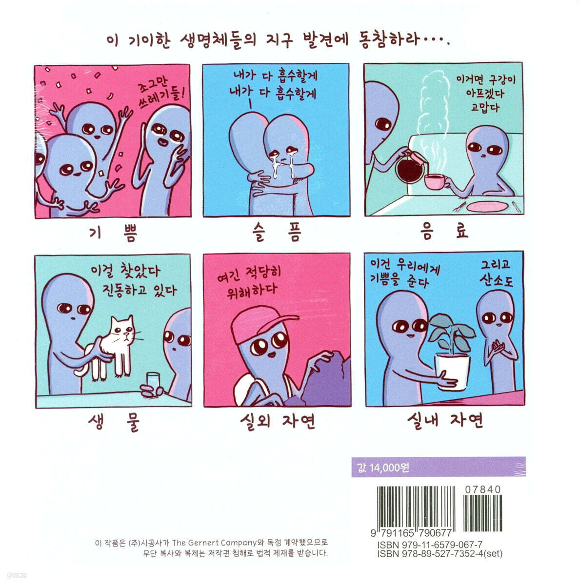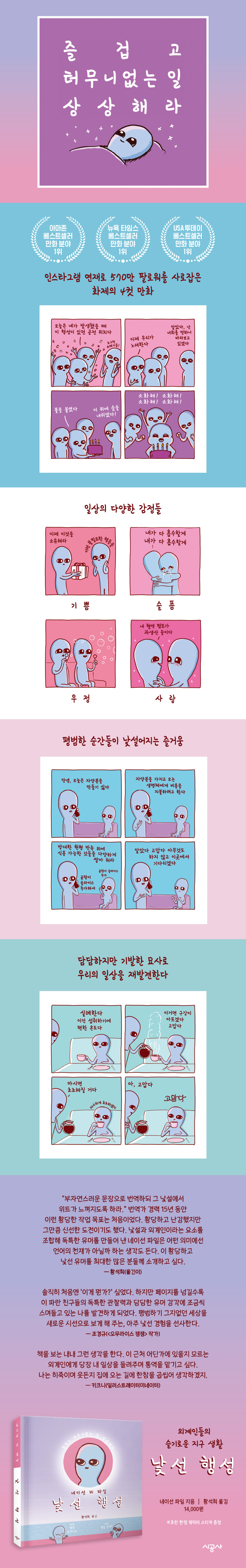 《낯선 행성》이 이렇게 많은 이들에게 사랑받을 수 있던 이유는 무엇보다 참신한 발상 덕분일 것이다. 정말로 외계인이 있다면 지구 인간들의 삶을 이런 식으로 바라봤을 법한 묘사를 통해 《낯선 행성》은 우리의 평범한 일상을 환기시킨다. 이들에게 꿈은 ‘반의식 상태에서의 상상’이며, 생일은 ‘네가 발생했을 때 이 행성이 있던 공전 위치의 날’이다. 언뜻 받아들이기에 너무 딱딱하고 공학적인 묘사 같지만 이들 캐릭터들의 모습을 보다 보면, 왠지 모르게 번지는 따뜻함을 발견하게 된다. 기이한 외계 생명체들의 낯선 시각이 우리의 평범한 일상 조각들을 특별하게 만들어 주는 기분이 들기 때문이다. 소소한 피식잼(?)이 확실히 보장되는 힐링 만화 우리는 살아가면서 습득하는 세상의 법칙들을 대부분 별 감흥 없이 받아들인다. 나이가 들수록 하루하루 크게 다를 것 없이 흘러가는 일상에서 새로움을 마주하는 기쁨은 희미해진다. 《낯선 행성》 속 외계인들은 다르다. 이들에게 인간들의 생활양식은 즐거운 발견의 연속이다. 아무런 편견 없이 시종일관 웃는 (것 같은) 얼굴로 너무도 평범한 일상을 즐거이 맞이한다. 그러는 사이 우리의 일상 역시 특별해진다. 현대 사회인으로서 겪으며 지내는 수많은 상황들이 보다 사랑스러운 시각으로 재편된다. 그렇기 때문에 《낯선 행성》을 읽다 보면 묘한 미소를 짓게 된다. 보통의 사건들이 낯설어지면서 발생하는 생경하고도 깜찍한 즐거움. 요란한 폭소는 아닐지라도, 피식피식 흘러나오는 소소한 웃음을 도무지 참기 힘들 것이다. 확실히 보장한다. |