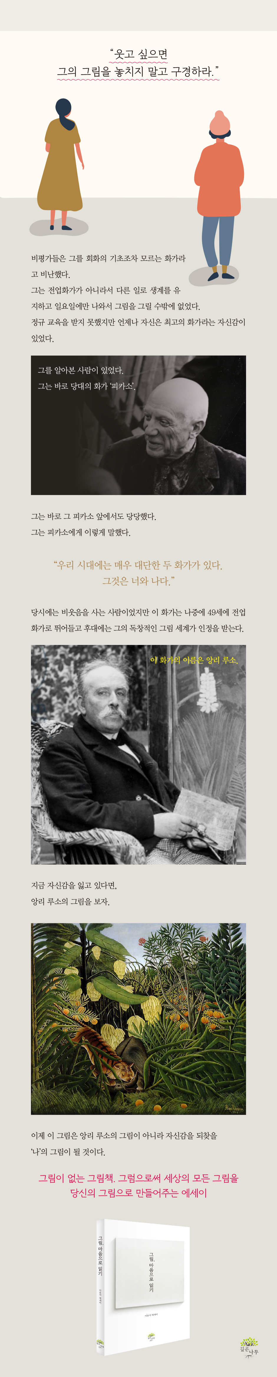 Chapter 1. 파블로 피카소와 같은 것을 바라보다 나에게 나를 묻다 | 어느 날 파랑 | 나의 청색시대 Chapter 2. 앙리 루소의 영혼처럼 굳세어라 길을 다듬다 | 다시 또 한 번 | 앙리 루소 | 루소의 밤 | 순박한 사람 | 친구 | 네가 하고 싶은 대로 하고 살아라 Chapter 3. 박수근의 시선을 따라가면 엄마의 꿈 | 여성을 소재로 그린 화가 | 박수근(1914~1965) | 독보적 미술 세계 Chapter 4. 요하네스 베르메르의 주인공처럼 조건 없는 행복 | 그림의 첫인상 | 일상이 그림처럼 아름다울 수 있다면 Chapter 5. 피에트 몬드리안과 성격 검사 정리 정돈이 필요해 | 피에트 몬드리안 | 나는 초록색이 싫더라 | 지혜로운 지식을 그림으로 담다 | 단순히 칠해진 것이 아니다 Chapter 6. 폴 잭슨 폴록의 부정형 삶 맨날 술이야 | 폴 잭슨 폴록| 사람이 쉽게 변할 수 있다면 | 자유로움 혹은 그 반대의 것 | 자국을 남기다 Chapter 7. 크리스토, 너무 거대해서 존재하지 않는 내 것이지만 내 것이 아닌 것 | 소유한다는 것 | 소유할 수 없는 그림 | 보여주는 미술 | 화가의 신념 | 꿈꾸듯 살고 싶다 Chapter 8. 클로드 모네의 시간 그리운 시간 | 나는 밖을 보지 않았다 | 모네 | 죽음이라는 이별 Chapter 9. 천경자의 외침을 듣다 미치도록 | 미치지 않고서야 | 독기를 품다 Chapter 10. 자크 루이 다비드가 원했던 것 당신 누구시오 | 소리치다 | 지나고 나서야 알게 되는 것들 | 야망을 가진 화가 | 싸워서 이겨야 할 이유 Chapter 11. 내 안에 있는 살바도르 달리의 세계 무의식과 의식 | 살바도르 달리 | 어떠한 영향이 이러한 성격을 형성했을까 | 무의식이 만들어내는 꿈 Chapter 12. 미켈란젤로 메리시 다 카라바조의 화 화를 다스리는 법 | 고통 | 미켈란젤로 메리시 다 카라바조 | 매일같이 화를 내던 사람 | <병든 바쿠스 신> | 회색빛 Chapter 14. 프란시스코 고야와 침묵을 깨뜨리다 당연한 어둠 | 침묵 | 고야 Chapter 15. 더 가치 있는 날이 오리라 믿은 빈센트 반 고흐처럼 자기암시 | 행동의 에너지 | 고흐의 소원 | 다시 시작을 위해서 epilogue |