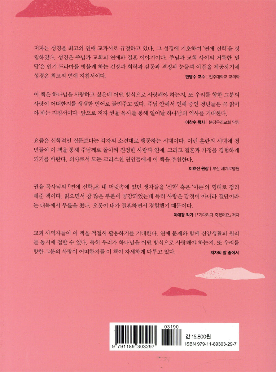 권율 목사님의 『연애 신학』은 내 머릿속에 있던 생각들을 ‘신학’ 혹은 ‘이론’의 형태로 정리해준 책이다. 읽으면서 참 많은 부분이 공감되었는데 특히 사랑은 감정이 아니라 결단이라는 대목에서 무릎을 쳤다. 오롯이 내가 결혼하면서 경험했기 때문이다. - 이애경 (『기다리다 죽겠어요』 저자)
