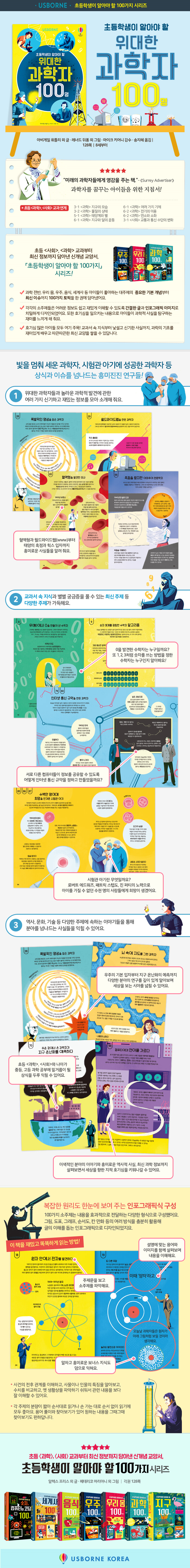 상식과 이슈를 넘나드는 흥미진진 연구들! 이 책은 ‘노벨상’을 받은 아주 유명한 과학자부터 최근까지 주목받지 못한 여성이나 비서구권 국가의 과학자들까지 위대한 과학자들이 이룬 세상이 놀랄 만한 발견에 관한 신기하고 재밌는 이야기가 담겨 있어요. 0을 발견한 수학자는 누구일까요? 또 1, 2, 3처럼 숫자를 쓰는 방법을 정한 수학자는 누구일까요? 서로 다른 컴퓨터들이 정보를 공유할 수 있도록 어떻게 인터넷 통신 규약을 정하고 만들었을까요? 생물을 분류하는 정리 체계는 누가 만들었을까요? 시험관 아기란 무엇일까요? 사람의 뇌는 어떻게 길을 찾을까요? 등 사람과 동물, 지구와 화석, 유전자와 우주의 기본 입자까지 이 세상에 관한 별별 궁금증을 풀 수 있는 다양한 주제들을 제시하고 관련된 사실을 간단히 알려 주지요. 100명의 과학자들의 연구를 따라가며 세상 구석구석을 살펴보면 과학에 대한 이해력과 탐구심을 기를 수 있어요. 또한 곤충의 한살이부터 지구 온난화의 예측까지 다양한 분야의 연구를 깊이 있게 알아보며 세상을 보는 시야를 넓힐 수 있어요. 빛을 멈추어 세우고, 엑스레이로 몸 안의 뼈를 볼 수 있게 되고, 공룡이 멸종한 원인을 연구하고, 사막을 푸르게 만드는 방법과 태양의 흑점을 관찰하고, 심장에서 피가 돌아나가는 과정을 알아내는 등 여러 주제에 대한 흥미로운 사실들을 알게 되지요. 새로운 지식을 배우고 지적 호기심을 키워 나갈 수 있는 매력적인 이야기가 가득하답니다. 이 책을 통해서 세상이 놀랄 만한 발견에 숨겨진 다양한 사실을 이해하고, 이를 통해 세상의 진리를 탐구하고 발견하는 지적 모험을 시작할 수 있어요. 초등 교과 과정에서 배우는 내용은 물론이고 역사적 사실과 최신 이슈까지 두루 살펴보면서, 미래를 준비할 꿈을 키울 수 있을 거예요. 추상 개념을 한눈에 알아보게 하는 인포그래픽식 구성 100명의 과학자에 관해 각각의 내용을 효과적으로 전달할 수 있도록 다양한 형식으로 구성했어요. 과학자들의 발견에 관한 여러 가지 사실을 다루는 매 페이지는 그림과 도표, 순서도, 칸 만화 등 여러 방식을 충분히 활용해서 글과 이미지를 효과적으로 전달하는 인포그래픽으로 디자인되었어요. 추상적인 개념을 시각적으로 표현하고, 각 개념의 상호관계를 다이어그램으로 그려 놓아서 관련 내용을 보다 쉽게 이해할 수 있어요. 한편, 100명의 이야기는 순서대로 읽어도 좋고, 손이 닿는 대로 읽어도 좋도록 2분의 1쪽에서 2쪽에 이르는 짧은 분량으로 실었어요. 부록으로 과학자들이 위대한 발견을 한 시기를 한눈에 알 수 있도록 연대표로 정리해 놓았어요. ‘용어 풀이’와 ‘찾아보기’가 있어 원하는 내용을 그때그때 찾아보기에도 좋답니다. |