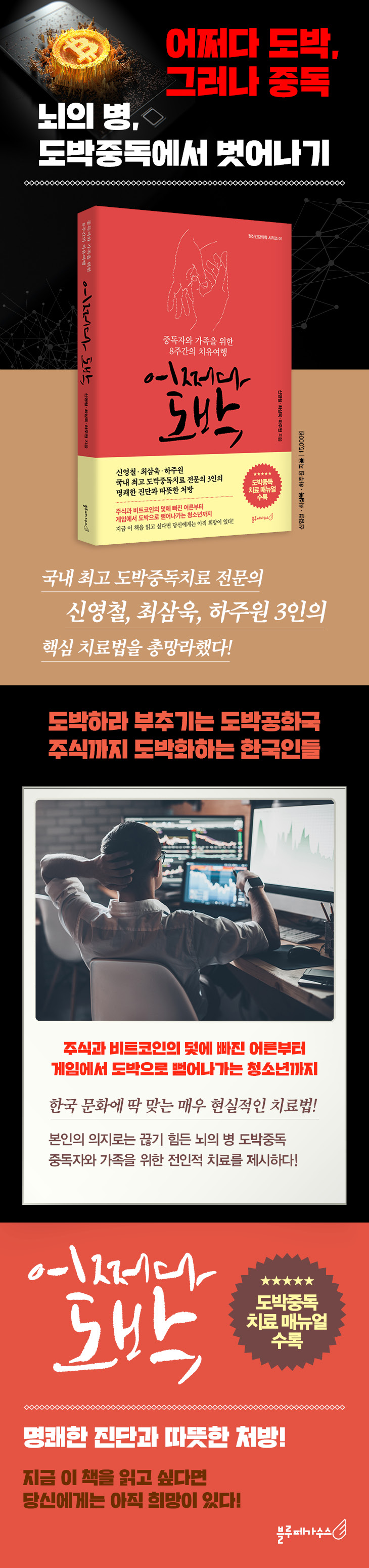 신영철·최삼욱·하주원 핵심 치료법 총망라! 중독자와 가족을 위한 전인적 치료로 도박중독에서 벗어나기 하루가 멀다 하고 발생하는 강력범죄의 이면에는 도박중독이 있다. 중독성이 짙은 도박은 대출사기나 폭력 등 2차 피해를 유발하여 심각한 사회문제가 되고 있다. 최근에는 도박, 온라인게임, 스마트폰, 음란물, 음주 등 행위중독이 크게 늘고 있는데, 이들이 서로 복합적으로 연계되고 있다는 점을 주목해야 한다. 행위중독 중에서도 도박중독은 아직 그 심각성이 사회적으로 충분히 인지되지 않고 있어 우려된다. 남녀노소 누구나 스마트폰으로 언제든 도박 사이트에 접근할 수 있는 것이 현실이다. 그만큼 도박이 우리 생활 속 깊숙이 침투한 것이다. 국내 도박시장 규모는 100조 원에 달하는데 이 중 불법도박이 80조 원을 차지한다. 불법도박 중에서는 불법스포츠도박이 25%(20조 원)로 가장 비중이 크다. 스마트폰 이용 빈도가 늘면서 최근 더욱 기승을 부리고 있다. 불법스포츠도박은 참여 금액에 제한이 없고, 전 세계 스포츠를 대상으로 24시간 운영되는 곳이 많다. 성인 남녀뿐 아니라 청소년에게까지 쉽게 노출되어 도박 당사자와 가족이 입는 피해가 심각한 수준에 이르렀다. 불법이든 합법이든 도박하는 사람들 대부분이 ‘어쩌다 도박’의 순간, 늪에 빠져들고 만다. 처음에는 그저 재미 삼아 한두 번 해보거나 아니면 게임이나 음란물에서 옮겨가는 식이다. 도박은 한 번 빠져들면 헤어 나오기가 힘들다. 심리적인 유혹뿐 아니라 돈 문제까지 얽혀 있어서다. ‘어쩌다’로 시작된 도박이 ‘중독’이라는 질병으로 이어진다는 데 문제의 심각성이 있다. 중독은 뇌의 반응이 바뀌는 ‘뇌의 병’이다. 중독이 뇌의 이상이기도 하다는 연구가 꾸준히 진행되어 오면서 치료 기법 또한 그에 따라 보다 정교해지고 있다. 이 책의 저자 3인은 도박중독 연구와 치료를 오랜 기간 해온 국내 최고의 도박중독 치료 전문의다. 한국의 도박중독 인구는 적게 잡아도 수십만 명이고, 치료를 받으러 오기까지 보통 10년이 넘게 걸린다고 한다. 질병인데도 질병으로 인식하지 못한 탓이다. 카지노, 경마, 경륜, 경정, 스포츠 토토, 로또, 소싸움 등 일곱 가지 도박이 합법적으로 운영되고 있고, 주식이 투자가 아닌 투기로 변질되어 도박화한 지도 오래다. 저자들이 문제의식을 갖는 중요 지점이다. 그뿐인가, 세계 최고 정보통신 강국에서 누구든 인터넷과 스마트폰 클릭 몇 번으로 도박에 쉽게 접근할 수 있다. 주식과 비트코인의 덫에 빠진 어른부터 게임에서 도박으로 뻗어나가는 청소년까지 남녀노소 모두가 타깃이다. 도박공화국이라는 오명을 쓸 만큼 사태가 심각함에도 그간 국내의 실정과 문화에 적합한 치료법을 제시한 도서가 없었다. 이 책이 반가운 까닭이다. 국내에 도박이 성행하기 훨씬 이전부터 도박중독 분야를 중점적으로 다뤄온 전문의 3인이 각종 효과적 인 치료 기법을 총망라하며 한국 문화에 딱 맞는 치료법을 제시했다. 3인의 저자들은 도박중독클리닉을 운영하며 15년여 간 수많은 도박중독자들을 만났다. 이 책은 저마다 사연도 고충도 다르지만, 똑같이 도박이라는 마수에서 헤어 나오지 못해 힘겨워했던 중독자와 가족들과 8주간 상담하고 치료하며 함께 울고 웃었던 기록이다. 저자들의 치료 과정이 함축된 ‘도박중독 치료 매뉴얼’과 ‘도움 받을 수 있는 기관’이 부록으로 수록되어 있어 당장 치료를 요하는 독자들에게 실용적 접근성을 높였다. 삶의 현장까지 침범해버린 도박 한국인은 주식까지 도박화한다 ‘국가가 앞장서서 도박을 부추긴다.’ ‘한국 사람들은 뭐든 도박화한다.’ 저자들이 우려하고 고민하는 사안이다. 강원랜드가 생기기 이전부터 도박중독을 연구하고 치료해온, 한국의 도박사(史)와 함께해온 저자들의 말에 주목할 필요가 있다. “과정보다는 결과를 중시하는 문화 속에서 빨리빨리 자신의 목표가 이루어지지 않으면 초조하고 불안해진다. 이러니 중독성을 띠는 초단타 매매가 성행할 수밖에 없다.”(본문 “주식은 도박인가?” 중에서) 임상에서 치료자가 가장 힘들어하는 대상은 누구일까? 저자들에 의하면, 바로 주식중독자들이라고 한다. 이제는 어디 주식뿐인가. 비트코인, 사다리, 파워볼 그리고 사설 FX마진거래까지, 도박의 대상에는 한계가 없는 듯하다. 이러한 국내의 현실에서 도박은 단지 중독자의 문제라고만 치부하기 어렵다. 한국에서의 도박중독 치료는 이 같은 사회적 분위기를 염두에 두어야 한다. 저자들은 최근에 도박과 관련해 점점 더 심화하고 있는 한국 특유의 사회현상과 더욱더 즉각적이고 자극적으로 진화한 신종 도박들까지 살펴본다. 아울러 지인과 가족을 포함한 한국인 특유의 관계성까지 복합적으로 고려해 진단하고 처방한다. 최근 들어 크게 사회문제화 되고 있는 여성과 청소년의 도박중독 문제의 이면도 고스란히 드러내 보인다. 이 책에서 소개하는 집단치료는 정신건강의학과 전문의와 심리전문가, 사회복지학을 전공한 분들을 비롯해 많은 전문가들이 실제 참관했고, 강좌나 워크숍, 심포지엄을 통해 전문가 그룹에 소개되었다. 