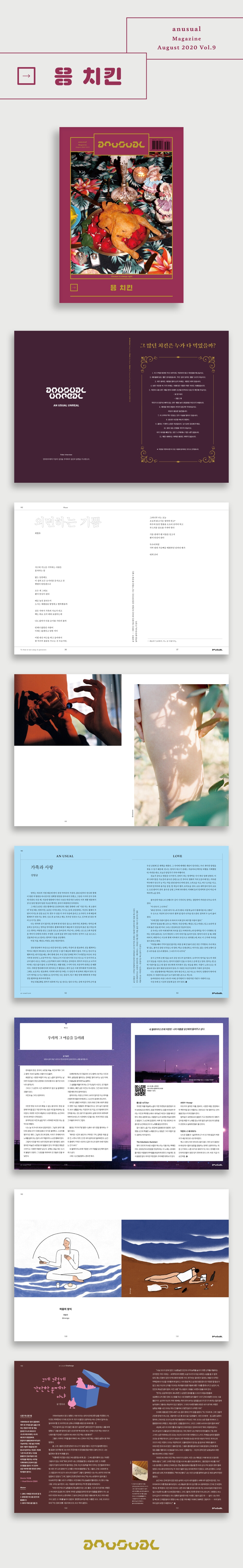 페이크 인터뷰에는 그동안 묵묵히 매거진을 만들어 왔던 언유주얼 에디터들의 목소리를 담았다. 기기묘묘한 치킨집의 분위기를 만끽하며, 본격적으로 매거진을 읽기 전 ‘나에게 치킨이란 무엇인가?’를 생각하는 마중물이 되기를 바란다. 기발한 상상력과 예상을 초월하는 전개로 독자들을 사로잡는 최제훈의 소설에서는 ‘날지 않는 새들의 모임’에 입회하기 위한 닭의 수모를 그린다. 닭을 둘러싸고 쏟아지는 비난과 찬사는 근사한 한 편의 블랙코미디를 방불케 한다. 웹 드라마 〈연애 플레이 리스트〉를 비롯해 다수의 히트작을 만들며 MZ 세대의 열렬한 지지를 얻은 드라마 작가 이슬의 소설에서는 치킨을 소재로 달콤하고 쌉싸름한 짝사랑이 그려진다. 여기에 비장함과 농담이 뒤섞인 신종원의 소설은 진정한 고차원의 유머가 무엇인지를 일깨우게 한다. 에세이는 그 어느 때보다 다양한 작가들을 만날 수 있다. 산문가로서도 완벽한 심보선 시인과 ‘떡볶이’하면 떠오르는 작가 백세희 작가의 글은 치킨이 우리에게로 오기 전인 ‘닭’에 대해 생각하게끔 만든다. 밀레니얼 세대의 기억 속에는 영화 〈집으로〉에서 치킨을 먹고 싶어 하던 상우(유승호)가 백숙을 마주하고 엉엉 우는 장면이 남아 있을 것이다. 그 〈집으로〉의 이정향 감독이 상우가 먹고 싶어 하던 치킨에 대해 글을 썼다. 언유주얼 9호의 시 지면은 황인찬, 최현우, 김동균 세 명의 시인이 함께했다. 세 편 모두 오래도록 다음 문장으로 나아가지 못하게 하는, 마음을 붙잡는, 아름다운 균열이 새겨진 작품들이다. ‘OO와 사랑’을 주제로 매거진의 키워드와는 독립적인 자리를 확보한 an usual Love에서는 영화 〈찬실이는 복도 많지〉로 올해 상반기 시네필들에게 인상 깊은 모습을 선보인 강말금 배우가 펜을 잡았다. 〈가족과 사랑〉이라는, 제목만으로 가슴 한구석이 뭉클해지는 이 에세이 한 편을 읽고 난다면 누구나 그의 팬이 되지 않을 수 없다. ‘치킨’이라는 음식에는 어떤 마력이 깃들어 있다. 치킨을 먹는 동안에는 그날 하루 겪었던 괴로움을 잠시 잊어버릴 수 있고, 아직 치킨을 사 먹을 수 있는 지갑 사정에 안심할 수 있다. 다 함께 모여 왁자지껄 먹는 치킨은 그 자체로 즐겁고, 치킨이 허락된 저녁이 있는 삶은 잠시나마 풍요롭게 느껴진다. 치킨에 대한 글로 꽉꽉 채운 언유주얼 9호 또한 당신에게 그런 만능감을 줄 수 있기를 바란다. |