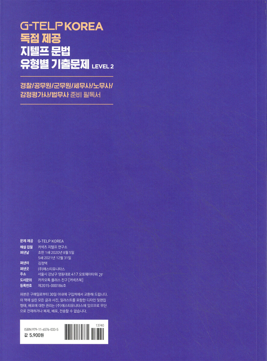 1. 지텔프 기출문제 최다 수록 지텔프 문법 영역 기출문제를 최다 7회분 수록하였습니다. 정기 시험 7회에 걸쳐 출제된 문제, 총 182문항을 빠짐없이 풀어봄으로써 문법 영역을 완벽하게 대비할 수 있습니다. 2. 철저한 ‘영역 & 유형’ 분석 지텔프 문법 영역 기출문제 7회분을 샅샅이 분석하고, 총 6개의 대유형과 21개의 세부 유형으로 분류하였습니다. 전반적인 영역 소개부터 세세한 유형 비교 분석까지, 지텔프 문법 영역의 모든 정보를 파헤쳐 심층적인 이해가 가능합니다. 3. 유형별 학습 (유형 소개 → 개념 → 문제) 유형별로 출제 경향 개요와 문제 풀이법을 확인하고, 시험에 반드시 나오는 핵심 문법 개념을 익힌 다음 기출문제를 풀어볼 수 있도록 구성하였습니다. 체계적/반복적/집중적인 유형 학습을 통해 출제 패턴과 공략법을 완전히 습득할 수 있습니다. 4. 강약 유형 진단 효율적으로 유형 학습하는 한 가지 방법은 먼저 자신의 취약 유형을 파악하는 것입니다. 강한 유형은 보강하고 취약 유형은 집중 공략하여 보완해야지만 문법 영역에서 고득점을 받을 수 있습니다. 본 교재는 먼저 기출문제 한 회분으로 자기 실력을 점검해서 취약 유형을 진단하고, 유형별 학습에서 취약 유형이라면 어떻게 대비해야 하는지 tip을 얻을 수 있도록 구성하였습니다. 5. 한눈에 보는 단서 & 상세한 해설 풀이 자세한 해설을 읽어도 정작 실질적인 정답 단서를 파악하지 못한다면 헛수고입니다. 본 교재는 정답과 단서를 직관적으로 볼 수 있도록 따로 제시하였고, 그 아래에 정답/오답 해설을 상세히 풀이하였습니다. [이 책이 필요한 학습자] - 실제 지텔프 기출문제로 완벽하게 대비하고 싶은 분들 - 문법에서 반드시 고득점을 받아야 하는 분들 - 자신의 강약 유형을 진단하고 유형별로 집중 관리하고 싶은 분들 - 경찰/공무원/군무원/세무사/노무사/감정평가사/법무사 준비를 하는 분들 [이 책의 활용법] - 진단 테스트를 도중에 중단하지 않고 처음부터 끝까지 실전처럼 풀어 봅니다. (Answer Sheet 활용) - 채점하고 맞힌/틀린 개수를 확인한 뒤, 강약 유형 진단표를 이용하여 자신의 취약 유형을 진단해 봅니다. - 유형별로 개념을 학습하고 기출문제를 반복해서 풀어 봅니다. 취약 유형은 해당 유형 학습의 내용을 특히 꼼꼼히 익히세요. |