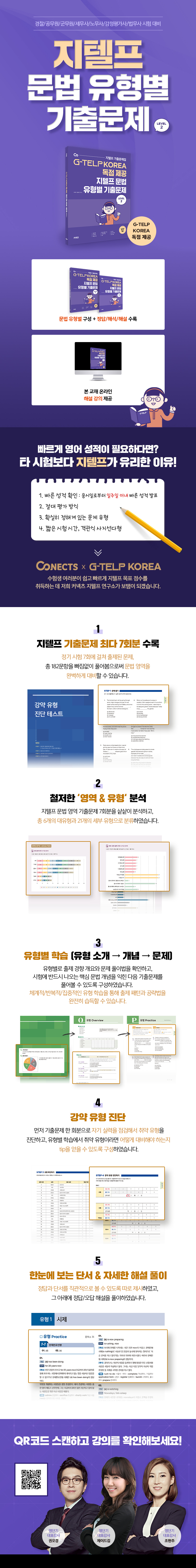 목차 이 책의 구성 이 책의 특장점 G-TELP 소개 G-TELP Level 2 소개 정기 시험 접수부터 성적 확인까지 학습 계획표 및 활용법 [특별 부속] 지텔프 문법 영역 A to Z 강약 유형 진단 테스트 유형 1. 시제 1-1 현재완료진행 1-2 현재진행 1-3 과거완료진행 1-4 과거진행 1-5 미래완료진행 1-6 미래진행 유형 2. 가정법 2-1 가정법 과거완료 2-2 가정법 과거 유형 3. 준동사 3-1 동사의 목적어: 동명사 & to부정사 3-2 동사의 목적어: 동명사 3-3 동사의 목적어/목적보어: to부정사 3-4 to부정사의 부사적 용법 유형 4. 조동사 4-1 can/could 4-2 may/might 4-3 must/should 4-4 will 4-5 조동사 should 생략 유형 5. 연결어 5-1 접속사/전치사 5-2 접속부사 유형 6. 관계사 6-1 관계대명사 6-2 관계부사 Answer Sheet | 책속책 | 정답 및 해석/해설 |