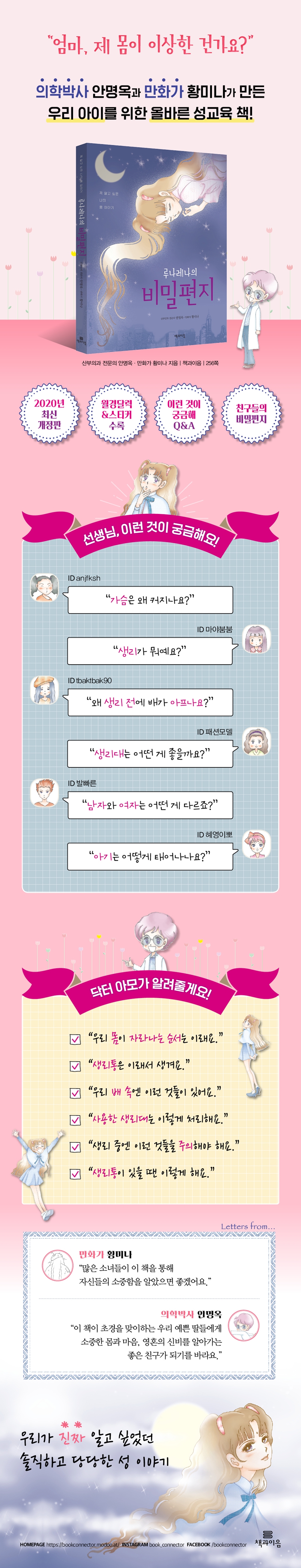 두 번째 메일|얘기 할 친구가 필요해 세 번째 메일|가슴에 몽우리가 생겼어 네 번째 메일|가슴은 왜 커지는 걸까? 다섯 번째 메일|브래지어 안 해도 괜찮지만 하려면 스포츠 브래지어를- 여섯 번째 메일|아악~~~~ 털이…!!! 일곱 번째 메일|우리 몸이 자라나는 순서는 이렇대 여덟 번째 메일|아악 팬티에 피가…!!! 아홉 번째 메일|생리가 시작된 거야 열 번째 메일|생리는 뭘까? 동영상 메일|공중 화장실 변기에 그냥 앉으면 안 돼요 열한 번째 메일|생리대는 어떤 게 좋을까? 동영상 메일|탐폰은 대체 어떻게 사용하는 것일까? 열두 번째 메일|내 남친이 옆집으로 이사 왔어^^ 열세 번째 메일|생리대가 없었을 땐 어떡했을까? 열네 번째 메일|생리대의 발명 열다섯 번째 메일|생리양이 많을 땐 이렇게~^^ 열여섯 번째 메일|생리 중엔 이런 것들을 주의해야 해 동영상 메일|생리피에서는 약간 비릿한 냄새가 나요 열일곱 번째 메일|팬티라이너 열여덟 번째 메일|팬티에 노란 것이? 열아홉 번째 메일|냉 스무 번째 메일|배가 아파 친구야~ 스물한 번째 메일|생리통 동영상 메일|생리통 스물두 번째 메일|진찰 받기가 겁나 스물세 번째 메일|갔다 왔어 병원에^^ 스물네 번째 메일|검사 결과가 나왔어 스물다섯 번째 메일|생리 전에도 아프네 스물여섯 번째 메일|너도 생리 전에 아프구나 스물일곱 번째 메일|생리전증후군 스물여덟 번째 메일|생리대 예쁘게 가지고 다니기 스물아홉 번째 메일|생리가 끝날 때는 갈색이 되는 게 자연스러운 현상 서른 번째 메일|남자애들이 놀려!! 서른한 번째 메일|미워 죽겠어 그 녀석… 서른두 번째 메일|엄마가 말씀하시길… 서른세 번째 메일|우리가 진짜 알고 싶었던 남자와 여자 이야기 동영상 메일|진짜 알고 싶었던 이야기 서른네 번째 메일|다른 친구들에게도 메일을 보내지 않을래? 서른다섯 번째 메일|다른 친구들한테서 메일이 많이 왔어^^ 서른여섯 번째 메일|내 이름은 달 이런 것이 궁금해|친구들의 질문과 닥터 아모의 대답 |
