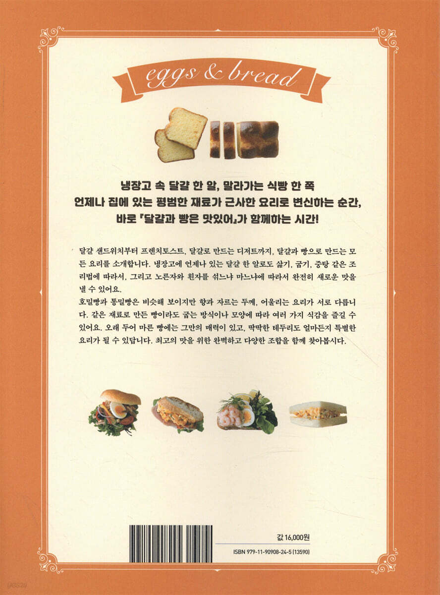 01 빵과 어울리는 기본 달걀 요리 삶은 달걀 / 달걀 샐러드 / 사워크림 달걀 샐러드 / 달걀조림 샐러드 / 달걀말이 / 맛국물 달걀말이 / 오믈렛 / 생크림을 넣은 오믈렛 / 스크램블드에그 【프라이팬 타입】 / 스크램블드에그 【중탕 타입】 / 달걀 프라이 / 포치드 에그 달걀로 만드는 소스 1 차가운 소스 마요네즈 달걀로 만드는 소스 2 따뜻한 소스 올랑데즈 소스 마요네즈 + 재료 응용하기 겨자 마요네즈 소스 / 간장 마요네즈 소스 / 아이올리풍 마요네즈 소스 / 루유풍 마요네즈 소스 / 오로라 소스 / 사워 마요네즈 소스 / 타르타르 소스 / 일본식 타르타르 소스 달걀로 만드는 크림 1 커스터드 커스터드 크림 + 재료 응용하기 마스카르포네 커스터드 / 생크림 커스터드 달걀로 만드는 크림 2 자바이오네 달걀에 관한 기초 지식 달걀 요리 도구 샌드위치의 기본 채소 다루는 법 02 달걀을 빵 사이에 넣으면 맛있어 삶은 달걀 × 식빵 기본 달걀 샐러드 샌드위치 / 매끈한 달걀 샐러드 샌드위치 / 대강 썬 달걀 샌드위치 / 둥글게 자른 달걀 샌드위치 재료 응용하기 달걀 샐러드 오이 통밀빵 샌드위치 / 달걀 샐러드 오이 호밀빵 샌드위치 / 대강 썬 오이를 넣은 달걀 샐러드 샌드위치 / 달걀 & 치킨 스틱 채소 샌드위치 / 달걀 & 콘 샐러드 샌드위치 / 달걀조림 샌드위치 / 허브 달걀 & 새싹 샐러드 샌드위치 / 허브 달걀 & 햄 믹스 샌드위치 / 둥글게 자른 달걀 & 햄 양상추 믹스 샌드위치 / 반으로 자른 달걀 & 햄 양상추 믹스 샌드위치 / 달걀 새우 브로콜리 통밀빵 샌드위치 / 달걀 연어 아보카도 호밀빵 샌드위치 달걀말이 × 식빵 재료 응용하기 군고구마 달걀말이를 넣은 건포도 식빵 샌드위치 / 매운 명란젓 파 달걀말이 샌드위치 맛국물 달걀말이 × 식빵 재료 응용하기 벚꽃새우 맛국물 달걀말이 샌드위치 / 게 파드득나물 맛국물 달걀말이 샌드위치 오믈렛 × 식빵 재료 응용하기 베이컨 시금치 오믈렛 샌드위치 / 카프레제 오믈렛 샌드위치 생크림을 넣은 오믈렛 × 식빵 재료 응용하기 트러플 버섯 오믈렛 샌드위치 / 연어 오믈렛 샌드위치 스크램블드에그 × 식빵 재료 응용하기 잔멸치 파 스크램블드에그 샌드위치 달걀 프라이 【턴 오버】 × 식빵 재료 응용하기 베이컨 에그 양배추 통밀빵 샌드위치 03 달걀을 빵에 얹으면 맛있어 스크램블드에그【프라이팬 타입】 × 식빵 재료 응용하기 누에콩 페코리노 스크램블드에그 토스트 달걀 프라이 × 식빵 재료 응용하기 크로크마담 달걀 프라이 【토스트 타입】 × 식빵 재료 응용하기 대파 달걀 프라이 토스트 카르보나라 달걀 프라이 토스트 포치드 에그 × 식빵 재료 응용하기 시저 샐러드 토스트 포치드 에그 & 그린 아스파라거스 토스트 빵을 바꿔서 에그 베네딕트 반생 삶은 달걀 × 식빵 스크램블드에그【중탕 타입】 × 식빵 04 달걀에 빵을 적시면 맛있어 프렌치토스트 × 식빵 재료 응용하기 생크림 커스터드를 곁들인 건포도 식빵 프렌치토스트 / 구운 바나나와 솔티드 캐러멜 소스를 곁들인 프렌치토스트 빵을 바꿔서 바타르 프렌치토스트 / 브리오슈 프렌치토스트 프렌치토스트【담가두는 타입】 × 식빵 조리법 응용하기 튀긴 프렌치토스트 / 오븐에 구운 프렌치토스트 재료 응용하기 오렌지 향 프렌치토스트 / 일본식 두유 프렌치토스트 / 황도와 라즈베리를 넣은 가토 프렌치토스트 / 카망베르와 사과를 넣은 프렌치토스트 그라탱 프렌치토스트 살레 × 식빵 재료 응용하기 프렌치토스트 살레 아침 식사 플레이트 / 몬테크리스토 샌드위치 / 햄 달걀 브로콜리 크로크 케이크 / 카프레제 프렌치토스트 그라탱 프렌치토스트 × 식빵 테두리 식빵 테두리 푸딩 05 달걀과 어울리는 여러 가지 빵 식빵 · 종류 식빵 · 달걀 샐러드와의 궁합 식빵 · 두께에 따른 조합 칼의 종류와 사용법 바게트 / 피셀, 반미, 바타르, 불 / 팽 드 캉파뉴, 팽 드 세글 / 로겐미슈브로트, 베를리너 란트브로트 / 크루아상, 팽 비에누아, 브리오슈 아 테트 / 브리오슈 낭테르, 판도로 / 쿠페빵 / 포카치아, 잉글리시 머핀 재미있게 자르는 법 빵 사이에 넣지 않는 달걀 샌드위치 / 달걀 프라이 토스트 【불로 만드는】 불 시저 샐러드 【피셀로 만드는】 피셀 외프 아 라 피페라드 06 달걀과 어울리는 세계의 샌드위치 일본 새우튀김 샌드위치 / 과일 믹스 샌드위치 싱가포르 온천 달걀을 곁들인 카야 토스트 베트남 달걀 프라이 반미 미국 B.E.L.T. 샌드위치 / 클럽 샌드위치 프랑스 팽 바냐 / 살라미 달걀 비에누아 샌드위치 덴마크 작은 새우 달걀 스뫼레브뢰 스웨덴 스뫼르고스토르타 07 빵과 어울리는 세계의 달걀 요리 미국 에그 슬럿 / 데블드 에그 프랑스 수플레 오믈렛 / 외프 마요네즈 / 리옹식 샐러드 / 니스식 샐러드 / 외프 앙 뫼레트 / 외프 아 라 피페라드 스페인 토르티야 / 살모레호 / 소파 데 아호 이탈리아 아쿠아코타 영국 스카치 에그 / 잉글리시 브렉퍼스트 독일 올랑데즈 소스를 곁들인 화이트 아스파라거스 / 저먼 포테이토를 곁들인 레버케제와 달걀 프라이 08 달걀과 빵으로 만드는 디저트 판도로와 자바이오네 / 판도로 베리 자바이오네 그라탱 / 아몬드 · 코코넛 튀일 러스크 / 브리오슈 과일 샌드위치 / 브