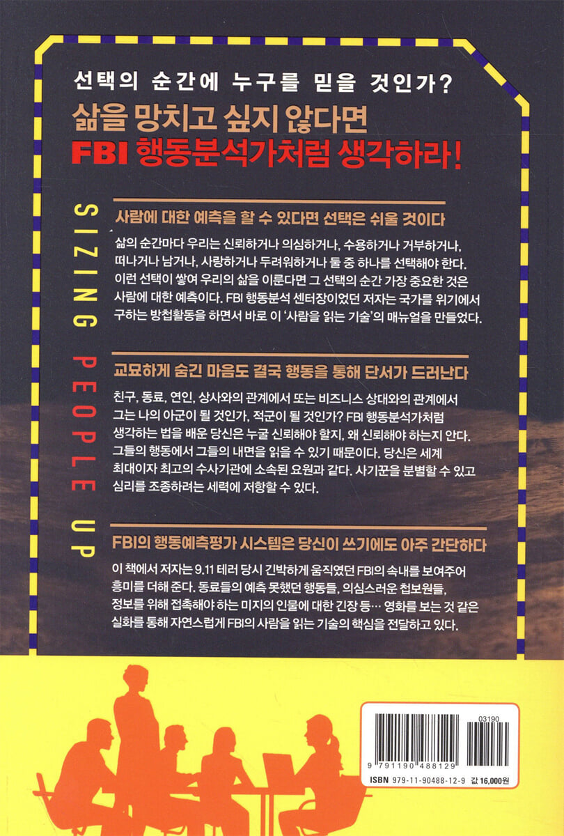 9.11 세계무역센터 테러가 일어난 날, 당시 FBI 요원이었던 저자는 긴박했던 상황에서 가장 잘 안다고 생각했던 동료들이 자신이 예상했던 것과 다르게 행동하는 것을 보게 된다. 곧 건물이 무너질 것을 알면서도 사람을 구하기 위해 건물로 뛰어들던 동료와 두려움으로 인해 슬그머니 사라지는 동료들을 전혀 예측하지 못했다. 또한 테러 용의자를 추적하고 국가 위기에 관한 첩보를 구하는 임무를 수행하는 과정에서 그는 사람을 제대로 읽는 것이 얼마나 중요한지 깨닫고, 중요한 상황에서 상대가 어떻게 행동할지, 왜 그런 행동을 하는지 예측하는 방법을 연구하여 직접 행동분석 프로그램을 만들었다. 누구나 한 번쯤은 다른 사람의 속임수와 거짓말을 경험한다. 만약 당신이 신뢰를 사탕처럼 쉽게 나누어 준다면, 당신의 소중한 것들을 쉽게 잃게 된다. 이런 일이 반복되면 우리의 의심은 깊어지고, 결정에 대한 두려움으로 죄 없는 사람들까지 멀리하게 된다. 그리고 결국 결정적인 순간이 오면 이성적인 판단보다 직감에 의지한 채 선택을 내리고 만다. 상대가 어떻게 행동할지를 예측한다는 것은 더 이상 인간관계로부터 상처받지 않을 수 있는 방법을 배우는 것과 같다. 당신은 사람들의 행동을 합리적으로 예측하고 신뢰함으로써 현명하고 자신감 있게 살아갈 수 있게 된다. 신뢰할 수 있는 사람과 뒤통수 칠 사람을 구별하는 최고의 도구 우리는 오래도록 신뢰의 기준을 ‘호감’이나 ‘도덕성’으로 삼아 왔다. 하지만 안타깝게도 많은 사람이 가까운 지인에게서 뒤통수를 맞는 경험을 한다. 저자는 인간 행동의 핵심을 이렇게 정의한다. ‘사람은 자신의 최선의 이익을 따라 행동한다.’ 따라서 상대가 무엇을 가장 우선시하는지 발견한다면, 당신은 그의 행동을 예측할 수 있다. 이제 사람을 읽고, 행동을 예측할 수 있는 6가지 신호를 배워 보자. 상대는 당신과의 관계가 장기적으로 이어질 것이라 기대하는가? 상대는 그 일을 해낼 만한 능력과 성실함을 모두 갖추고 있는가? 상대는 정서적인 안정감으로 감정적인 변수를 두지 않을 사람인가? 등등 단순하지만 강력한 6가지 예측 도구를 통해 당신은 누구를 믿을 수 있고 믿을 수 없는지 평가할 수 있다. 이는 또한 당신이 누군가에게 신뢰를 얻기 위한 도구로도 사용할 수 있다. 상대방과 함께하고 싶더라도, 당신이 신뢰할 만한 사람이어야 그 사람도 당신과 함께할 의지를 보일 것이다. 따라서 이 책의 6가지 신호를 자신에게 적용함으로써 상대에게 신뢰를 주고 함께할 만한 사람으로 자신을 바꾸어 나가는 데도 매우 유용하다. FBI 행동분석가처럼 사람 예측하기 인간관계에서 신뢰를 주고받는 일은 누구에게나 중요하고 주된 관심사지만, FBI 특수요원을 역임한 저자에게 이는 자신의 안위와 국가의 안보가 달린 결정적인 문제였다. 스파이를 색출하기도 하고, 이중스파이를 통해 정보를 캐내기도 하는 임무를 모두 맡아 온 그에게, 상대방의 심리를 읽고, 상대방의 행동 패턴을 읽고, 상대가 건넨 정보가 신뢰할 만한 것인지를 판단하는 일은 그의 인생이 걸린 문제와 같았다. 그런 그가 만든 행동예측 시스템이기에, 이 책에 담긴 도구들은 우리가 일상에서도 적용하기에 간단하면서도 매우 적절하고 유용하다. 이 책에서 저자는 9.11 테러 당시 긴박하게 움직였던 FBI의 속내를 보여주어 흥미를 더한다. 동료들의 예측 못했던 행동들, 의심스러운 첩보원들, 정보를 위해 접촉해야 하는 미지의 인물에 대한 긴장 등 영화를 보는 것 같은 실화를 통해 자연스럽게 FBI의 사람을 읽는 기술의 핵심을 전달하고 있다. |