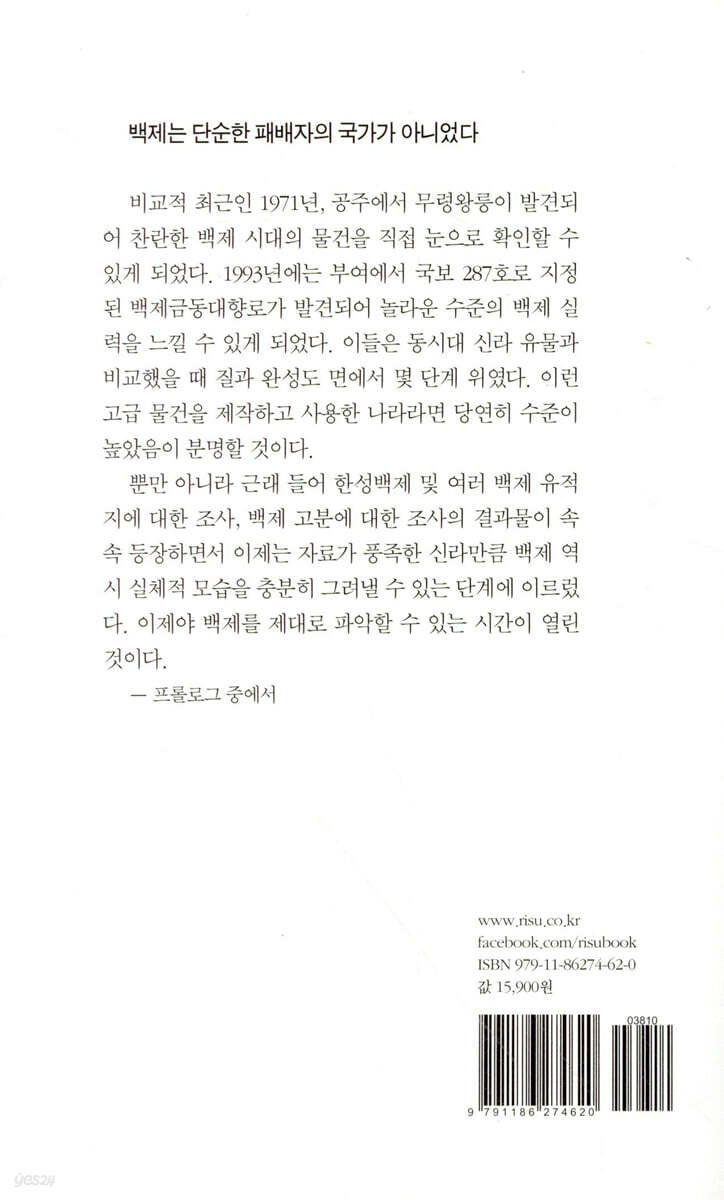 1. 한성백제를 찾아서 풍납토성 / 경당역사문화공원 /풍납백제문화공원 빌라 아래 백제 왕국이 있다 백제 초기의 성과 건물은 어떻게 생겼나 삼국사기보다 일본서기에 더 잘 묘사된 근초고왕 고급 문화를 이룬 백제의 비하인드 스토리 2. 한성백제박물관 몽촌역사관 / 한성백제박물관 몽촌역사관에서 백제의 민가를 확인한다 성을 쌓아올린 기술 백제가 이웃 나라에 하사한 물건들 한성백제 최고의 아이템, 금동관과 금동신발 3. 서울에도 고분이 있네 방이동 고분 / 석촌동 고분 불구대천의 원수가 된 백제와 고구려 방이동 고분은 백제, 신라 누구의 것인가 83세 장수왕이 백제와의 전쟁을 직접 지휘한 까닭 290기 중 8기만 남기고 사라져버린 석촌동 고분 4. 무령왕릉 수촌리 고분 / 송산리 고분 / 국립공주박물관 수촌리 고분에서 발굴된 유물의 의미 무령왕 내외가 사후 27개월 뒤에 합장한 까닭 무령왕 이전 무려 세 명의 왕이 암살되었다 유일하게 임무를 다한 무령왕릉의 진묘수 무령왕은 천수를 다했을까 5. 부여로 가자 대통사 / 관북리 유적 / 국립부여박물관 대통사는 실존하는 최초의 사찰이다 왜 이곳에 사찰이 지어진 것일까 공주에서 부여로 천도한 까닭은 주춧돌 등장! 기와로 수를 놓은 관북리 유적 한강 수복했다가 다시 빼앗기는 성왕 인생에 한 번은 꼭 만나야 하는 백제금동대향로 6. 정림사지 정림사지 5층 석탑 부여에서 1박 여전히 비밀이 많은 국보, 정림사지 5층 석탑 정림사지 가는 길에 있는 백제 가마터 석탑, 혁명적인 디자인 7. 익산의 백제 미륵사 / 왕궁리 5층 석탑 유네스코 백제역사유적지구 서동요의 주인공, 무왕과 익산 미륵사 미륵사지 석탑의 위용 왕궁리 유적의 신묘한 이야기 백제 탑 안에 통일신라 불상이 어떻게 들어 있나 에필로그 백제는 우리에게 어떤 나라였을까 참고문헌 찾아보기 |