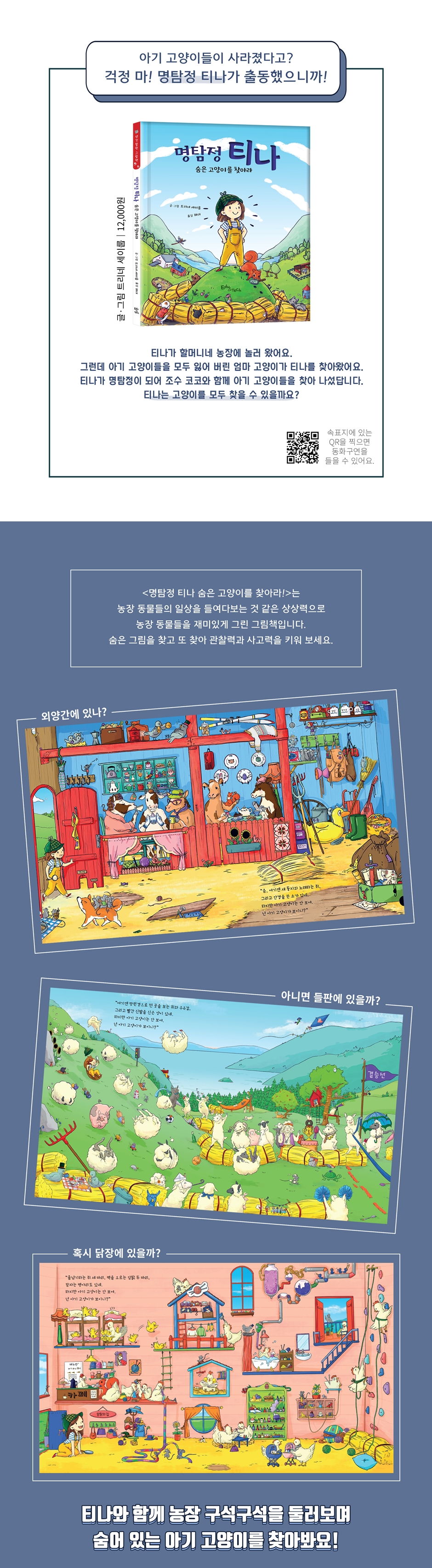 농장에는 동물이 많이 있습니다. 농장 동물이라고 하면 주로 소, 말, 돼지, 개, 고양이, 오리, 양 등을 생각하지요. 그런데 농장에 있는 이 많은 동물은 무엇을 하며 하루를 보낼지 생각해 봤나요? 소들은 아침에 따듯한 차를 마시고, 양들은 언덕에서 구르기 대회를 벌입니다. 닭장 안에서는 암탉들이 한창 실내 암벽 등반을 하고, 돼지들은 공놀이가 한창이지요. 『명탐정 티나 숨은 고양이를 찾아라』는 마치 농장 동물들의 일상을 들여다보는 것 같은 상상력으로 농장 동물들을 재미있게 그린 그림책입니다. 집중력과 사고력을 길러 주는 숨은그림찾기책 복잡한 그림 속에서 정답을 찾는 숨은그림찾기는 짧은 시간 동안 집중해서 그림을 살피는 활동이기 때문에 집중력을 기를 수 있습니다. 또한, 숨은 그림을 찾는 동안 관찰력은 물론 사고력이 자랍니다. 『명탐정 티나 숨은 고양이를 찾아라』는 스토리가 있는 숨은그림찾기책으로, 여러 번 들여다볼수록 더 큰 즐거움을 얻을 수 있습니다. |