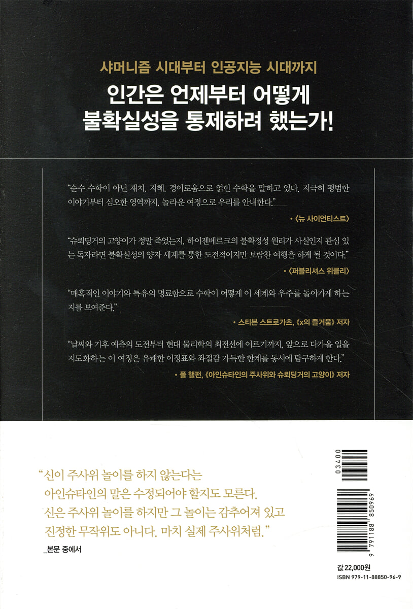 “날씨와 기후 예측의 도전부터 현대 물리학의 최전선에 이르기까지, 앞으로 다가올 일을 지도화하는 이 여정은 유쾌한 이정표와 좌절감 가득한 한계를 동시에 탐구하게 한다.” - 폴 핼펀 (『아인슈타인의 주사위와 슈뢰딩거의 고양이』 저자)