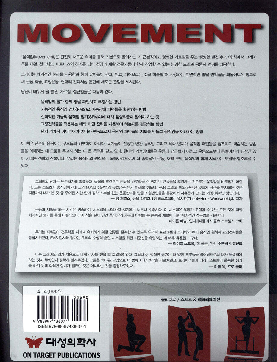 『움직임(Movement)』은 완전히 새로운 의미를 통해 기본으로 돌아가는 데 근본적이고 명쾌한 가르침을 주는 생생한 발견이다. 이 책에서 그레이 쿡은 재활, 컨디셔닝, 피트니스의 경계를 넘어 건강과 재활 전문가들이 함께 작업할 수 있는 분명한 모델과 공통의 언어를 제공한다.
