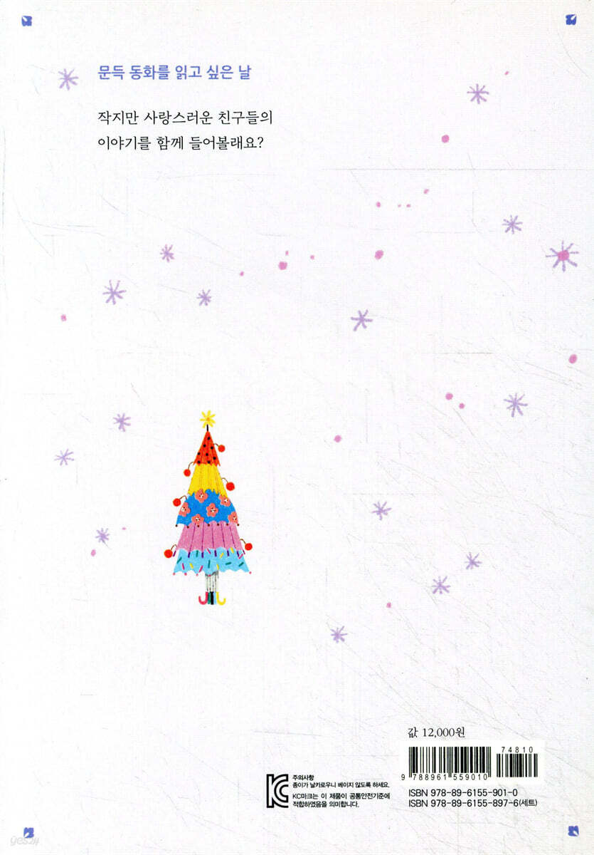 풀꽃 시인과 동화 작가들이 전하는 사랑의 메시지! 『작지만 사랑해』에는 변화된 가정의 모습을 잔잔하게 담아낸 이야기들이 있다. 말이 통하지 않는 미국인 부모에게 입양된 한국 아이를 품에 안고 승무원은 정다운 우리말로 ‘아가야’ 하고 달래 준다(나태주 ‘아가야’). 엄마 아빠가 이혼해서 할머니 집으로 온 정우는 그곳에서 새끼 강아지들을 살뜰히 살피는 ‘독구’를 만나고(장성자 ‘달님이 비춘 세상’), 미혼모인 엄마를 둔 남정이는 미술 시간에 그림을 그리다 자신의 엄마만 반지가 없다는 사실을 깨닫고, ‘절대 반지’를 만들어 엄마에게 선물한다(안선모 ‘절대 반지’). 그리움을 담은 이야기들도 눈에 띈다. 거센 파도로 엄마를 잃어버린 아기 소라게는 파도 소리에 엄마를 그리워한다(나태주 ‘소라게’). 바닷가 모래밭에서 ‘나’는 모래로 다양한 것들을 조각하는 아저씨를 만나고, ‘나’는 아저씨에게 돌아가신 아빠 사진을 보여 주며 조각을 부탁한다(우미옥 ‘모래 아빠’). 특히 ‘귀정이’의 귀정이는 나태주 할아버지의 어린 시절 추억을 담은 예쁜 아이이다(나태주 ‘귀정이’). 아이들에게 작은 사물도 소중하다는 메시지를 전하는 이야기들도 있다. 옆집에 사는 ‘벼락 아저씨’는 사람들이 안 쓰는 물건을 모아 멋진 예술품으로 재탄생시키고(안선모 ‘벼락 아저씨의 신기한 놀이터’), 투명 우산인 ‘나’는 내리는 비뿐 아니라, 아픔도 막아 줄 수 있는 존재가 되고 싶다(이현주 ‘나는 우산입니다’). 크리스마스 꽃이라고 불리는 ‘포인세티아’는 꼭 산타의 구멍 난 빨간 양말에 알프의 초록 양말이 더해져 있는 모양이다(임태리 ‘산타의 양말’). 세상의 모든 작은 존재들에게 ‘너는 그 자체로도 빛난다.’는 메시지를 주는 이야기도 담겨 있다. 사람들 앞에만 서면 소심해지는 다해는 어느 날, 과학실에서 발견한 마법 공에게서 용기를 얻는다(최이든 ‘주인공은 나야’). “당신의 행복은 어디에 있는가? 애당초 그것은 당신 안에 있었고 당신의 집에 있었고 당신의 가족, 당신의 직장 속에 있었다. 이제부터 당신은 그것을 찾기만 하면 되는 일이다.” ‘얘야, 네 둘레에 있는 것들을 아끼고 사랑해라’ 풀꽃 시인의 시 한 구절에서 시작된 ‘나태주 작은동화’ 나태주 시인의 등단 50주년을 맞이해 세상에 태어난 ‘나태주 작은동화’는 시인의 어머니가 하신 말씀을 담은 시의 한 구절에서 시작되었다. ‘어려서 어머니 곧잘 말씀하셨다 / 얘야, 네 둘레에 있는 것들을 아끼고 사랑해라 / 작은 것들 버려진 것들 오래된 것들을 / 부디 함부로 여기지 말아라’(나태주, ‘어머니 말씀의 본을 받아’ 중에서). 시인의 시선이 작고 연약한 존재에 머물면, 여린 존재는 비로소 자신의 존재 그대로를 존중받는다. 이것이 ‘엮은이의 글’에서 나태주 시인이 밝힌 사랑의 참의미인 것이다. 사랑은 ‘나’의 것만 소중히 여기는 것이 아니라, ‘너’의 것도 아껴주고 소중히 생각해 주는 마음이라고 시인은 노래한다. |
