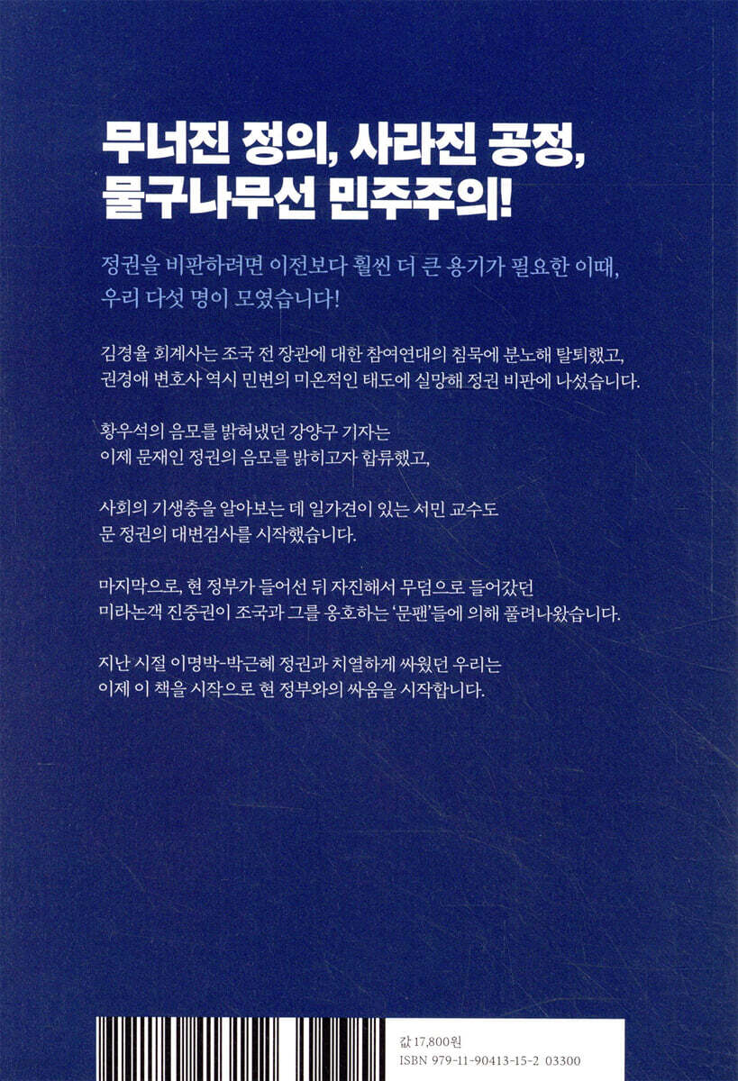- 강양구 “‘탄광 속의 카나리아’처럼 제 목소리를 내는 게 필요하다고 생각했습니다” - 권경애 “내 양심과 소신에 따라 하고 싶은 말과 해야 할 말을 하고 싶었습니다” - 김경율 “소금이 짠맛을 잃으면 안 되듯 감시의 눈빛을 거두는 순간, 있을 이유가 없는 것이죠” - 서 민 “사모펀드! 무지했는데, 대담을 통해 확실히 알게 되었습니다” - 진중권 “상식과 정의의 기반 자체가 무너졌어요. 이 변화를 어떻게 이해해야 할까요?” 정권을 비판하려면 이전보다 훨씬 더 큰 용기가 필요한 이때, 우리 다섯 명이 모였습니다! 김경율 회계사는 조국에 대한 참여연대의 침묵에 분노해 단체를 탈퇴했고, 권경애 변호사 역시 민변의 미온적인 태도에 실망해 정권 비판에 나섰습니다. 황우석의 음모를 밝혀냈던 강양구 기자는 이제 문재인 정권의 음모를 밝히고자 합류했고, 사회의 기생충을 알아보는 데 일가견이 있는 서민 교수도 문 정권의 대변검사를 시작했습니다. 마지막으로, 현 정부가 들어선 뒤 자진해서 무덤으로 들어갔던 미라논객 진중권이 조국과 그를 옹호하는 문팬들에 의해 풀려나왔습니다. 지난 시절 이명박-박근혜 정권과 치열하게 싸웠던 우리는 이제 이 책을 시작으로 현 정부와의 싸움을 시작합니다._「들어가는 말」에서 2. 다섯 명의 지식인들은 언제, 어떻게 만나게 되었을까 ― 이 기획의 경과 · 2020년 1월 28일 다섯 명의 대담 기획을 추진하기로 결정! 진중권 선생을 만났다. 대뜸 강양구 기자를 추천! · 2020년 1월 31일 강양구 기자 오후 미팅, 참여하겠다 답하면서 넌지시 권경애·김경율·서민 연락처를 알려주었다. · 2020년 1월 31일 진중권 선생 저녁 미팅, 부분적 참여를 결정하면서, 권경애 변호사 적극 추천! · 2020년 2월 3일 권경애 변호사 오후 미팅, 참여 승낙하면서 김경율 회계사가 함께 하면 좋겠다는 의견을 주었다. · 2020년 2월 5일 김경율 회계사 오후 미팅, 흔쾌히 참여 결정해주었다. · 2020년 2월 5일 서민 선생님은 문자 메시지로 소통, 네 분과 함께 할 수 있어 영광이라는 답신을 주었다. · 2020년 2월 5일 강양구·권경애·김경율·서민·진중권 다섯 분의 대담이 확정되었다. 2020년 2월 29일 토요일 오후 3~6시 첫 만남을 가졌다. 강양구·권경애·김경율·서민·진중권 다섯 명이 처음으로 만났다. 각자 SNS글로만 서로를 보다가 난생 처음 함께 대면하는 날이었다. 대담의 일정과 주제, 방식 등을 논의하였다. · 2020년 3월 7일 토요일 오후 1~6시 두 번째 만남부터 본격적인 대담을 시작하였다. 주제-미디어와 지식인|사회-서민|대담 강양구?진중권|김경율과 권경애는 참관하였다. 이 대담은 이 책의 1장과 2장이 되었다. · 2020년 3월 14일 토요일 오후 1~6시 세 번째 대담. 주제-586의 정치와 신보수|사회-강양구|대담 서민·진중권|김경율이 참관하였다. 이 대담은 이 책의 3장이 되었다. · 2020년 3월 21일 토요일 오후 1~6시 네 번째 대담. 주제-금융자본과 사모펀드|사회-진중권|대담 권경애·김경율|서민이 참관하였다. 이 대담은 이 책의 4장과 5장이 되었다. · 2020년 3월 28일 토요일 오후 1~6시 다섯 번째 대담. 주제-정치와 정의|사회-강양구|대담 권경애·김경율·서민·진중권. 이 대담은 이 책의 6장과 7장이 되었다. · 2020년 5월 9일 토요일 오후 1~6시 여섯 번째 대담. 주제-총선 이후의 변화|사회-강양구|대담 권경애·김경율·서민·진중권. 이 대담은 이 책의 6장과 7장이 되었다. · 2020년 7월 18일 토요일 오후 1~6시 일곱 번째 대담. 주제-금융자본과 사모펀드 보강 대담|사회-진중권|대담 권경애·김경율|강양구·서민이 참관하였다. 이 대담으로 이 책의 4장, 5장이 더욱 또렷하게 정리되었다. · 2020년 8월 15일 토요일 오후 1~6시 최종 원고 검토를 마쳤다. 3. 책은 어떤 내용으로 구성되었는가 ― 『한번도 경험하지 못한 나라』 주요 내용에 대하여 『한번도 경험해보지 못한 나라』는 대담집이다. 다섯 명이 모두 참여하는 것이 아니라 각자의 전문분야를 중심으로 한 명의 사회자를 두고, 전문가 두 명이 대담을 진행하였다. 이런 형식의 대담으로 만들어진 콘텐츠는 7개의 장으로 구성되어 체계적이고 종합적인 내용을 담을 수 있었고, 우리가 일상에서 경험하고 있는 ‘이상한 세계’의 실체를 드러낼 수 있도록 하였다. 1) 1~3장 - 미디어와 지식인 그리고 팬덤 정치 - 이 책의 1, 2, 3장은 미디어, 지식인, 정치 분야다. 20년 이상 현장에서 활동한 저널리스트 강양구, 디지털 사회의 미디어미학?철학 연구자 진중권, 날카로운 정치 풍자 지식인 서민 교수가 참여하였다. 2019년 8월의 조국 사태는 사회의 중요한 현안을 블랙홀처럼 빨아들였다. 청와대, 여당, 행정부는 물론 유사 매체와 어용 관변 세력까지 총동원하여 벌어진 이 상황에서 확인한 것은 ‘우리가 선출된 권력이니 우리 뜻대로 하는 것이 촛불정신’이라는 논리. 사회의 진보라는 것은 다름 아닌 “진보”를 자처하는 자기들 “진보”세력이 모든 권력을 잡는 것이라는 강박적인 태도. 미래 사회의 비전에 대한 토론과 합의는커녕 “청와대냐 검찰이냐”는 선택을 강요하고, 정의와 상식의 기준 자체를 바꿔버리는 언어도단과 “비상식의 상식화”를 