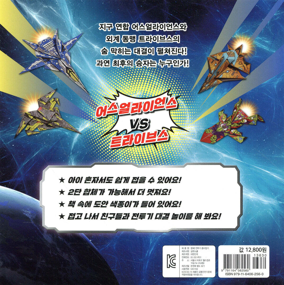 『합체! 전투기 종이접기』로 도전해 보세요! 종이접기는 아이들이 좋아하는 놀이면서 뇌 발달에도 좋아서 유치원이나 학교에서 적극 추천하는 놀이 활동입니다. 평소에는 잘 쓰지 않는 소근육을 사용하면서 뇌의 여러 영역을 자극하고, 집중력과 성취감을 키울 수 있지요. 또 2차원의 평평한 색종이를 3차원의 입체 모양으로 만드는 과정을 통해 공간지각력이 발달합니다. 딱지, 종이배, 동물, 자동차 등 기본 종이접기에 익숙해진 아이라면 평소 자기가 좋아하는 것들을 접는 주제 종이접기로 넘어가 보세요. 이 책은 우주, 기계, 전투, 비행기, 자동차 등을 좋아하는 어린이들을 위해 기획했답니다. 『합체! 전투기 종이접기』는 전문 페이퍼 엔지니어가 수년에 걸친 연구 끝에 완성한 책입니다. 기본 종이접기만 접을 수 있다면 혼자서도 쉽게 만들 수 있지요. 또 멋진 색감과 패턴 디자인을 입힌 부록 색종이로 접으면 진짜 장난감 못지않은 훌륭한 전투기를 완성할 수 있답니다. 다 접고 나서 가상의 우주 전투 놀이를 해 보세요! 전투기끼리 합체도 할 수 있어요! 책 속에 등장하는 총 28대의 우주 전투기들은 어스얼라이언스, 프리즘스타, 마가, 이렇게 세 종족으로 구성되어 있습니다. 종족별로 생김새와 기본 접기 방식이 완전히 달라서 여러 개를 접어도 지루하지 않고 접는 재미가 뛰어나지요. 또 각 전투기마다 역할, 특징, 배경 등이 정교하게 설정되어 있어 친구들과 함께 가상의 우주 전투 놀이를 할 수 있답니다. 총 28대의 우주 전투기들은 서로 합체해서 새로운 모습으로 변신할 수 있습니다. 변신 전투기까지 더하면 총 42가지의 우주 전투기를 만날 수 있는 거지요. 『합체! 전투기 종이접기』는 비행기와 전투기를 좋아하는 아이에게 최고의 선물이 될 것입니다. 56장의 도안 색종이로 접어서 멋진 우주 전투기 56대를 완성해요! 책 뒤에는 56장의 도안 색종이가 들어 있습니다. 전문 토이 디자이너가 어스얼라이언스, 프리즘스타, 마가, 이렇게 세 종족의 특징에 맞추어 색깔과 패턴을 정교하게 디자인했어요. 전투기를 모두 접어 종족별로 전시해 보세요. 다 완성된 모습은 정말 멋질 거예요. 각 전투기에 해당하는 도안 색종이는 2장씩 들어 있어 접다가 실패해도 한 번 더 도전할 수 있답니다. 또 색종이 자체에 점선 표시가 되어 있어 책만 보면 헷갈리는 부분도 쉽게 접을 수 있지요. 전투기 접기에 익숙해지면 나중엔 일반 색종이로도 전투기를 완성할 수 있습니다. 전투기에 직접 무늬를 그려 넣어 세상에 하나뿐인 나만의 전투기를 완성해 보세요. |