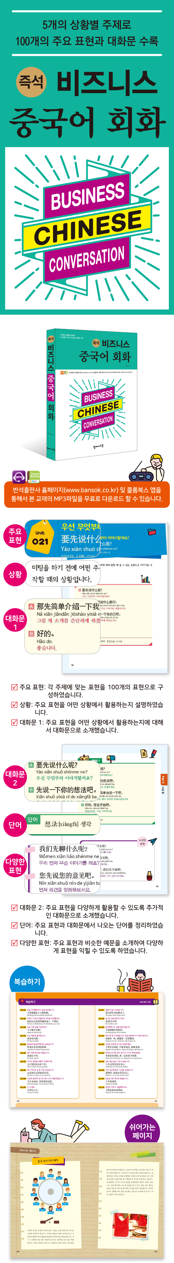 Unit 001 마중 나와 주셔서 감사드립니다. Unit 002 오시느라 수고하셨습니다. Unit 003 오래간만입니다. Unit 004 제 명함입니다. 만나서 반갑습니다. Unit 005 저는 중국 시장을 담당하고 있습니다. Unit 006 저는 영업부에서 일합니다. Unit 007 말씀 많이 들었습니다. Unit 008 앞으로 잘 부탁드립니다. Unit 009 제가 어떻게 호칭을 해야 할까요? Unit 010 이분은 영업부 부장님이십니다. Unit 011 메일로만 인사를 드리다가 직접 인사를 하게 됐네요. Unit 012 폐사에 대해 간단하게 소개를 드리겠습니다. Unit 013 귀사에 대해 간단히 소개 좀 해주시겠어요? Unit 014 우선 저희 직원들을 소개하겠습니다. Unit 015 저희 제품에 대해 소개하겠습니다. Unit 016 짧은 시간이었지만 매우 유익한 자리였습니다. Unit 017 이 기간 동안 덕분에 잘 있다가 갑니다. Unit 018 제가 차를 보내 모시도록 하겠습니다. Unit 019 전 여기서 이만 인사를 드리겠습니다. Unit 020 앞으로 자주 연락했으면 좋겠습니다. 복습하기 쉬어가는 페이지 중국의 꽌시가 의미하는 것 Part 2 미팅 중 Unit 021 우선 무엇부터 이야기할까요? Unit 022 오늘 일정에 대해 먼저 말씀드리겠습니다. Unit 023 요즘 일은 어떠신가요? Unit 024 그것은 사장님과 상의를 해봐야 할 것 같아요. Unit 025 이 부분은 우선 상황을 보고 다시 이야기하죠. Unit 026 귀사에서 보낸 메일은 이미 받았어요. Unit 027 샘플은 조만간 보내겠습니다. Unit 028 그 부분은 영업부에서 협상을 하고 있습니다. Unit 029 서로 협력해서 함께 발전합시다. Unit 030 다음 미팅은 언제인가요? Unit 031 잠깐 쉬었다가 다시 진행하시죠. Unit 032 우리 서로 양보하죠. Unit 033 현재 T/T로 15일입니다. Unit 034 신용장은 개설하셨나요? Unit 035 제가 책임지고 결정하겠습니다. Unit 036 원하시는 계약조건은 있으신가요? Unit 037 내일 바로 계약하시죠. Unit 038 이야기하는 김에 이번 내용의 세부사항도 같이 이야기하시죠. Unit 039 저희는 어쩔 수 없이 가격을 올려야 합니다. Unit 040 오늘은 여기까지 하겠습니다. 복습하기 쉬어가는 페이지 결제방식의 종류 Part 3 업무 중 Unit 041 회의 시간이 바뀌었네요. Unit 042 지금 회의 중인데 누구시죠? Unit 043 돌아오면 연락하라고 하겠습니다. Unit 044 죄송한데 이메일 주소 좀 알려주시겠어요? Unit 045 제가 문자 드릴게요. Unit 046 지금 밖인데 회사에 들어가서 다시 연락드릴게요. Unit 047 오늘까지 마무리 지어야 돼요. Unit 048 혹시 시간되면 도와줄 수 있나요? Unit 049 이 일에 대해서는 해결을 해주셔야 할 것 같은데요. Unit 050 이 자료 좀 복사해주실래요? Unit 051 일은 할 만하세요? Unit 052 업무 스트레스는 많지만 제 일을 좋아합니다. Unit 053 보통 몇 시에 출근해서 몇 시에 퇴근하시나요? Unit 054 중국 고객이 많으신가요? Unit 055 자료 준비 잘 되었나요? Unit 056 출장은 얼마나 자주 가나요? Unit 057 출장 결과는 어땠어요? Unit 058 야근은 자주 하시나요? Unit 059 스트레스는 어떻게 푸세요? Unit 060 회식은 주로 어디에서 하시나요? 복습하기 쉬어가는 페이지 고객과 소통 시 꼭 기억해야 할 표현 Part 4 출장 중 Unit 061 어떤 항공편이죠? Unit 062 창가 쪽 자리로 주실 수 있나요? Unit 063 다른 것 더 필요하신 게 있나요? Unit 064 기사님, 트렁크 좀 열어주시겠어요? Unit 065 기사님, 거기까지 얼마나 걸리나요? Unit 066 영수증 좀 주시겠어요? Unit 067 제 것은 큰돈인데 혹시 잔돈 있으세요? Unit 068 제가 유심칩을 사려고 하는데요. Unit 069 제가 예약한 방에 조식 포함되나요? Unit 070 방에 인터넷 되나요? Unit 071 방 카드를 잃어버렸는데 어떡하죠? Unit 072 이 근처에 갈 만한 곳이 있나요? Unit 073 어디에서 마사지 받을 수 있을까요? Unit 074 제가 이 짐을 여기에 좀 맡겨도 될까요? Unit 075 체크아웃하려고 합니다. 이것은 제 룸 카드입니다. Unit 076 제가 하루 더 방을 연장해도 될까요? Unit 077 보증금은 취소 처리가 되었지요? Unit 078 체크아웃할 때 같이 계산해주세요. Unit 079 제가 방에 짐을 두고 온 것 같아요. Unit 080 공항까지 가려면 어떻게 해야 할까요? 복습하기 쉬어가는 페이지 대사관 및 비상 연락처 Part 5 식사 중 Unit 081 오늘 초대해주셔서 정말 감사합니다. Unit 082 저희가 이곳에 조촐하게 자리를 마련했어요. Unit 083 오늘 어떤 술을 마실까요? Unit 084 저는 백주를 좋아합니다. Unit 085 한국요리를 좋아한다고 들었습니다. Unit 086 제가 건배 제의를 하겠습니다. Unit 087 우리의 합작을 위해서 건배하시죠. Unit 088 제가 먹어본 것 중 가장 맛있습니다. Unit 089 다음에 한국에 오시면 제가 식사 대접하겠습니다. Unit 090 더 드세요. Unit 091 충분히 많이 먹었습니다. Unit 092 음식은 입에 맞으시나요? Unit 093 환대해주셔서 정말 감사드립니다. Unit 094 제가 한 잔 드리겠습니다. 항상 돌봐주셔서 감사드립니다. Unit 095 언제든 한국에 오시면 연락주세요. Unit 096 한국에 오시면 제가 모시고 가이드 해드릴게요. Unit 097 오늘 정말 좋은 시간 보냈습니다. Unit 098 저도 덕분에 좋은 시간을 보냈습니다. Unit 099 오늘은 제가 한 턱 내겠습니다. Unit 100 당연히 저희가 대접해야지요. 복습하기 쉬어가는 페이지 중국 식사 자리 배치 |