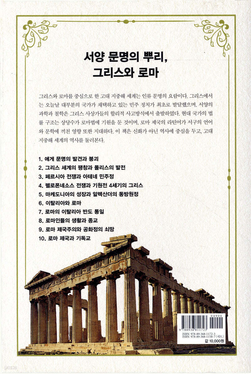 2. 그리스 세계의 팽창과 폴리스의 발전 3. 페르시아 전쟁과 아테네 민주정 4. 펠로폰네소스 전쟁과 기원전 4세기의 그리스 5. 마케도니아의 성장과 알렉산더의 동방원정 6. 이탈리아와 로마 7. 로마의 이탈리아 반도 통일 8. 로마인들의 생활과 종교 9. 로마 제국주의와 공화정의 쇠망 10. 로마 제국과 기독교 |