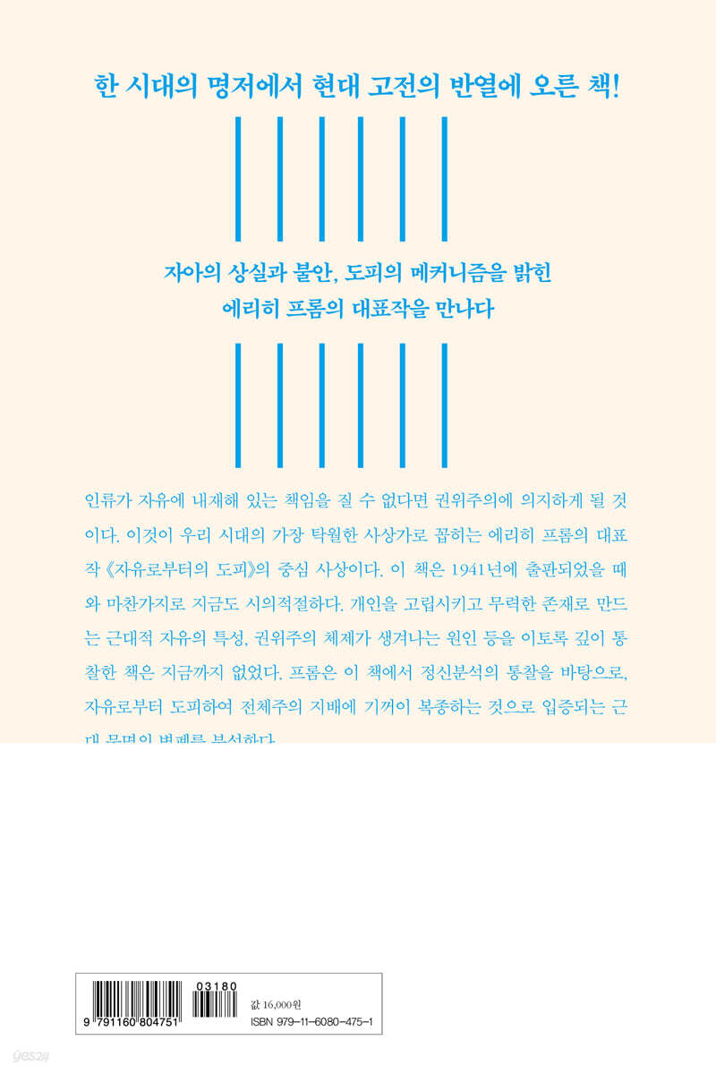 『소유냐, 존재냐』, 『사랑의 기술』 등을 통해 수많은 독자에게 사랑받고 있는 철학자이자 심리학자 에리히 프롬의 『자유로부터의 도피』가 번역가 김석희의 정확하고 유려한 번역으로 태어났다. 널리 알려져 있듯 『자유로부터의 도피』는 에리히 프롬의 대표작으로, 30여 개국에서 출간되었으며 전 세계에 500만 부 이상이 판매되었다. 최초의 한국어판 정식 계약본으로 2012년 7월 초판이 출간된 휴머니스트 출판사의 『자유로부터의 도피』 번역본은 에리히 프롬의 육성과 숨결을 가장 잘 살려냈다는 평가를 받으며 인문 분야의 스테디셀러로 자리 잡았다. 이 책은 기존에 출간된 『자유로부터의 도피』 번역본의 판형과 표지 디자인을 바꾼 리커버판으로, 80년 동안 사랑받아온 우리 시대의 고전을 독자들에게 새롭게 선보이고자 한다. 현대인의 정신적 상황에 대한 강력한 통찰 『자유로부터의 도피』는 중세 사회의 붕괴로 생겨난 인간의 불안이라는 현상을 분석한 책이다. 중세 사회에는 많은 위험이 존재했지만, 인간은 그 안에서 보호를 받으며 안전하다고 느꼈다. 수백 년 동안 열심히 노력한 끝에 인간은 꿈도 꾸어보지 못했던 물질적 부를 쌓아올리는 데 성공했다. 인간은 세계 곳곳에 민주주의 사회를 건설했고, 최근에는 전체주의의 새로운 책동에 맞서 자신을 지키는 데 성공했다. 하지만 『자유로부터의 도피』에서 저자 에리히 프롬이 분석하여 보여주려는 것은 근대인이 아직도 불안하다는 것이다. 불안한 인간은 온갖 부류의 독재자들에게 자신의 자유를 넘겨주거나, 스스로 기계의 작은 톱니가 되어 호의호식하지만, 자유로운 인간이 아니라 자동인형 같은 인간이 되고 싶은 유혹에 사로잡힌다. 두 개의 길 자유는 근대인에게 독립성과 합리성을 가져다주었지만, 또 한편으로는 개인을 고립시키고 그로 말미암아 개인을 불안하고 무기력한 존재로 만들었다. 그 세계에서의 모든 사람과 모든 사물이 도구화되었고, 그는 자기 손으로 만든 기계의 일부가 되어버렸다. 그는 자기가 생각하고 느끼고 원해야 한다고 믿는 것을 생각하고 느끼고 원한다. 바로 이 과정에서 그는 자신의 자아를 상실하지만 자유로운 개인의 진정한 안전은 모두 그 자아에 바탕을 두어야 한다. 개인이 고립에서 벗어나려면, 자유라는 무거운 부담을 피해 다시 의존과 복종으로 돌아가거나 아니면 인간의 독자성과 개인성에 바탕을 둔 적극적인 자유를 실현하는 방향으로 나아가거나, 둘 중 하나를 택해야 한다. 그중 하나의 길을 통해서 그는 ‘적극적인 자유’로 나아갈 수 있고, 사랑과 일 속에서 자신의 감정적·감각적·지적 능력을 진정으로 표현하면서 바깥 세계와 자연스럽게 관계를 맺을 수 있으며, 그리하여 자신의 개체적 자아의 독립성과 본래의 모습을 포기하지 않고도 인간과 자연 및 그 자신과 다시 일체가 될 수 있다. 그에게 열려 있는 또 하나의 길은 뒤로 물러나 자신의 자유를 포기하고, 그의 개체적 자아와 세계 사이에 생겨난 간격을 제거함으로써 자신의 외로움을 극복하려고 애쓰는 것이다. 이 두 번째 길은 그가 ‘개인’으로 결합되기 전과 같은 방식으로 세계와 그를 다시 통합시키지 못한다. 그와 세계의 분리는 결코 되돌릴 수 없는 일이기 때문이다. 이 두 번째 길은 참을 수 없는 상황에서 벗어나는 길이다. 그 상황이 오래 계속되면 도저히 살 수가 없기 때문에 거기에서 도피하는 것이다. 따라서 이 두 번째 길을 특징짓는 것은 그 강박적인 성격이다. 또 다른 특징은 개성과 자아의 본모습을 완전히 포기하는 것이다. 인간은 이제 더는 자기가 만든 세계의 주인이 아니다. 반대로 인간이 만든 세계가 그의 주인이 되었다. 심리학적인 각도에서 자유의 문제에 접근하다 프롬이 서 있는 심리학적 입장은 이른바 신프로이트학파 또는 프로이트 좌파라고도 불린다. 간단히 말하면 신프로이트학파는 사회학화된 프로이트주의다. 프로이트는 리비도를 생물학적이고 성욕에 뿌리를 둔 근본 충동으로 가정하고 있지만, 신프로이트학파에서는 사회적인 인간관계 속에서 형성되는 충동이나 욕구를 상정함으로써, 프로이트의 모든 것을 성으로 뒤덮어버리는 범성주의(汎性主義)를 극복하고 있다. 이런 극복을 통해 프로이트의 천재적 통찰을 충분히 살리는 동시에 프로이트의 사회적 반동성을 극복할 수도 있었던 것이다. 역사를 움직이는 힘은 과연 무엇인가? 프롬에 따르면 그것은 사회경제적 조건, 이데올로기 그리고 마지막으로 ‘사회적 성격’이다. 이 사회적 성격이라는 개념을 새로 제시한 데 이 책의 큰 매력이 있다. 이것은 ‘부록’으로 딸린 ‘성격과 사회 과정’에 자세히 나오지만, 여기에서 세 명의 거인 사상가인 마르크스, 막스 베버, 프로이트를 인용하고 있는 점에 유념해주기 바란다. 말할 것도 없이, 역사를 움직이는 최종적인, 또는 특히 유력한 요인으로서 사회경제적인 것을 생각한 사람은 마르크스이고, 이데올로기적인 것을 생각한 사람은 베버이고, 인간의 심층 깊숙한 곳에 있는 근원적 충동(여기에서 개성이라는 개념과 사회적 성격이라는 개념이 생겨난다)을 생각한 사람은 프로
