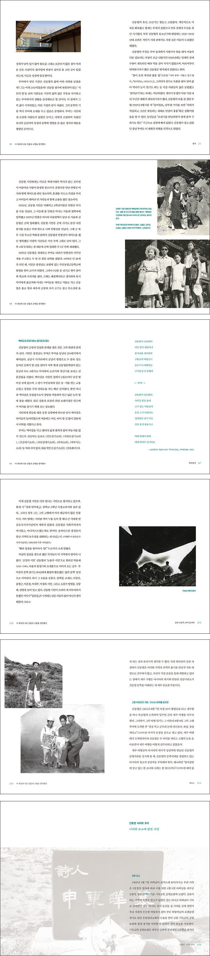부여시대 생가-자연의 아들로 자라난 시인의 고향과 옛집의 체온(김지윤) 금강-시혼의 원류, 민족 역사를 담은 금강(김지윤) 낙화암-내 고향은 강언덕에 있었다(박은미) 백마강가-신동엽 시 구상의 태자리(이지호) 공주 우금치, 부여 곰나라-사랑과 혁명의 시인, 신동엽 「산에 언덕에」(김응교) 서울시대 돈암동-서울아, 너는 조금이 아니었다(맹문재) 명성여고-명성여고 야간부, 국어교사 신동엽(이대성) 서울시청 부근-『아사녀阿斯女』 출판기념회와 서울시청 앞(김진희) 종로5가-종삼의 배경학 ? 신동엽 「종로5가」, 서경식 「종로4가」(김응교) 제주도와 문학관 신동엽이 본 공사장-신동엽 시의 노동과 노동자(최종천) 제주도-신동엽과 아시아, 그리고 제주 여행길(고명철) 신동엽 시비와 묘지-시비와 묘소에 얽힌 사연(신좌섭) 다시 생가와 문학관-신동엽 시인의 부여와 생가 이야기(김형수) |