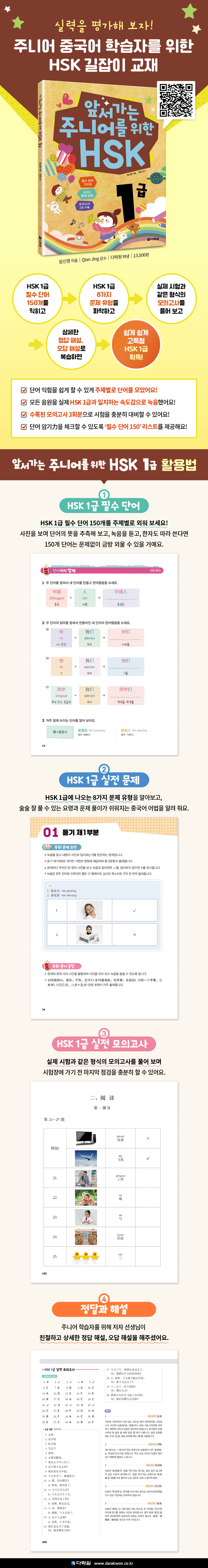 HSK 1급 필수 단어 150개를 주제별로 외워 보세요! 사진을 보며 단어의 뜻을 추측해 보고, 녹음을 듣고, 한자도 따라 쓴 다면 150개 단어는 문제없이 금방 외울 수 있을 거예요. ② HSK 1급 실전 문제 HSK 1급에 나오는 8가지 문제 유형을 알아보고, 술술 잘 풀 수 있는 요령과 문제 풀이가 쉬워지는 중국어 어법을 알려줘요. ③ HSK 1급 실전 모의고사 실제 시험과 같은 형식의 모의고사를 풀어 보며 시험장에 가기 전 마지막 점검하할 수 있어요. ④ 정답과 해설 주니어 학습자를 위해 저자의 친절하고 상세한 정답 해설, 오답 해설을 담았습니다. |