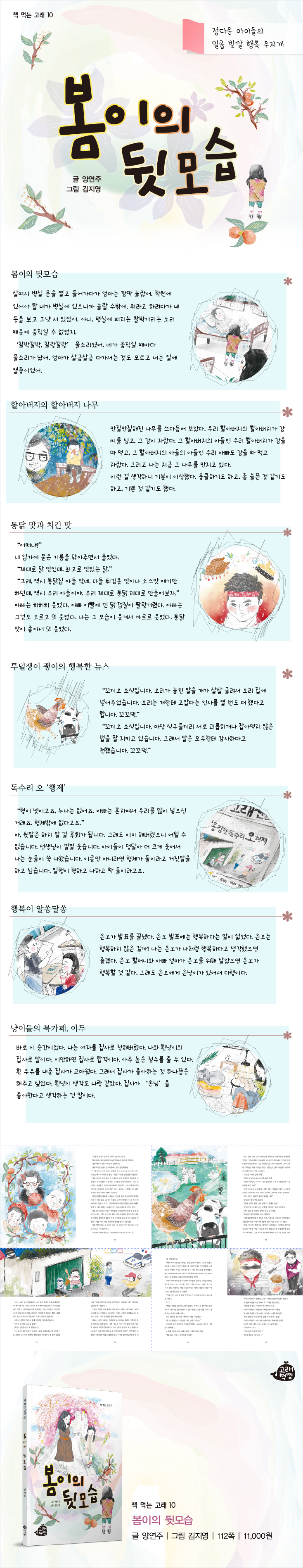 봄이의 뒷모습 / 할아버지의 할아버지 나무 / 통닭 맛과 치킨 맛 / 투덜쟁이 괭이의 행복한 뉴스 / 독수리 오 ‘행제’ / 행복이 알쏭달쏭 / 냥이들의 북카페, 이두 |