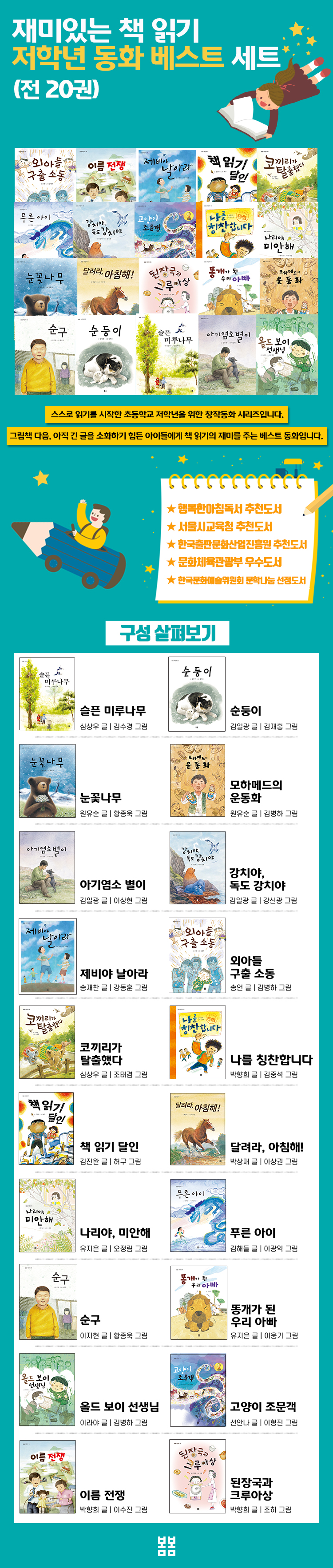 ★ 서울시교육청 추천도서 ★ 한국출판문화산업진흥원 추천도서 ★ 문화체육관광부 우수도서 ★ 한국문화예술위원회 문학나눔 선정도서 책 소개와 저자 소개 1 『슬픈 미루나무』 심상우 글, 김수경 그림 까치 부부가 미루나무에 둥지를 틀었습니다. 그 곁에는 작은 미루나무가 있는데, 일제 강점기 애국지사들이 처형되기 전에 붙잡고 울음을 토해 냈다는 ‘통곡의 미루나무’였습니다. 슬픔 때문에 마음을 닫아 버린 작은 미루나무는 새끼 까치의 탄생으로 비로소 마음을 열고, 오래오래 아버지의 희생을 기억합니다. 2 『순둥이』 김일광 글, 김재홍 그림 짖지도 않는 순한 개 순둥이가 새끼를 낳았습니다. 어미의 보살핌을 받으며 새끼들은 무럭무럭 자랐고, 개를 더 키울 수 없는 형편에 아저씨는 강아지들을 다른 집으로 보냅니다. 막내마저 보내던 날, 순둥이는 하늘을 바라볼 뿐입니다. 강아지들의 눈빛, 얼굴 표정이 살아 있는 일러스트와 따뜻한 글이 감동을 줍니다. 3 『눈꽃나무』 원유순 글, 황종욱 그림 ‘작은이’는 외딴집 누에방에 사는 집누에입니다. 하루하루 배불리 먹고 어서 자라, 고치를 지어 사람들에게 실을 내주어야 합니다. 하지만 작은이에게는 날개를 단 나방이 되어 하늘을 훨훨 날고 싶다는 꿈이 있습니다. 그래서 작은이는 꿈을 이루기 위해 주어진 삶을 버리고 자신만의 삶을 찾아 누에방을 떠납니다 4 『모하메드의 운동화』 원유순 글, 김병하 그림 우리나라에 사는 석이가 버린 운동화는 중동으로 보내져 축구 선수를 꿈꾸는 모하메드의 운동화가 됩니다. 하지만 모하메드는 고철을 줍다가 폭탄이 터지는 바람에 한쪽 다리, 운동화 한 짝, 꿈까지 모두 잃어버립니다. 꿈꿀 자유마저 빼앗는 전쟁이 얼마나 잔혹한지를 일러 주면서 평화의 소중함을 일깨워 줍니다. 5 『아기염소 별이』 김일광 글, 이상현 그림 별이 아저씨의 아버지는 전쟁 때 북으로 가고, 엄마는 세월이 흐를수록 아버지에 대한 그리움이 점점 커져 아기가 되어 버립니다. 바다로 나가고 싶어 하는 엄마를 다른 사람의 배에 태우고 바다로 나갔다가 아저씨는 마을 사람들의 오해를 삽니다. 세상에 대한 원망도 외로움도, 사람을 향한 그리움과 버무려져서 아름답게 펼쳐집니다. 6 『강치야, 독도 강치야』 김일광 글, 강신광 그림 강치는 독도를 중심으로 동해에 살던 바다사자입니다. 이 책은 일제 강점기 때 멸종 상태에 놓였다가 1970년대 사라져 버린 안타까운 생명, 강치들의 이야기입니다. 어린 강치인 아라가 독도 앞 가재바위에서 무리와 함께 살아가던 어느 날 죽은 강치들이 줄줄이 떠내려 오더니, 총과 창을 든 사냥꾼들이 들이닥칩니다. 7 『제비야 날아라』 송재찬 글, 강동훈 그림 새 건물이 완성되면 곧 헐리게 될 학교 건물에 제비 부부가 둥지를 짓고 알을 낳습니다. 전교생의 사랑과 관심 속에 새끼 제비들은 무럭무럭 자라납니다. 그러나 제비 둥지는 헌 건물과 함께 헐리게 될 위기에 놓입니다. 소중한 생명을 지키기 위해 아이들은 마음을 모으고, 끝내 현장 소장의 마음을 움직입니다. 8 『외아들 구출 소동』 송언 글, 김병하 그림 외아들 창수는 집에서는 왕자님이고, 학교에서는 싸움대장입니다. 아들을 사랑하는 부모님의 전폭적인 응원 아래 씩씩함이 지나쳐 기고만장해서는 친구들을 때리고 괴롭히는 데 앞장섰지요. 그런 창수가 형들에게 얻어맞았다며 엉엉 우네요. 잔뜩 흥분한 아빠는 창수 집단 폭행 사건을 응징하기 위해 학교로 쳐들어오는데…… 9 『코끼리가 탈출했다』 심상우 글, 조태겸 그림 드넓은 라오스의 초원에서 자유롭게 풀을 뜯어 먹고 살던 여섯 코끼리 친구들은 갑작스레 나타난 사냥꾼들에게 붙잡혀 공연단에 팔려 갑니다. 그리고 낯선 한국 땅으로 와서 재주를 부리며 하루하루를 살아갑니다. 여섯 친구들은 본능적으로 코끼리다운 일을 하고 싶어 합니다. 코끼리다운 삶이란 무엇일까요? 10 『나를 칭찬합니다』 박향희 글, 김중석 그림 사람들은 늘 결과만 봅니다. 그동안 들인 정성과 노력을 알아보지 못하지요. 그러나 내 인생의 주인공은 바로 ‘나’입니다. 세상이 어떻게 평가를 하든, 조금 느리더라도 한발한발 세상을 향해, 역사를 향해 나아갈 것입니다. 언제나 최선을 다해 열심히 사는 것, 그것이 평범한 내가 내 인생을 멋지게 살아가는 방법입니다. 11 『책 읽기 달인』 김진완 글, 허구 그림 어른들은 매일 책 좀 읽으라고 난리입니다. 그런데 책은 게임처럼 신나지도 않고, 만화처럼 즐겁지도 않고, 집중해 보려고 해도 무슨 말인지 도통 모르겠어요! 세상에서 가장 재미있는 것이 ‘책 읽기’라고 말하는 작가는 책을 싫어하는 친구를 위해 이 책을 썼다고 하니, 이 책을 읽어 보세요. 정말로 책 읽기가 즐거워질 거예요 12 『달려라, 아침해!』 박상재 글, 이상권 그림 미국 버지니아주에는 금방이라도 달려갈 듯한 말 동상이 있습니다. 그의 이름은 조일(朝日) 순우리말로 아침해라는 뜻이었습니다. 아침해는 전쟁에 투입돼 영웅이 되지만, 하루빨리 전쟁이 끝나기를 바랐습니다. 작가는 이 책을 통해 어린이들이 아침해처럼 꿈을 잃지 말고 살아가기를 바랍니다. 13 『